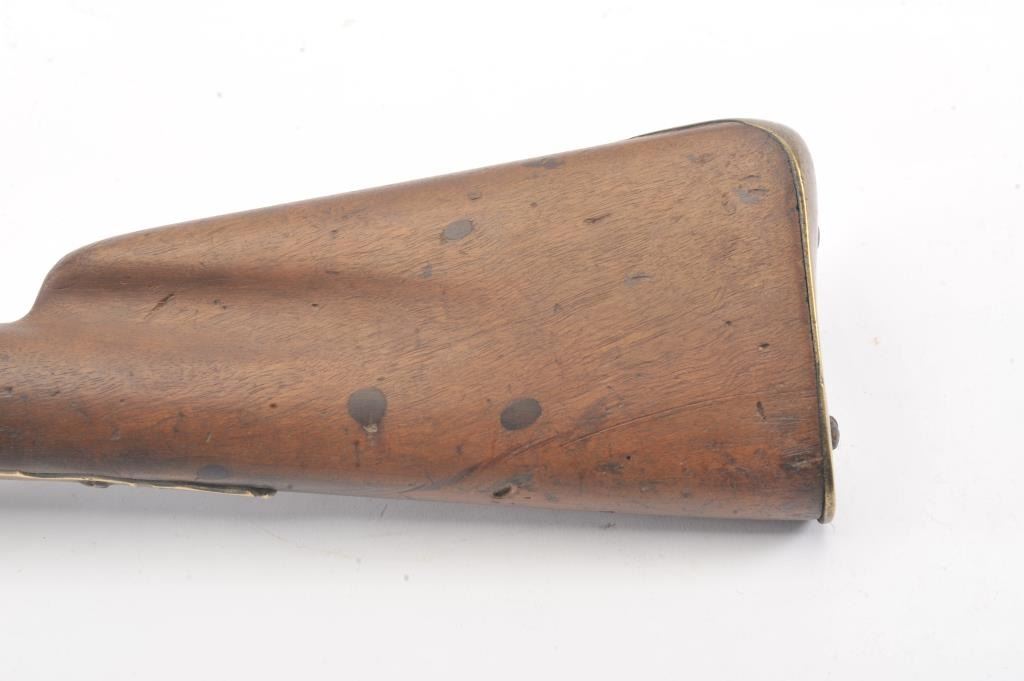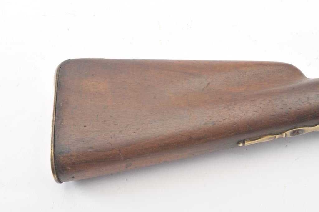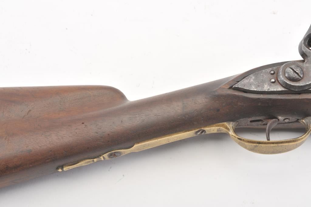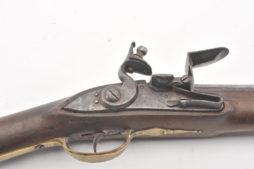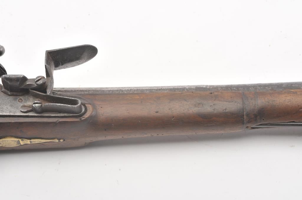 Southern European flintlock blunderbuss with hall marked iron barrel and early lock circa 1720-1760. Measures 31 1/2" overall with a 16 1/2" iron barrel flaring to 1 1/2" across the inside dimensions of muzzle with thickwalls and cannon ring at the mouth. Deep and well struck mark of angel or lady with bow and indecipherable maker's mark that shows crown and is likely Spanish or possibly Italian. Simple brass mounts with lightengraving on the side plate. Period ramrod. The action works well. The stocks are good with minor losses and imperfections. Light to heavy pitting on the barrel. A nice and early blunderbuss. (Antique) Est.:$1200-$1800