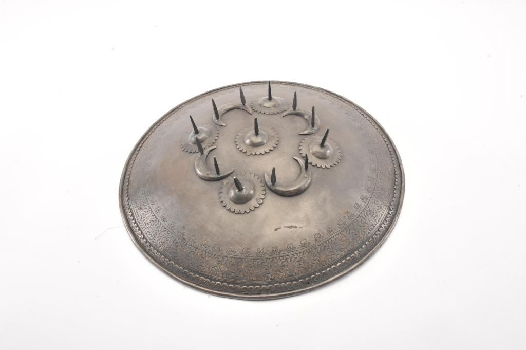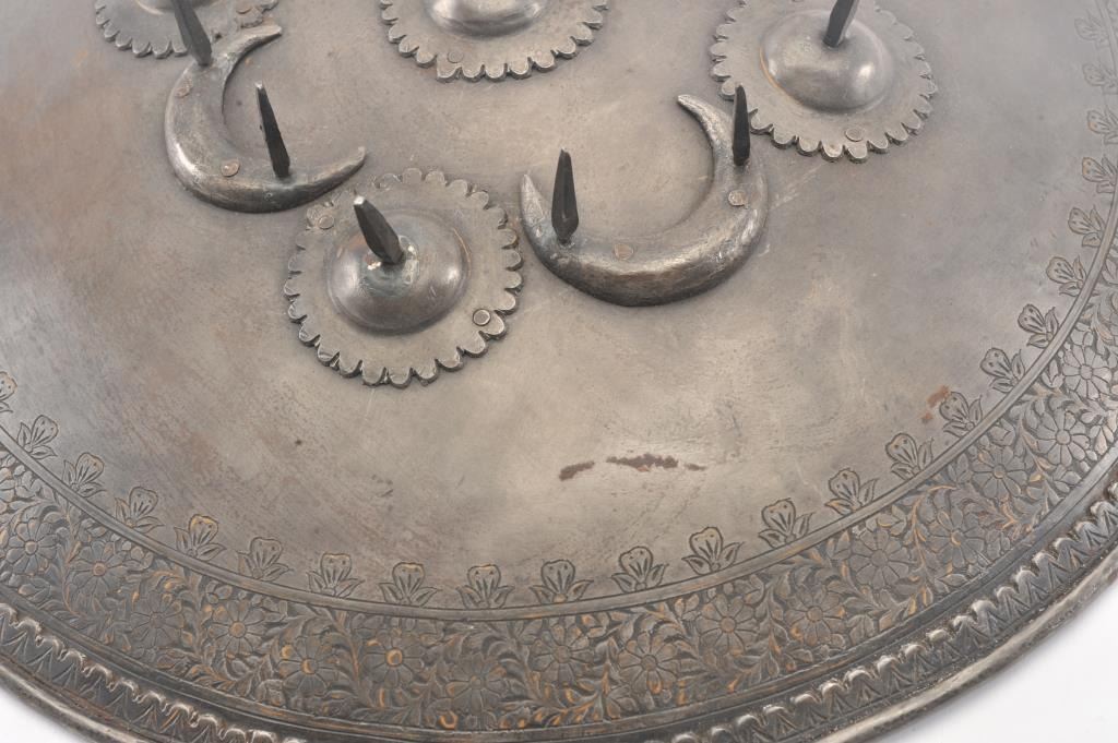 Indo-Persian fighting shield with 13 spike protruding from round bosses and half-moon decorations. Etched floral borders. Measures 18" across center. Line back with hand grip retained. Late 19th to early 20th century.Est.: $500-$1000
