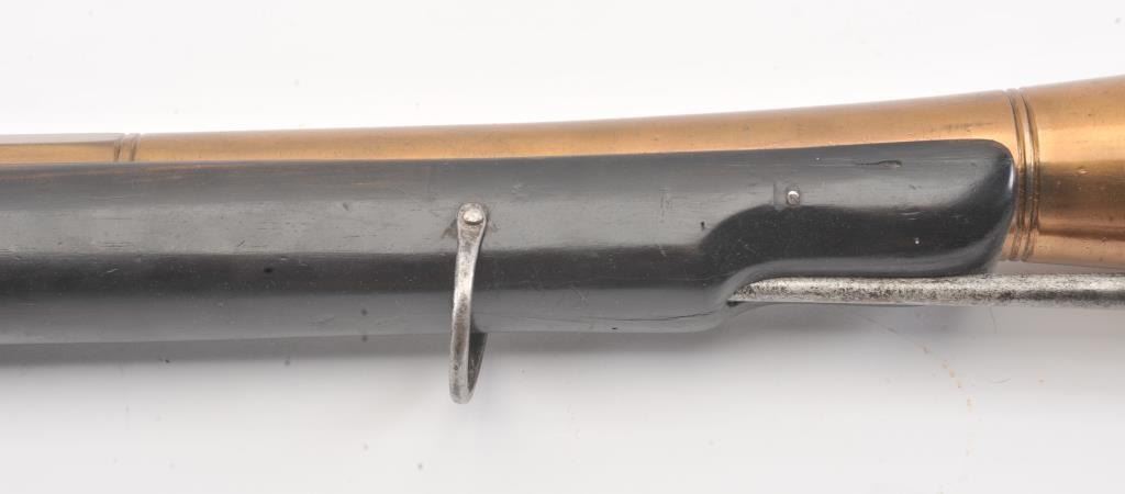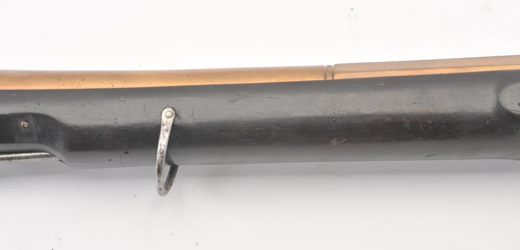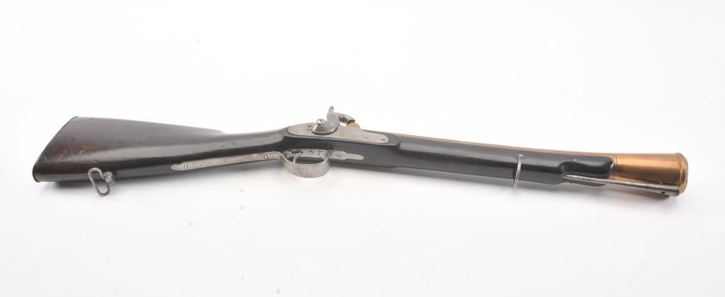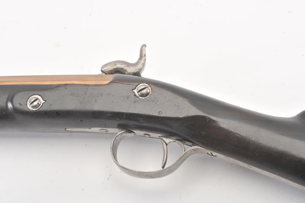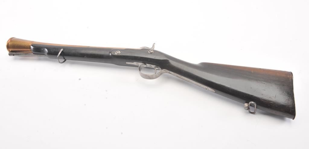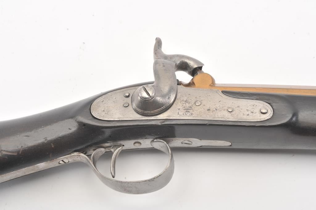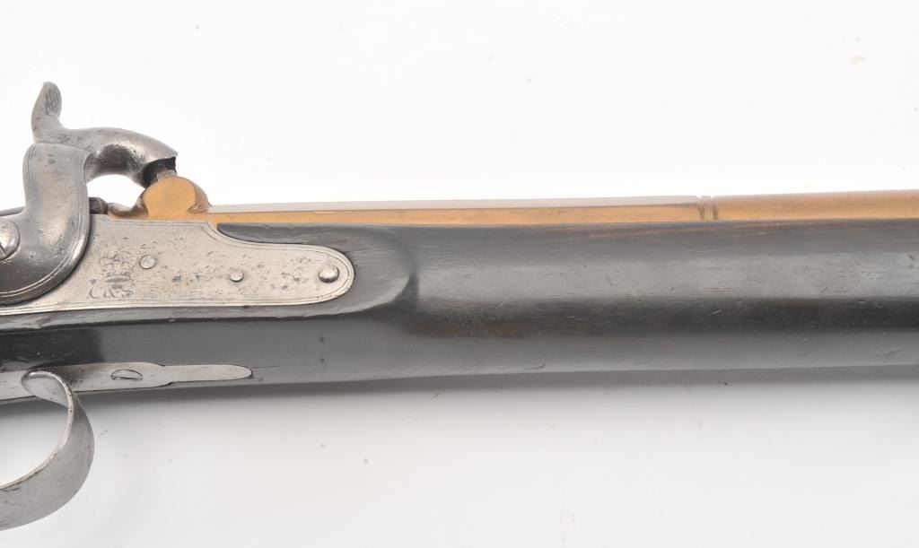 Mid-19th century blunderbuss marked "C" and "S" on the lock with crown and London in script on brass cannon mouth barrel. Iron mounts with swivels and no proofs on the barrel. Measures approximately 32 1/2"overall with a 17" barrel that flares to approximately 1 1/2" across the inside dimension of muzzle. The metal shows minor pitting but good to very good overall with light refinishing to wood and working action. Probably Navy or sea service use. (Antique) Est.: $600-$1200