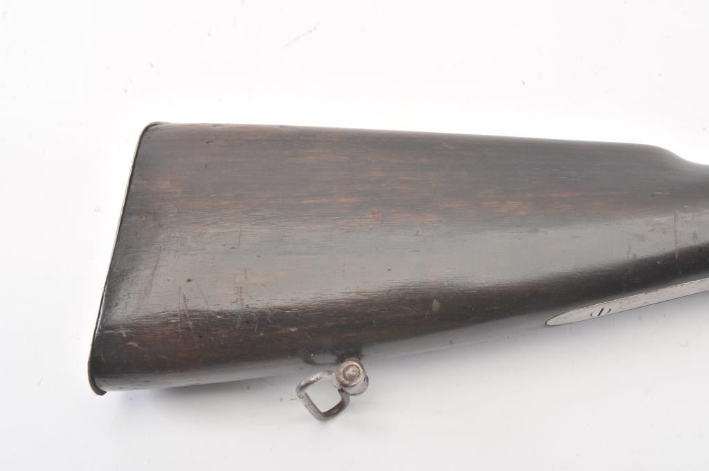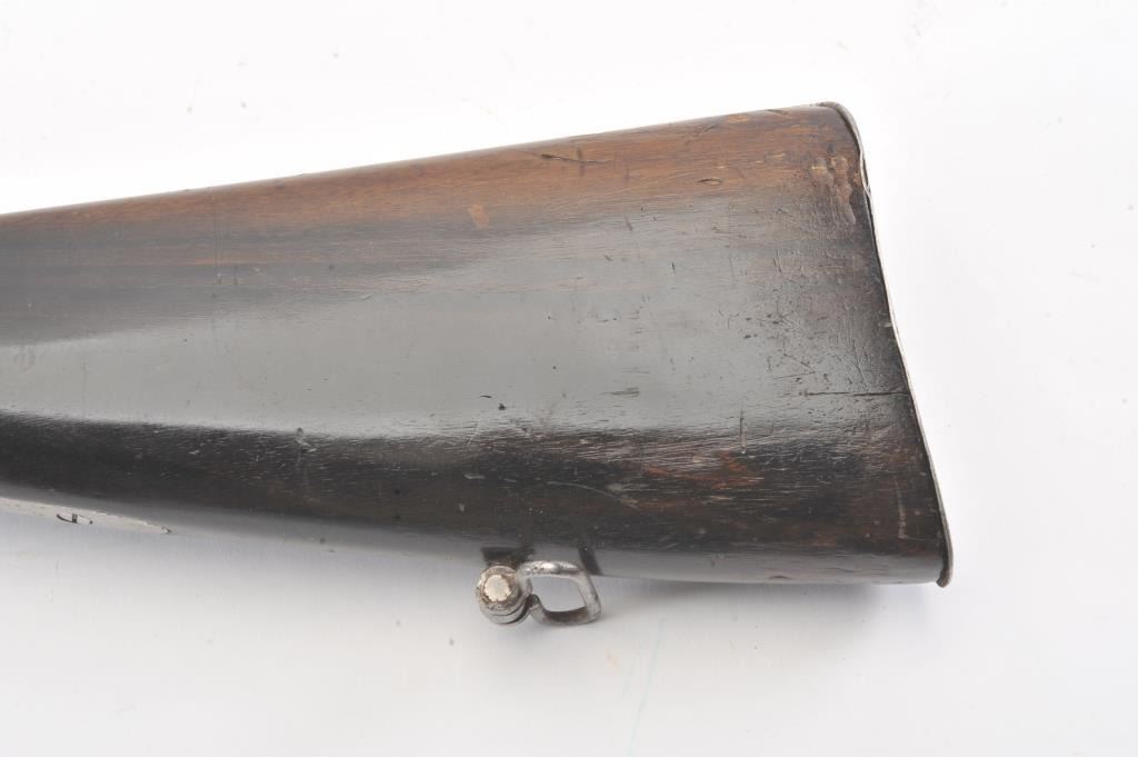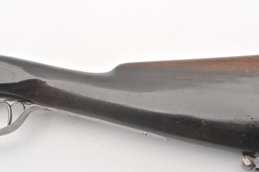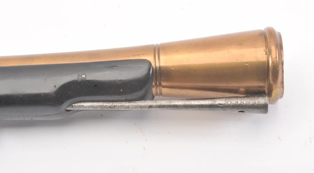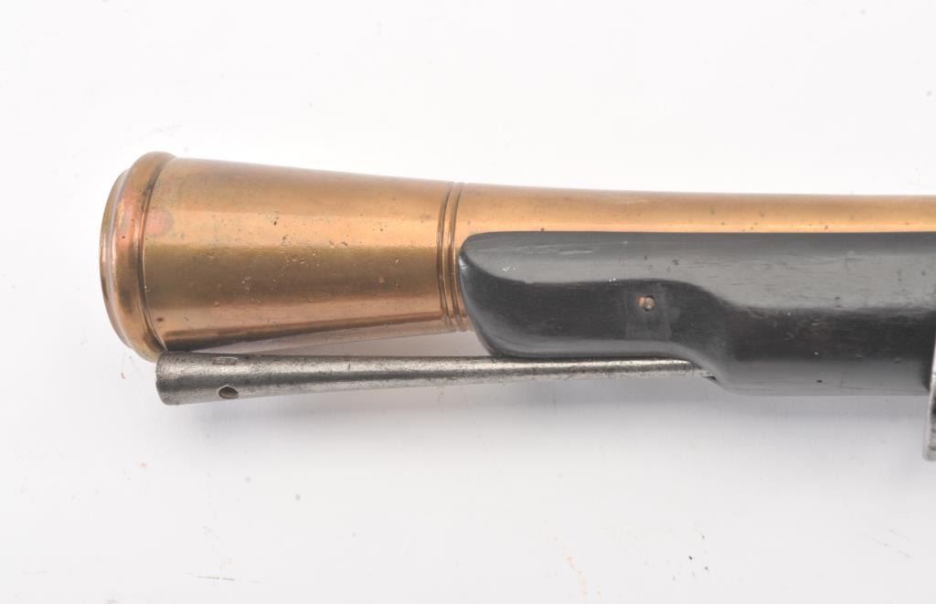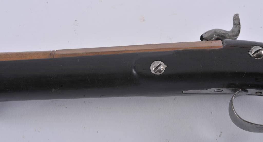 Mid-19th century blunderbuss marked "C" and "S" on the lock with crown and London in script on brass cannon mouth barrel. Iron mounts with swivels and no proofs on the barrel. Measures approximately 32 1/2"overall with a 17" barrel that flares to approximately 1 1/2" across the inside dimension of muzzle. The metal shows minor pitting but good to very good overall with light refinishing to wood and working action. Probably Navy or sea service use. (Antique) Est.: $600-$1200