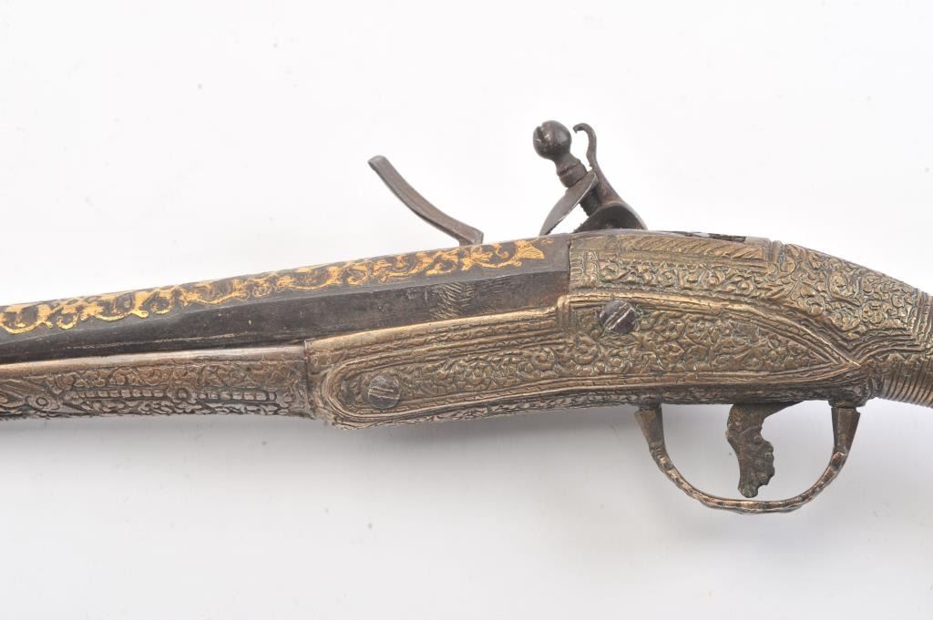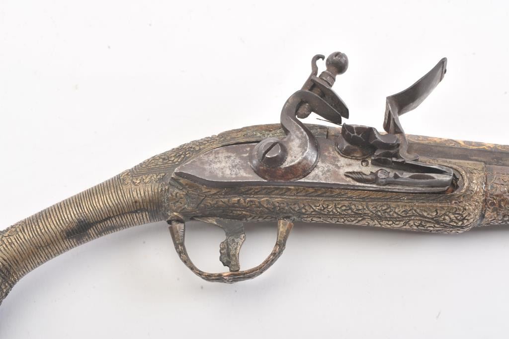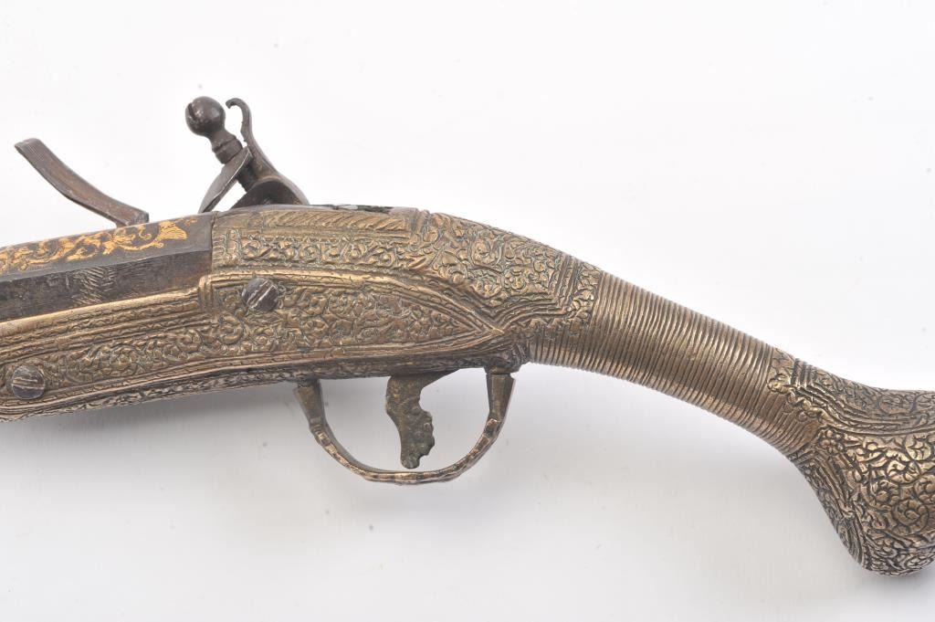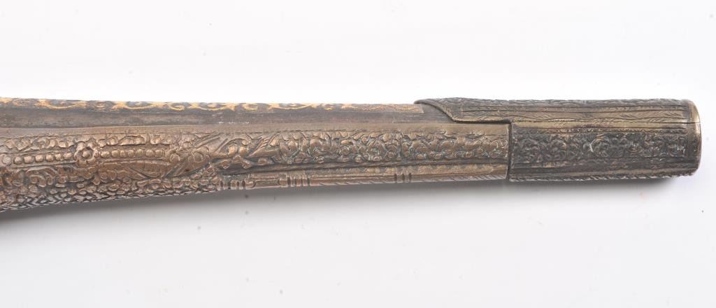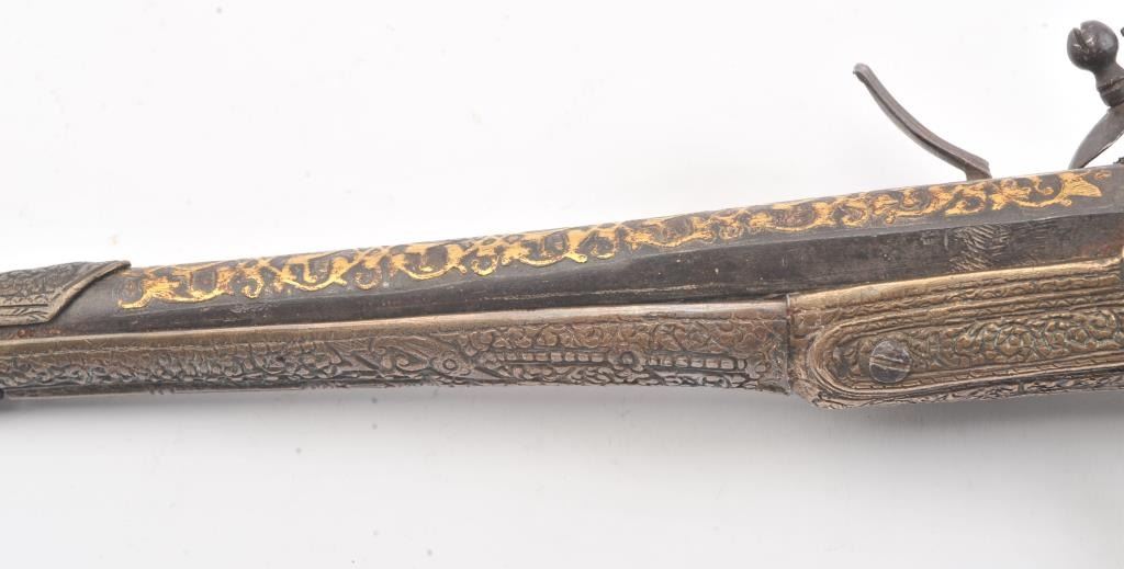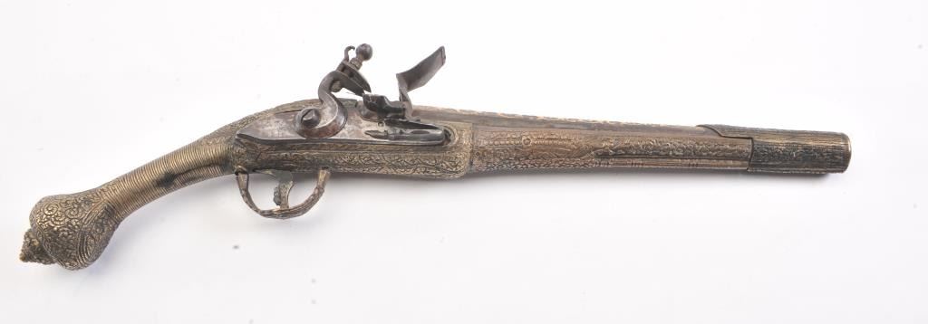 Ornate Baltic or Mid-Eastern flintlock pistol with cast silver colored metal stock and ornately gold inlaid barrel. Good European style lock with faceted pan circa 18th century to early 19th. Measures 19 1/2"overall with a 12" barrel of approximately .69 caliber. The stock shows and old repair. The lock works well and generally good overall. An authentic antique that is of higher grade than normally found. (Antique)Est.: $500-1000