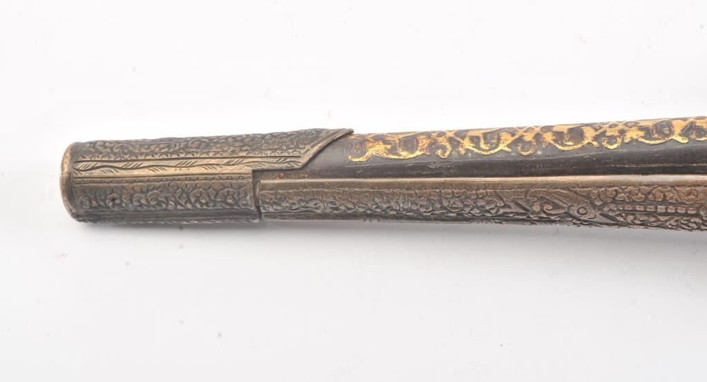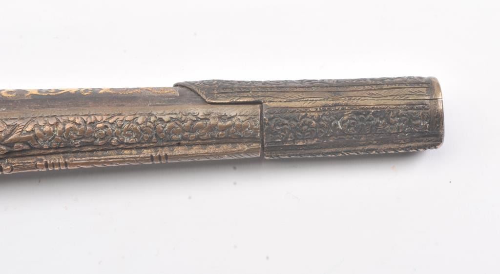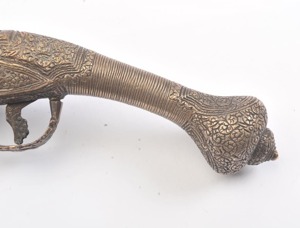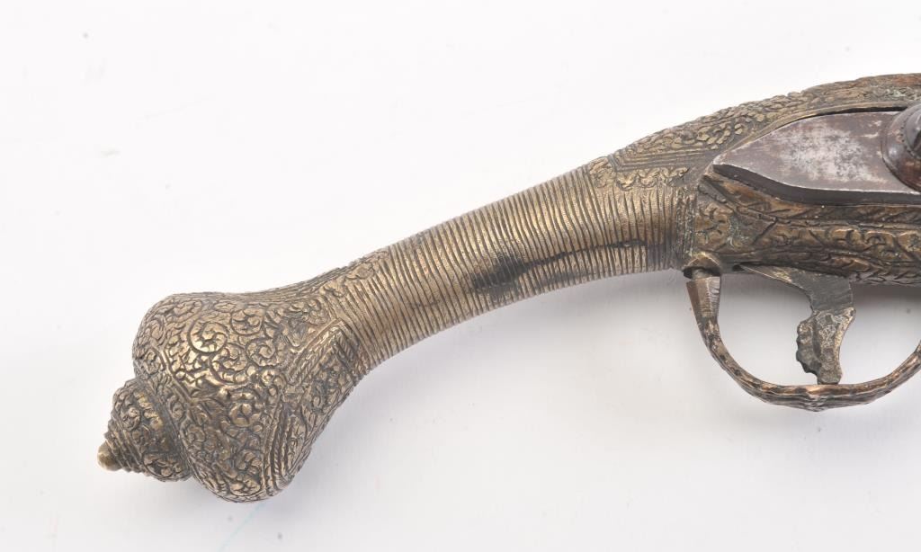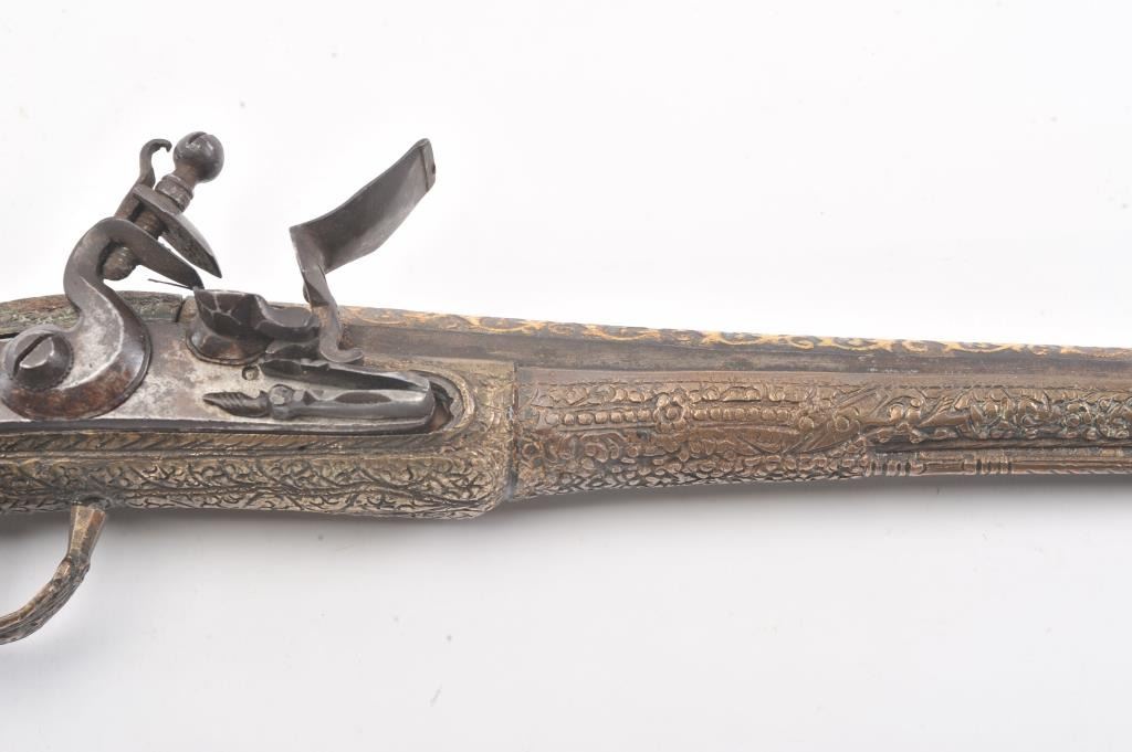 Ornate Baltic or Mid-Eastern flintlock pistol with cast silver colored metal stock and ornately gold inlaid barrel. Good European style lock with faceted pan circa 18th century to early 19th. Measures 19 1/2"overall with a 12" barrel of approximately .69 caliber. The stock shows and old repair. The lock works well and generally good overall. An authentic antique that is of higher grade than normally found. (Antique)Est.: $500-1000