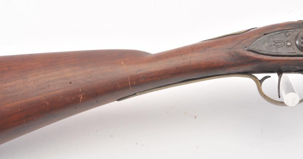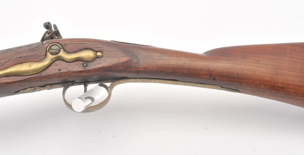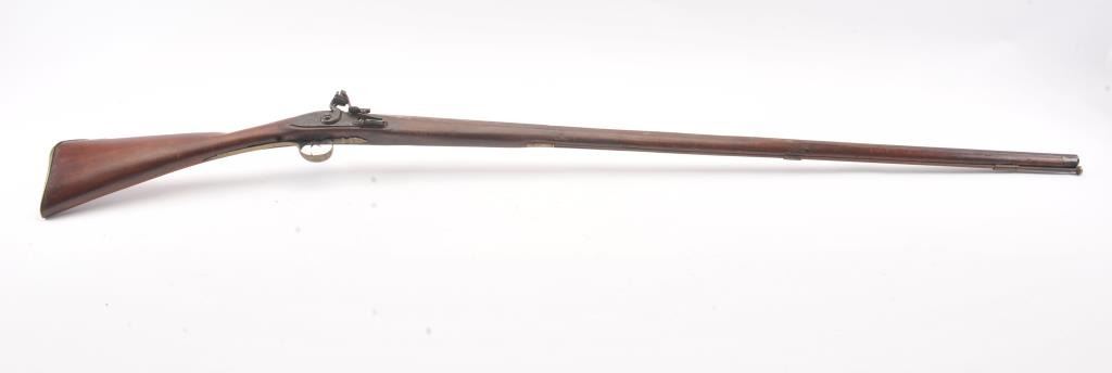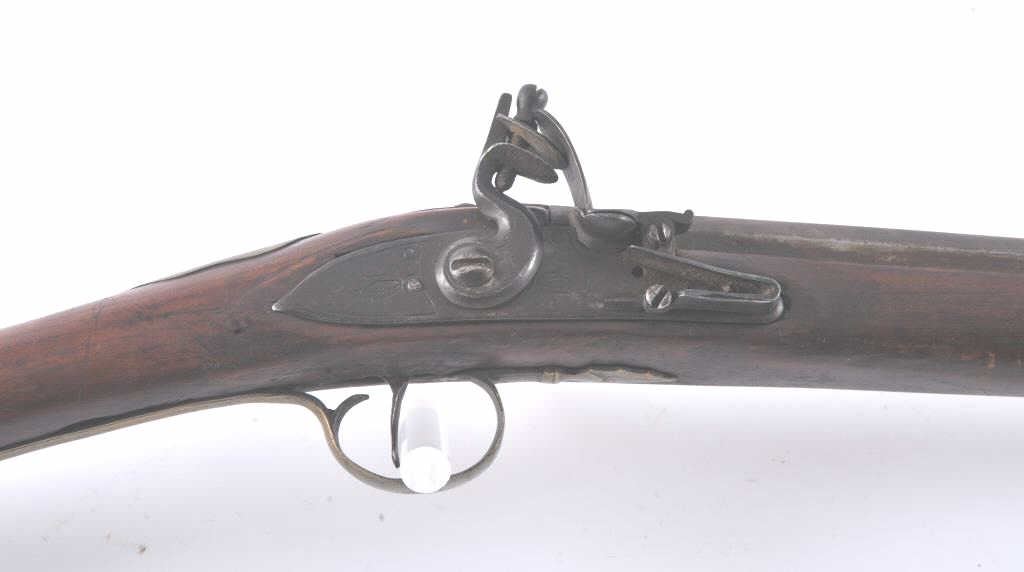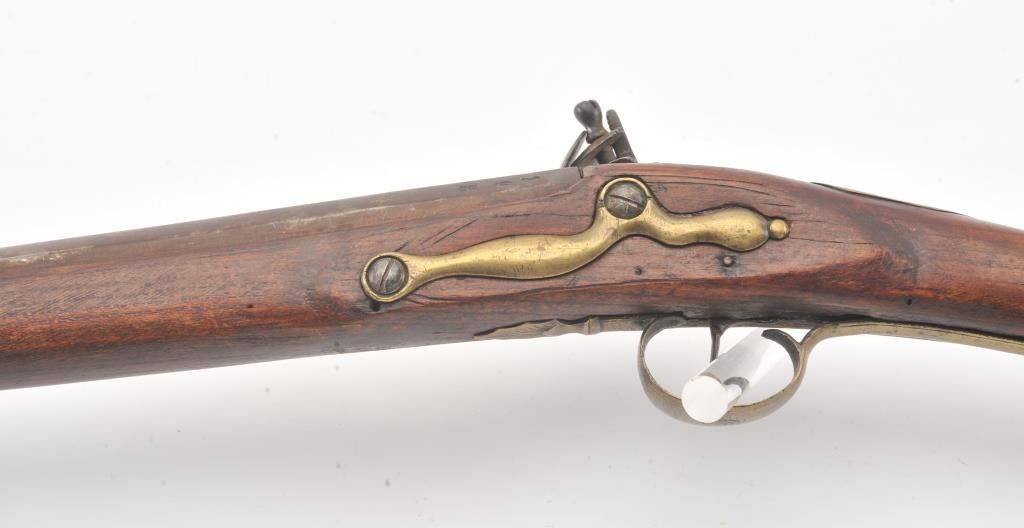 18th century flintlock musket with British proofs and simple floral engraving on the lock. Plain military style mounts with "S" shaped 2 screw brass side plate of style circa 1770-80s. Hand carved stock probablyAmerican with reddish color. Octagon shaped at rear of breech. The lock works but not perfectly. Small losses along the edges of the stock but wood generally good to very good. Measures 64" overall with a 48" barrel. In approximately .69-.70 caliber smoothbore. Period ramrod. An interesting American used arm. (Antique) Est.: $500-$1000
