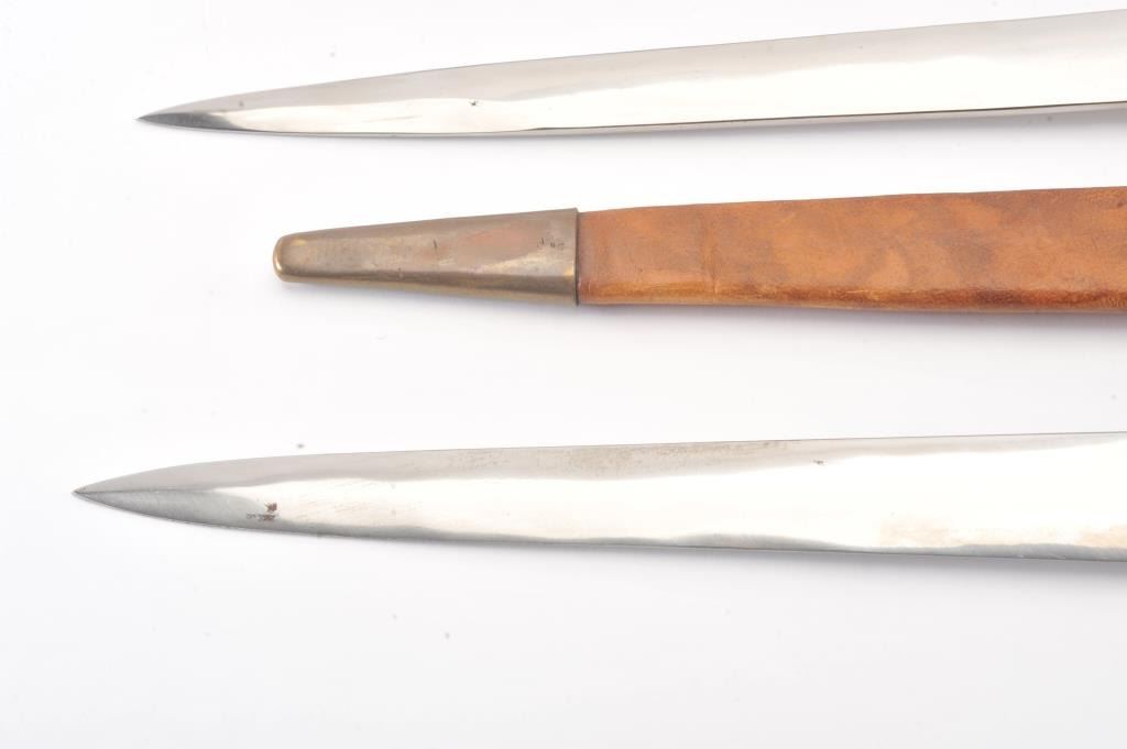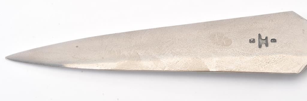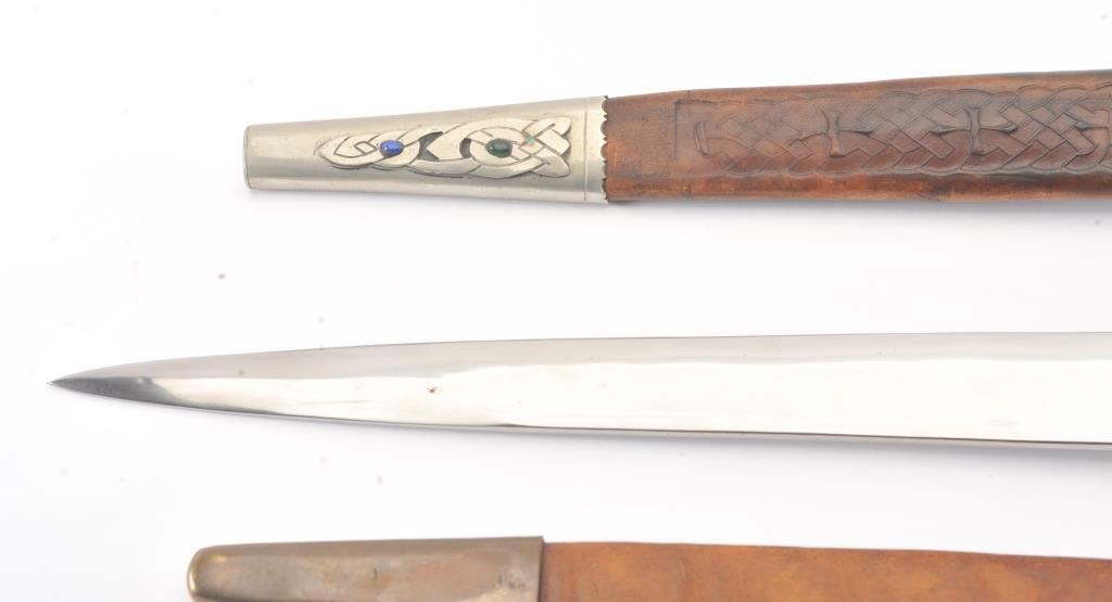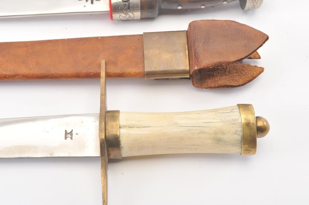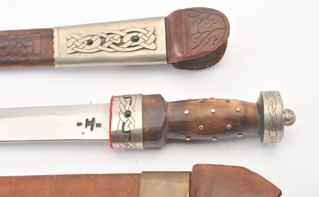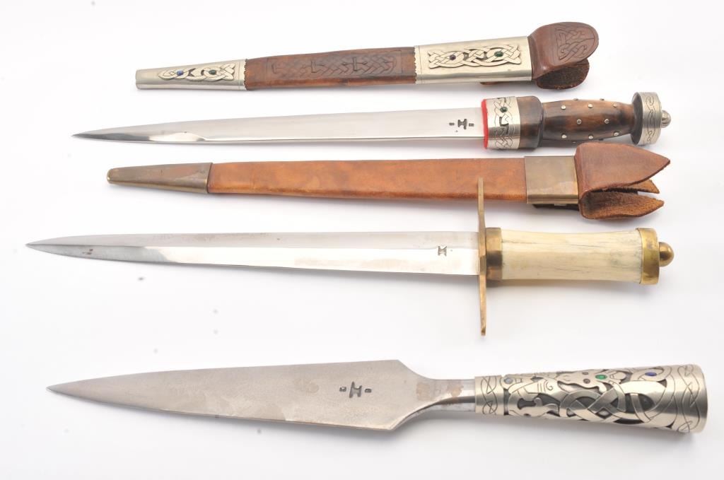 Lot of three handmade re-enactor arms by well-known maker, Kirby Wise. The lot includes: A. A Celtic spear head with silver colored metal and fancy faux jewels measuring 17 ½”overall with a 12” head. The blade is signed with his mark. B. Highland dirk with fancy silver colored metal and faux jewels. The decorated scabbard is 21 ½” in total length with a 15”signed blade with the maker’s mark. C. Hunting sword in 18th Century Germanic style with stag grip. The blade is signed and marked. Est.: $300-$600.