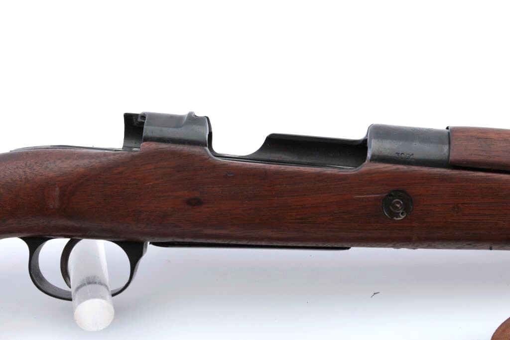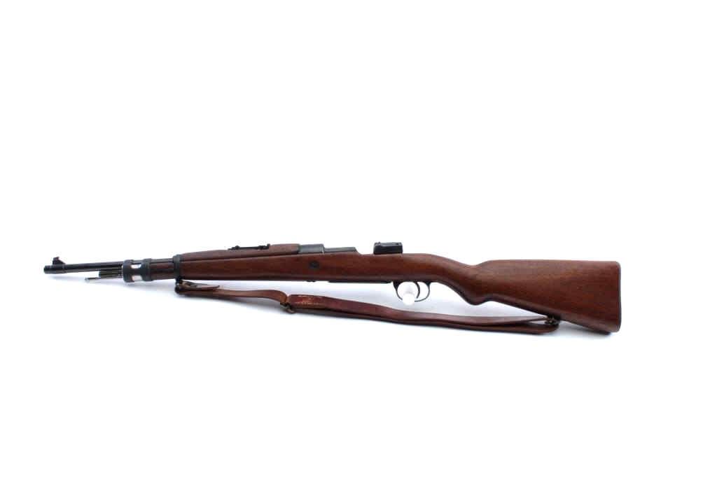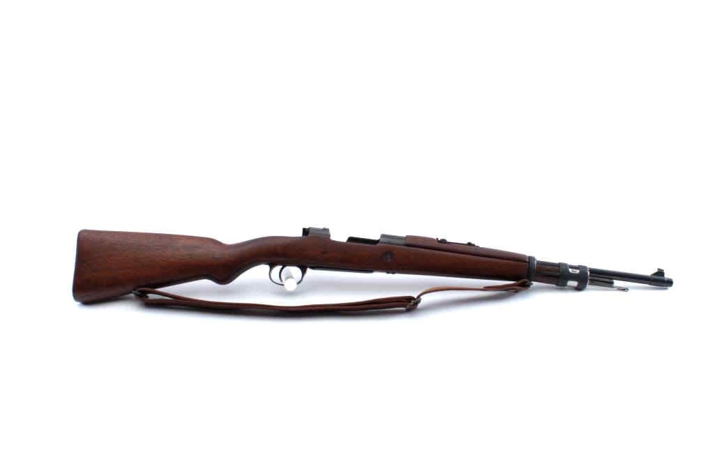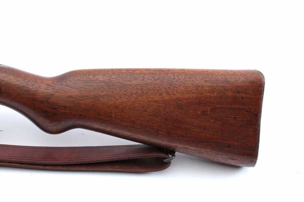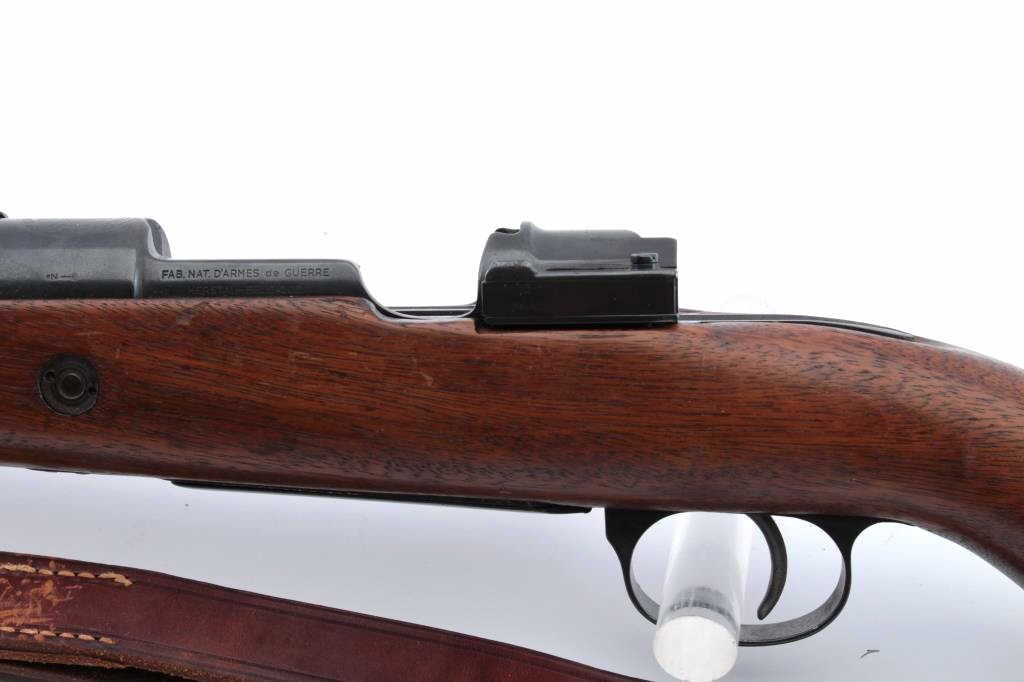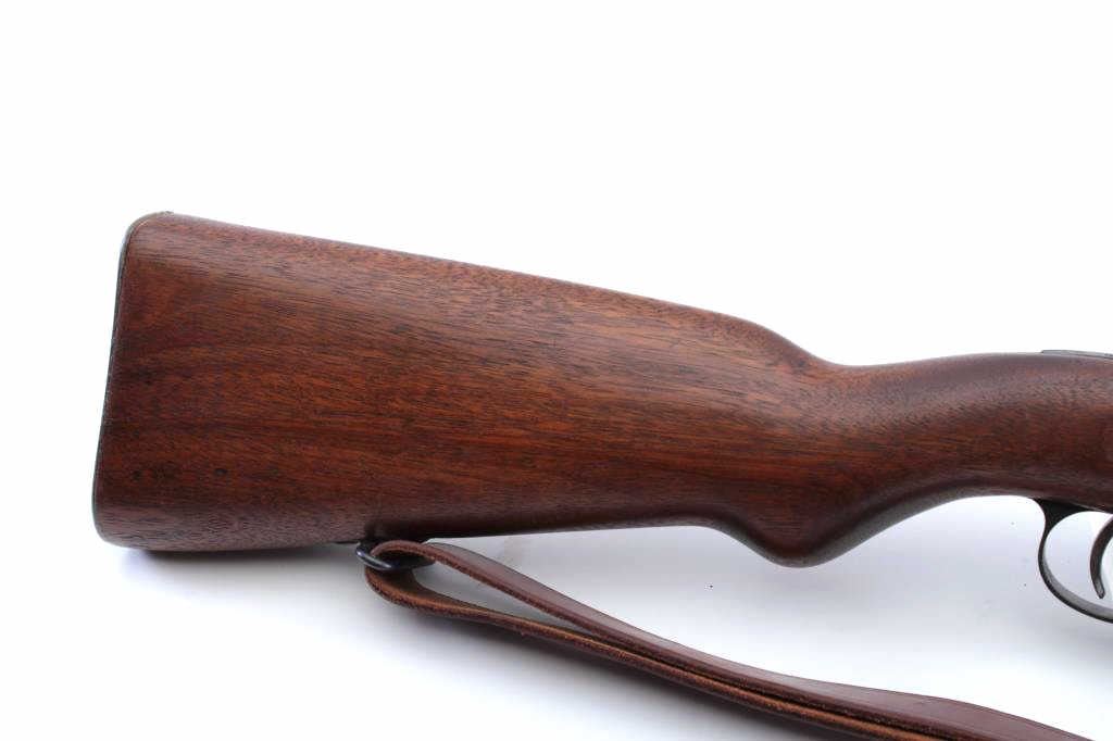 Belgian Model 24 bolt action carbine with Columbian Crest on top of receiver, import-marked, MISSING BOLT, 18.5” barrel, blued finish, wood stock, modern leather sling, S/N 3091; overall good condition withgood wood stock, majority of blued finish remaining, fair to good bore. (C&R). Est.: $150-$300.
