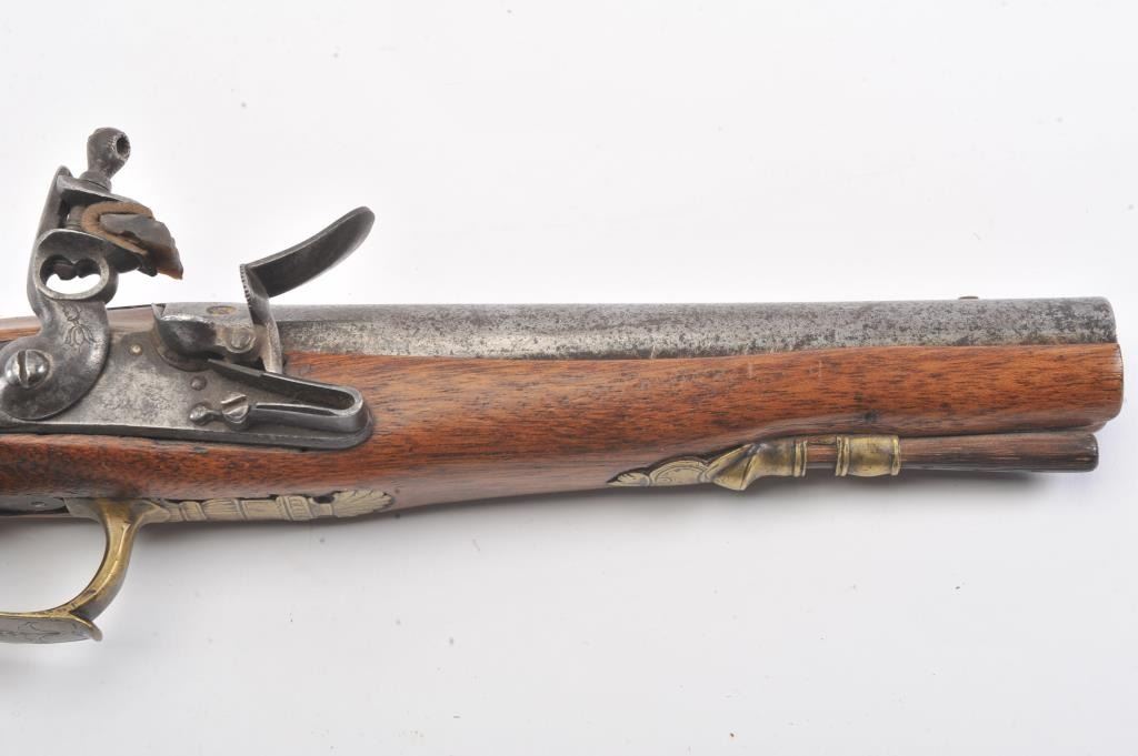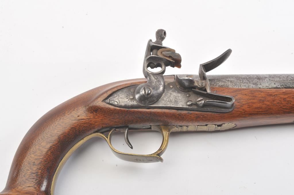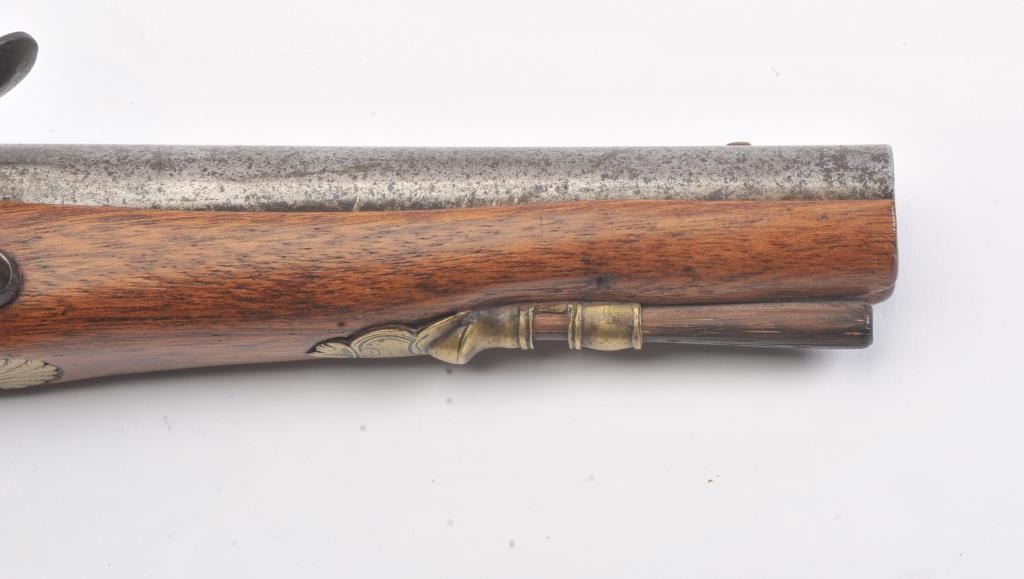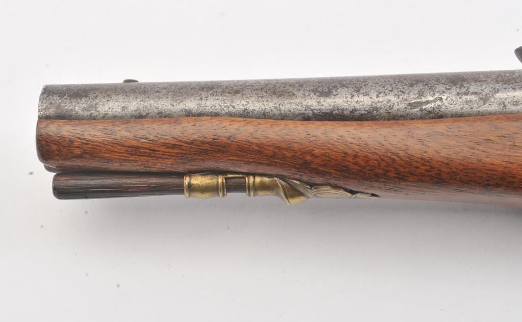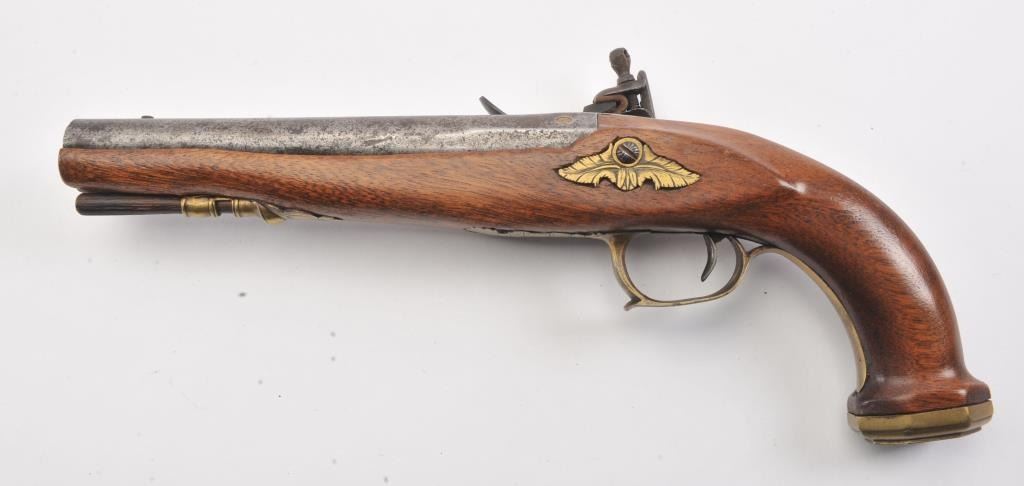 French Empire Period flintlock pistol showing LeClerc proofs and traces of illegible script on the lock. Military style lock with gilt and engraved mounts similar to a Versailles officer’s pistol. The pistol isapproximately .69 caliber and was re-stocked during the period of use with an 8” round barrel with the ramrod retained. The pistol is in good to very good overall condition. Est.: $500-$1,000.