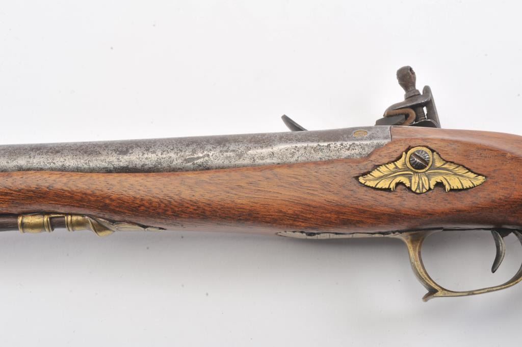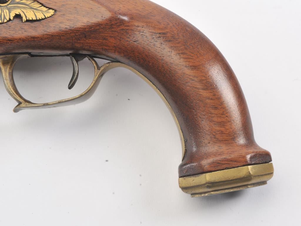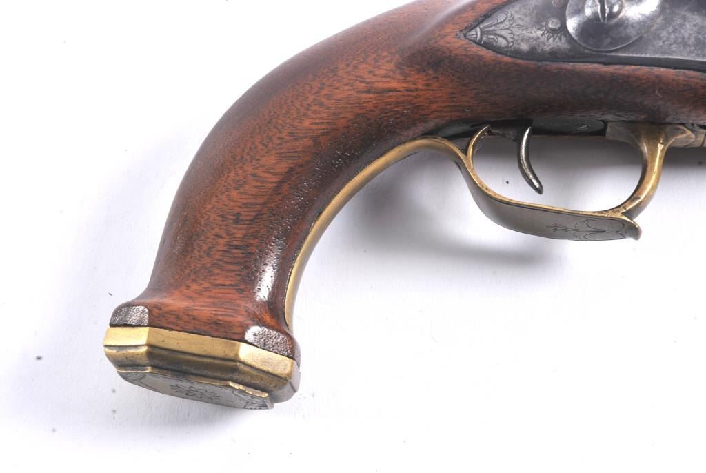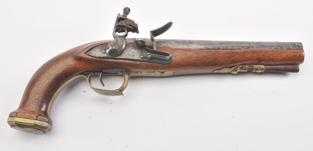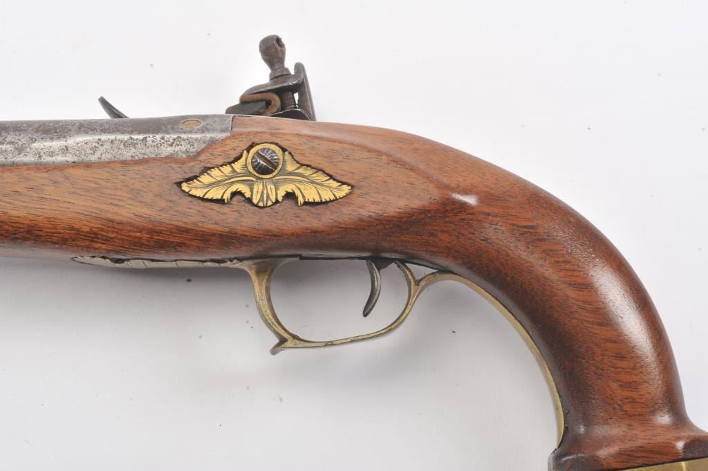 French Empire Period flintlock pistol showing LeClerc proofs and traces of illegible script on the lock. Military style lock with gilt and engraved mounts similar to a Versailles officer’s pistol. The pistol isapproximately .69 caliber and was re-stocked during the period of use with an 8” round barrel with the ramrod retained. The pistol is in good to very good overall condition. Est.: $500-$1,000.