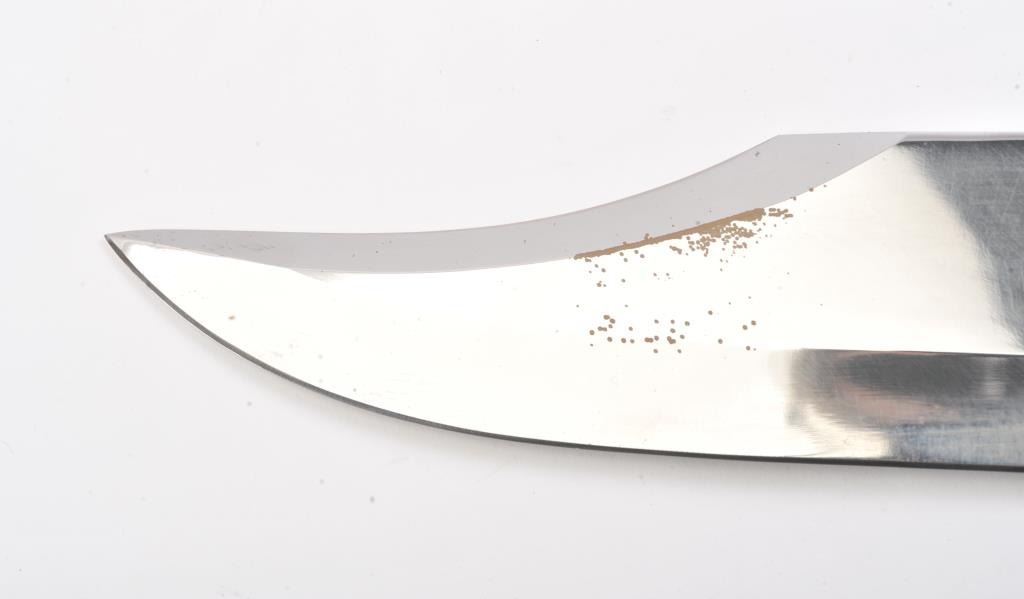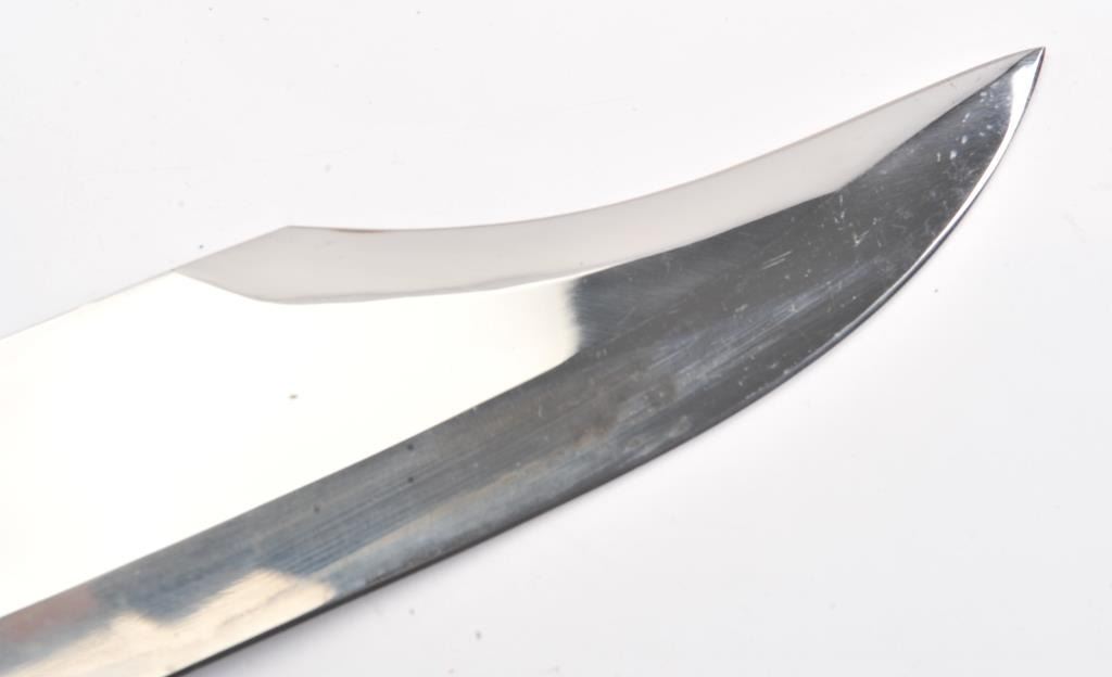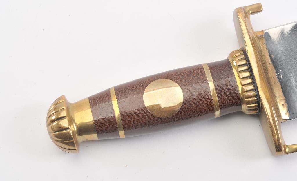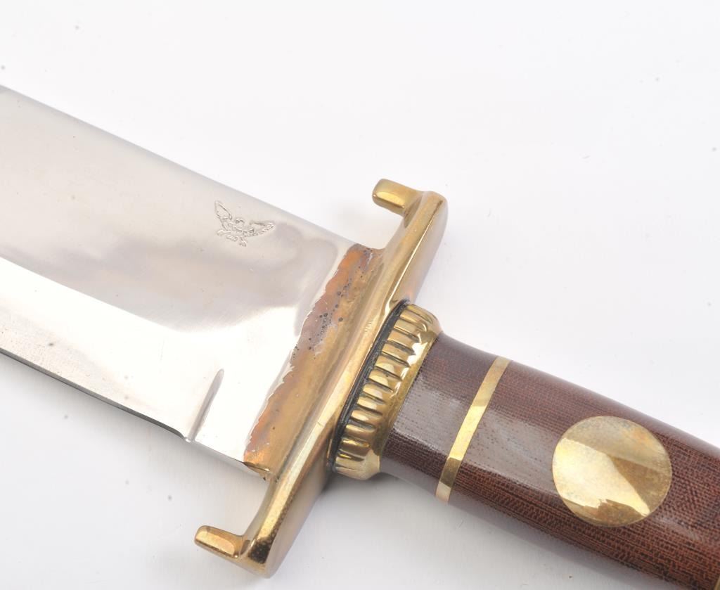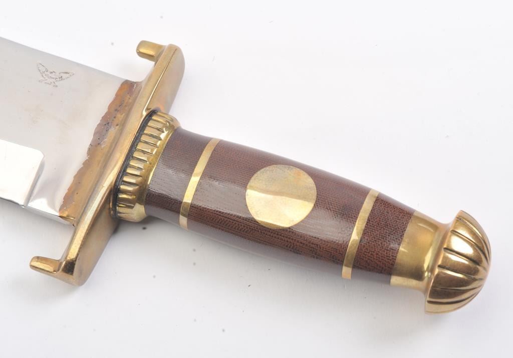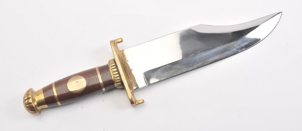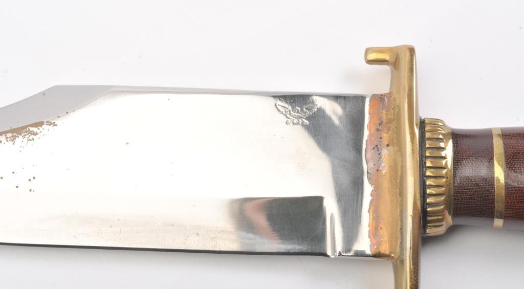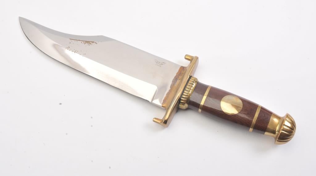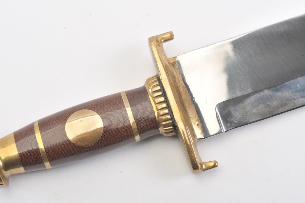 J.N. Cooper “The Iron Mistress” large contemporary bowie knife. The knife is 16” in total length with a 10 ½” saber ground clip point blade marked Cooper in an eagle. The handle is brass and brown Micarta with aheavy brass C-guard, brass escutcheon plate and stylized pommel. The knife is in excellent overall condition with a small amount of oxidation on one side of the blade due to poor storage. According to theconsignor the knife was made as the prototype for the Iron Mistress series by John N. Cooper of Burbank, California. Est.: $600-$1,200.