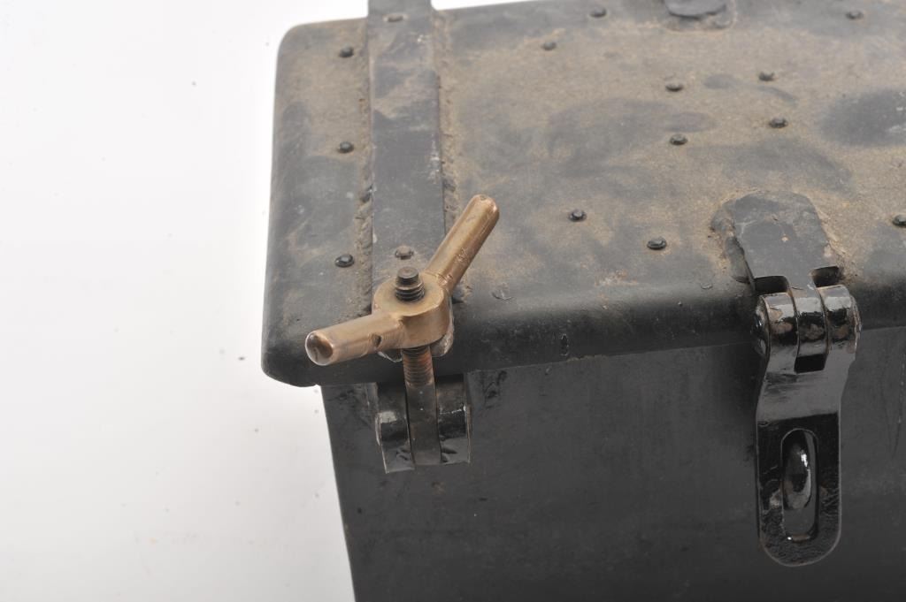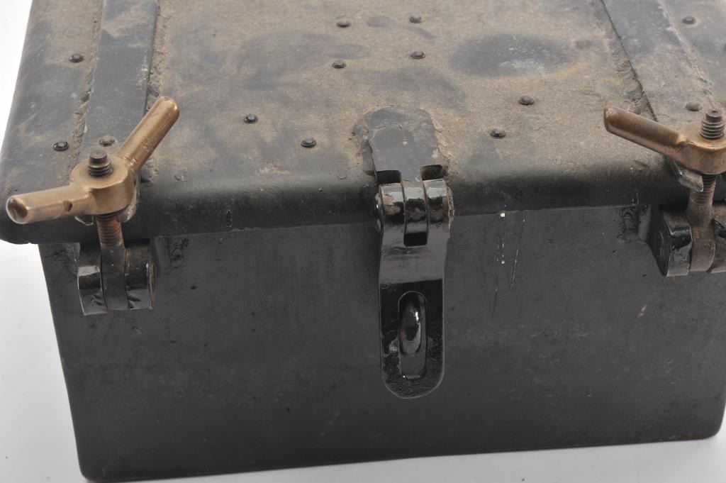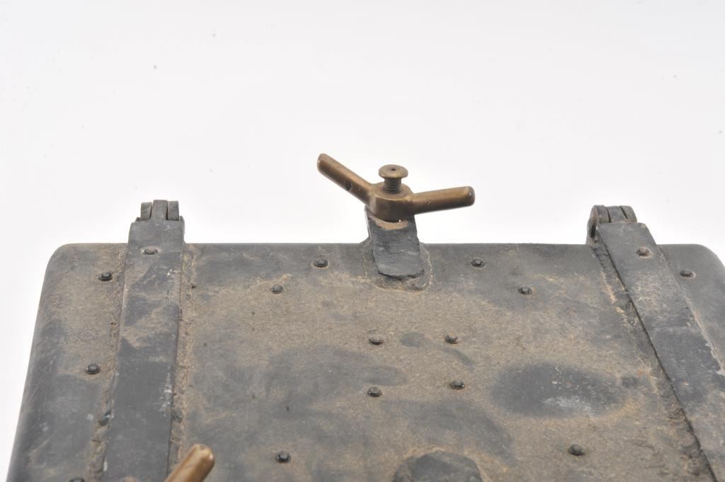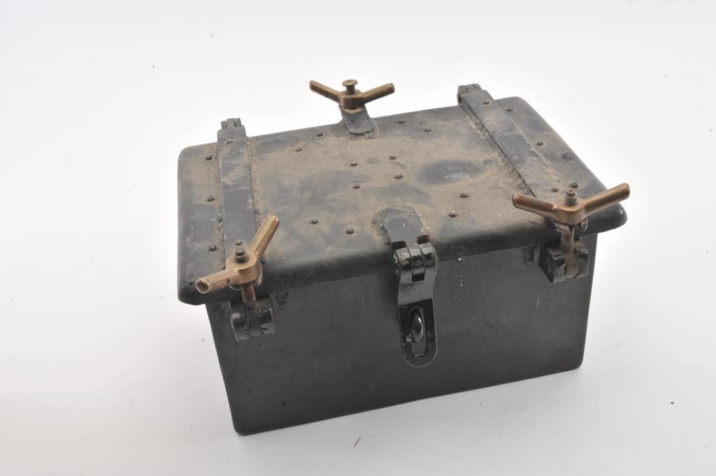 Vintage small iron blasting box; approximately 8” in height, 13” wide and 12” deep with three brass securing bolts; majority of old black paint remains. Est.: $125-$250.