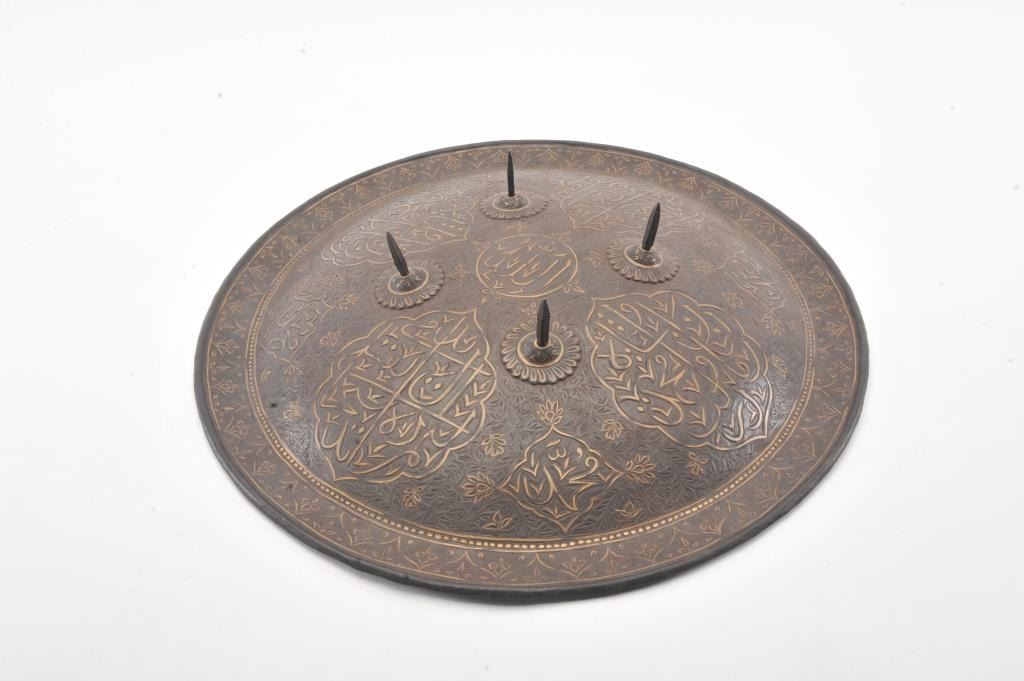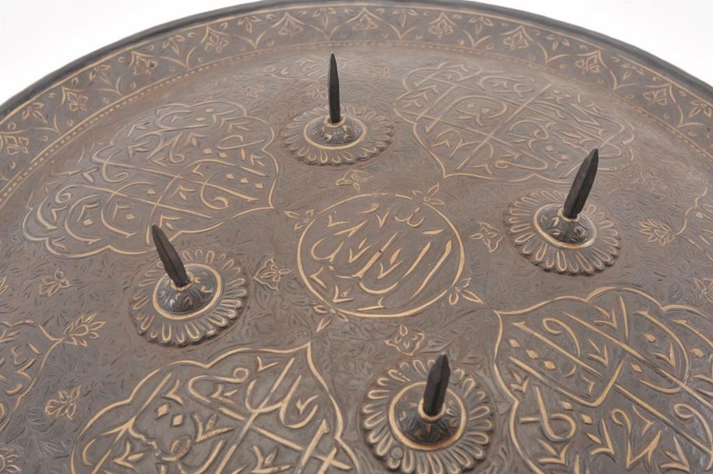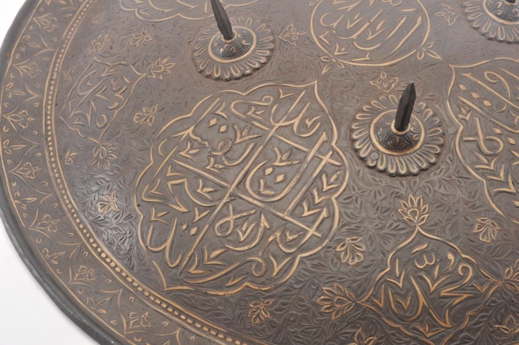 19th century Indo-Persian fighting shield with 4 spikes protruding from round bosses. Etched and engraved with gold lettering that may be a name or place. Measures 20" across the center. Lined back with hand grip. Froman old French collection. Est.: $600-$1200