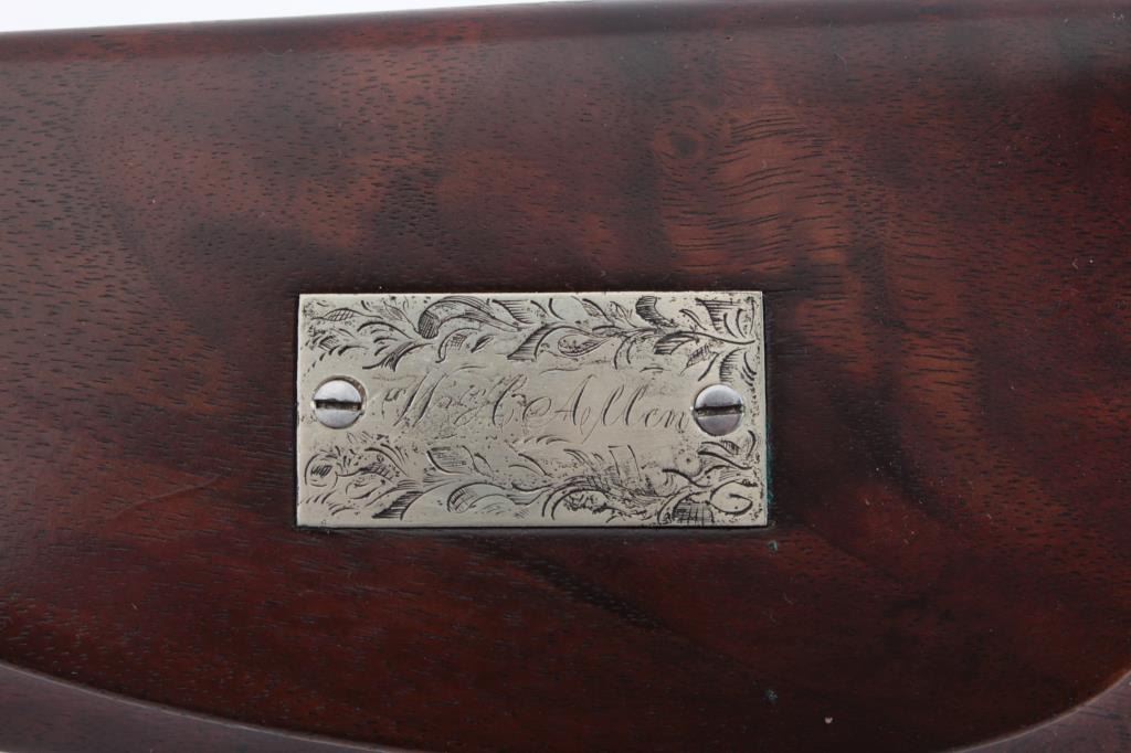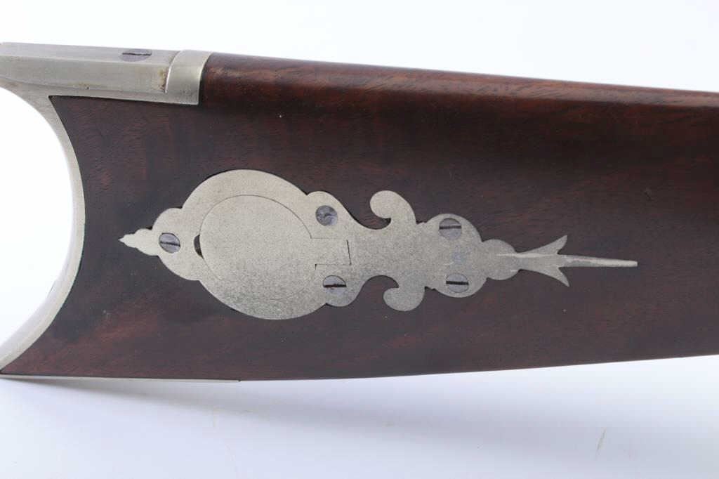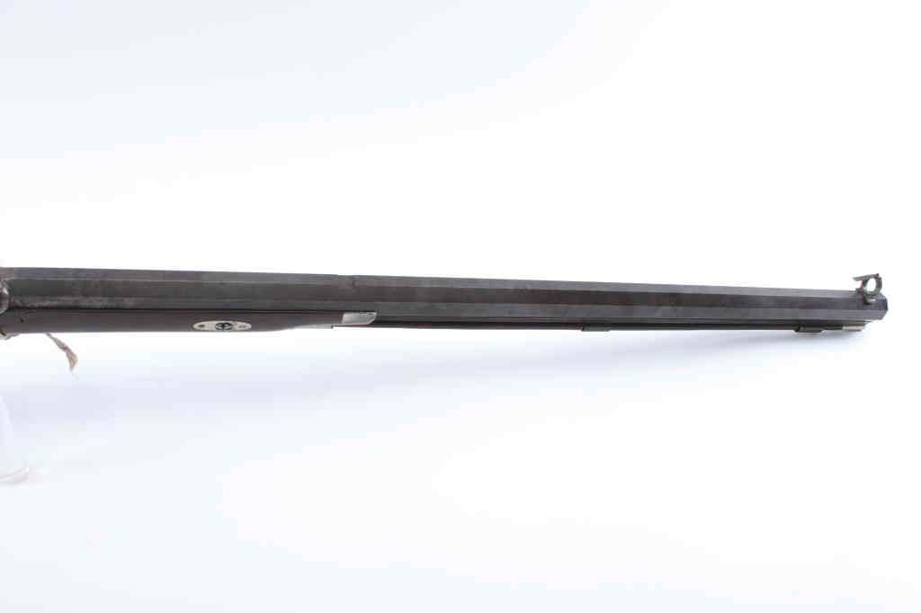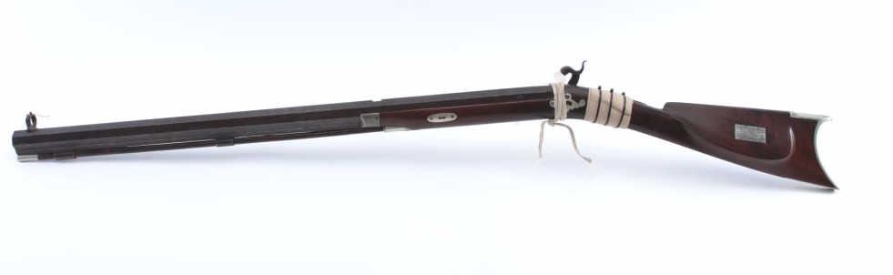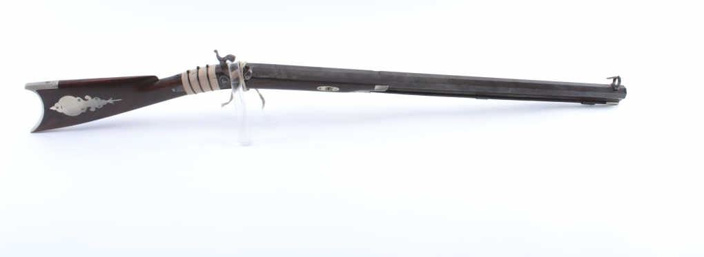 Heavy percussion half stock target rifle, .45 caliber, 30” heavy octagon barrel marked “Q. D. Smith, Machias, Mo” and “Cast Steel” on the top barrel flat; plum brown patina to metal surfaces, back action lockplate, oldrepair to hammer, single key wood half stock with patchbox, wood ramrod, missing trigger and trigger guard, stock has cracks at lockplate area and is temporarily held together by plastic ties, etc. May beresearchable and would benefit from professional restoration of the trigger and wrist areas. (Antique). Est.: $450-$900.