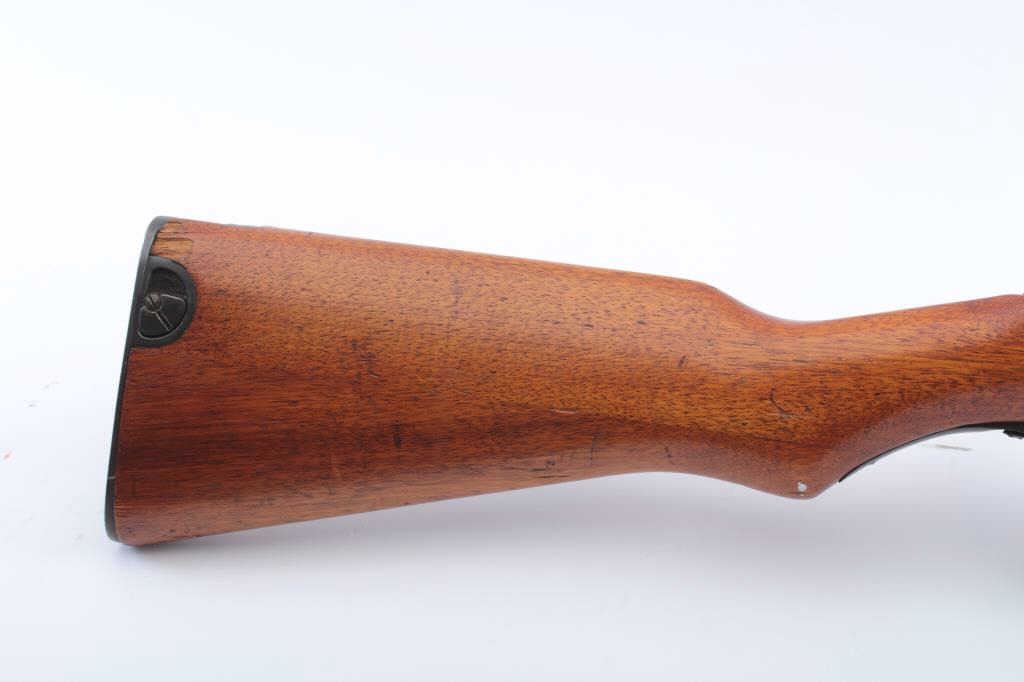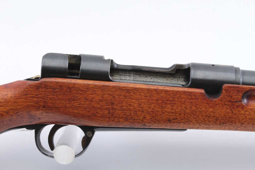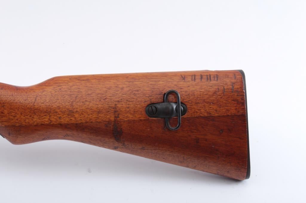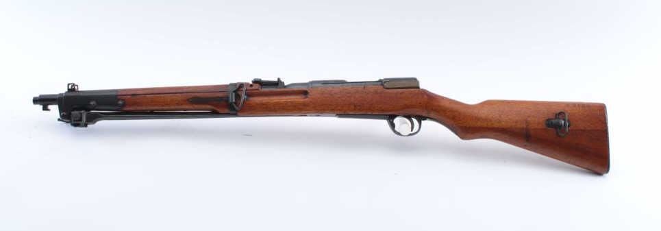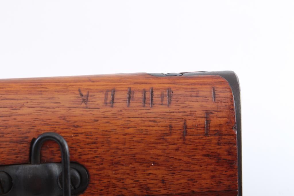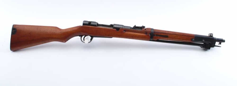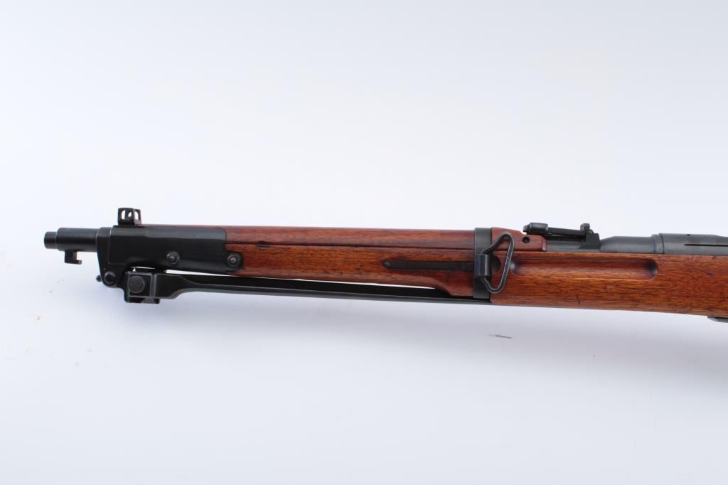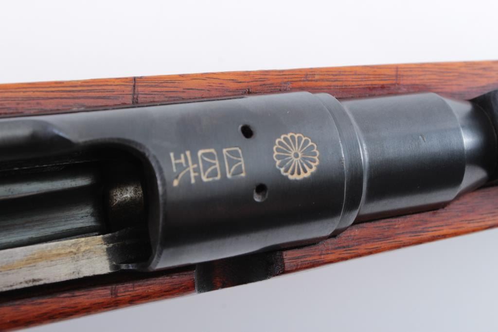 Japanese Type 44 bolt action carbine with “hook” folding bayonet, 6.5mm caliber, 20” barrel, blued finish, wood stock, MISSING BOLT, S/N 06558; fine overall condition with fine bore, majority of blued finishremaining, sharp markings including mum and Japanese characters on top of receiver, fine stock with a small old chip to the right top of the butt stock areas in front of the butt plate. (C&R). Est.: $250-$500.