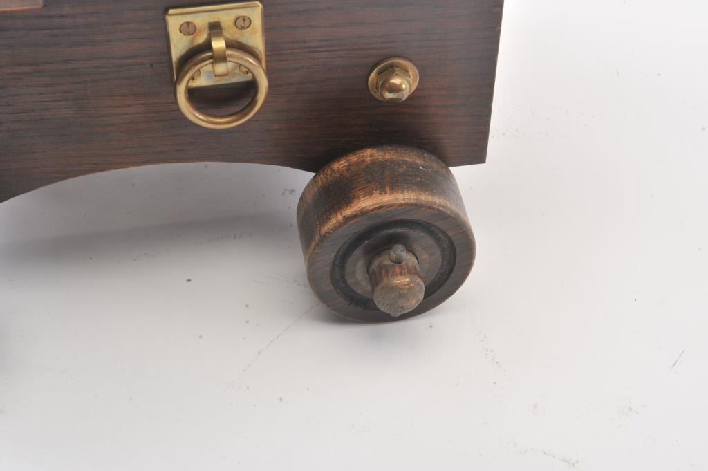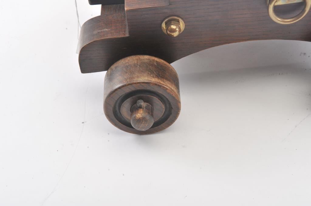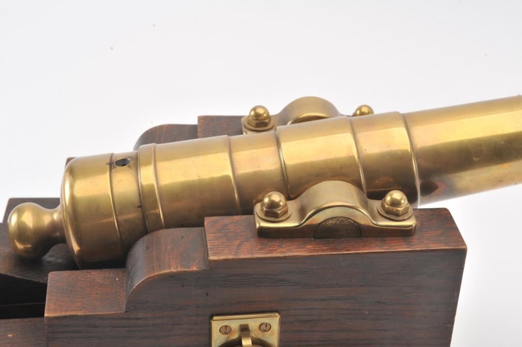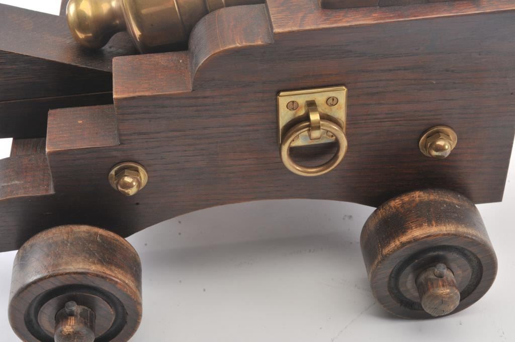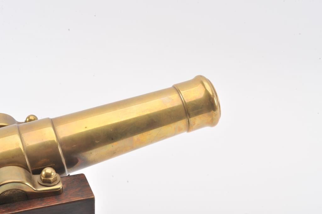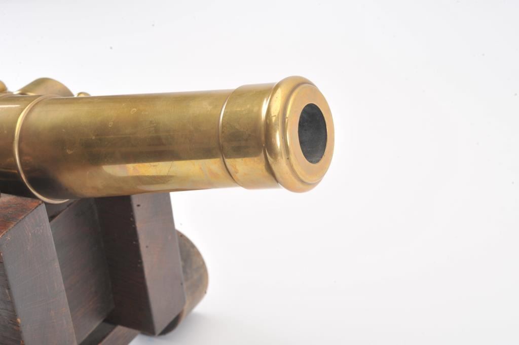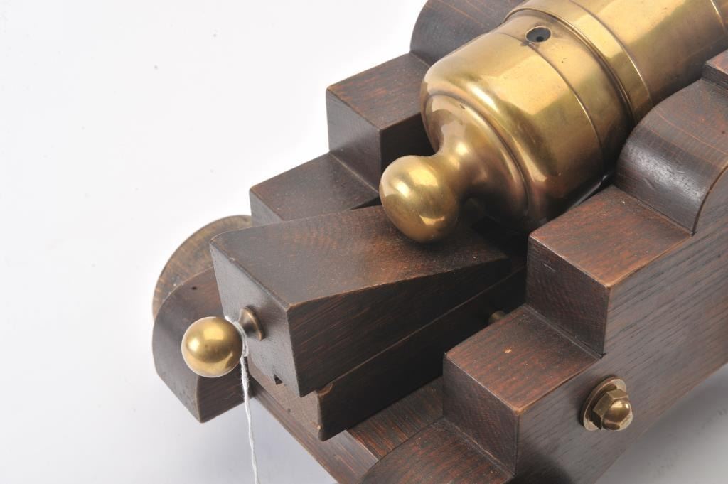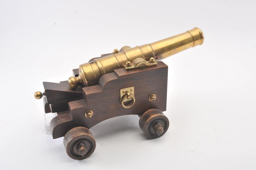 Brass cannon on wood carriage; approximately 22” long with 18” barrel, 12.5” in height and 13” wide wheel to wheel; very good overall condition with nice patina to barrel. Est.: $300-$600.