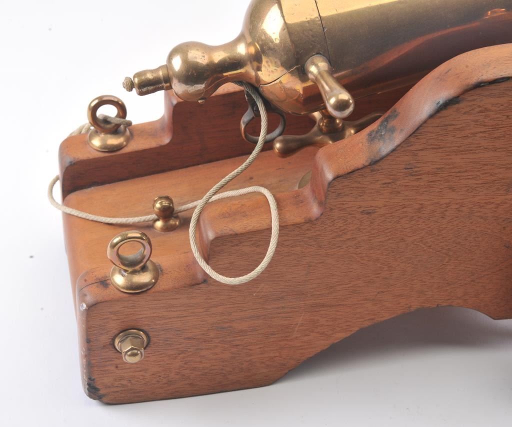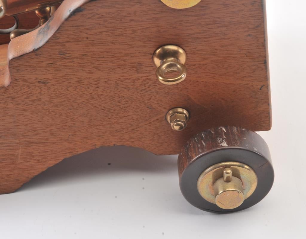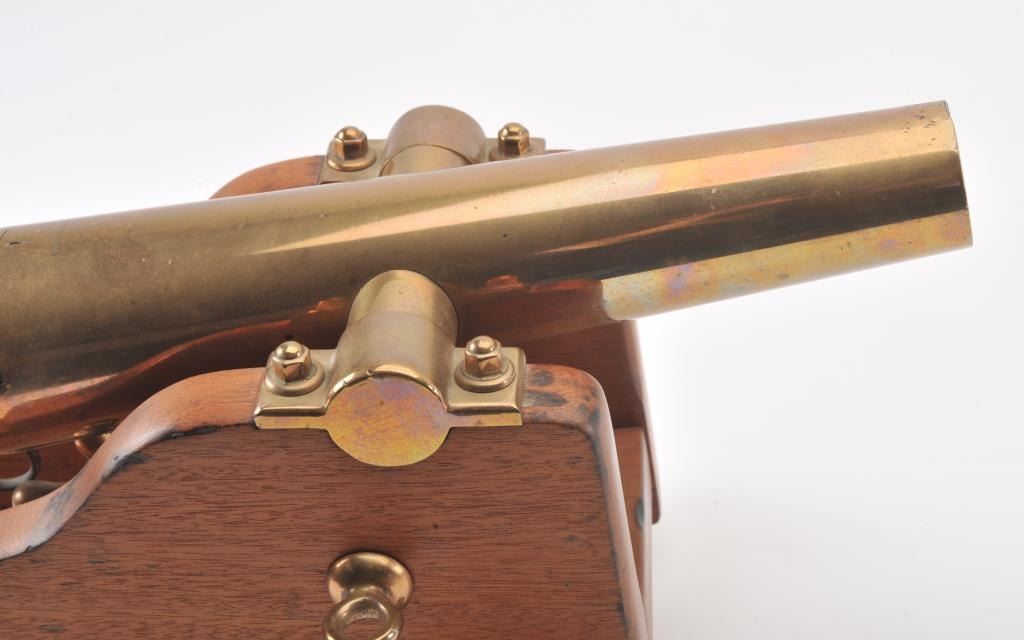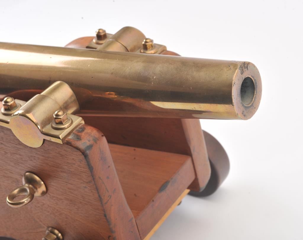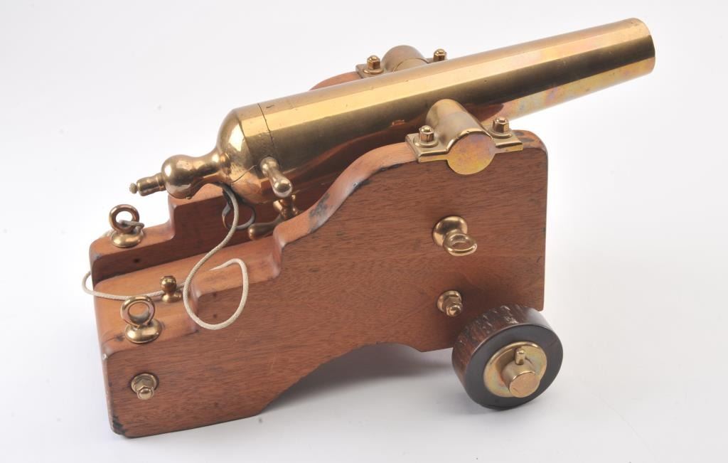 Antique brass cannon on wood carriage, approximately 19” long with a 16” barrel; 10” in height and 12” wide wheel to wheel; very good condition. Est.: $350-$700.