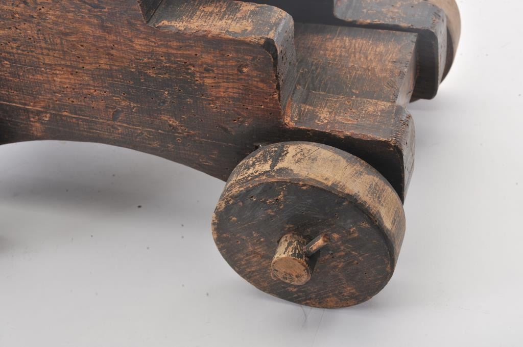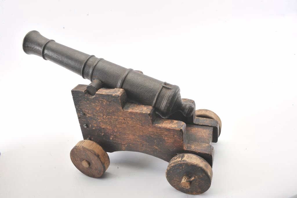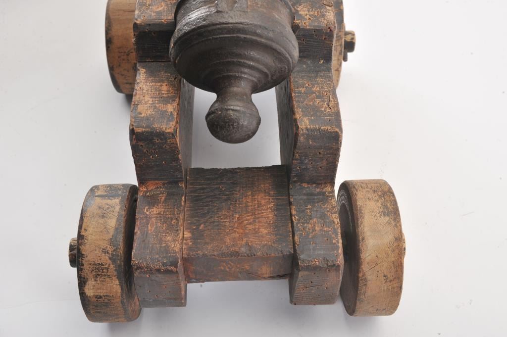 Vintage cast iron mini cannon with wood carriage; approximately 24’ overall with a 21” barrel; 13” in height and 12” in width wheel to wheel. Est.: $300-$600.