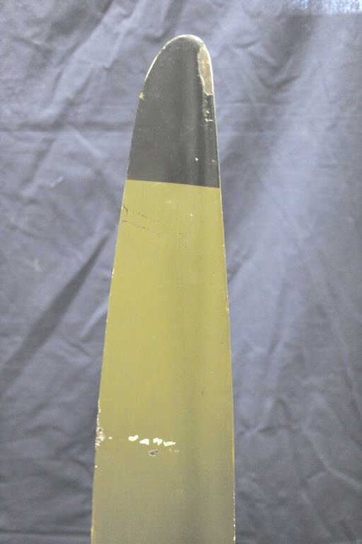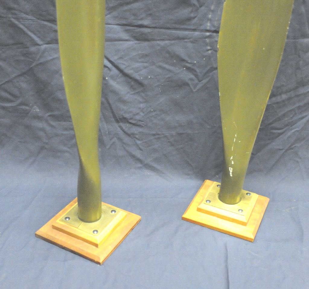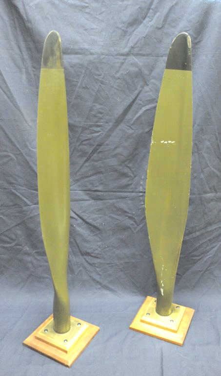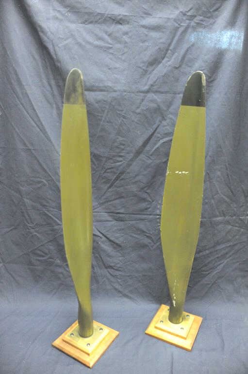 Lot of 2 small airplane propellers, each mounted separately on a wood base and each approximately 51” in height; painted green with black tips; both in good overall condition. Est.: $300-$600