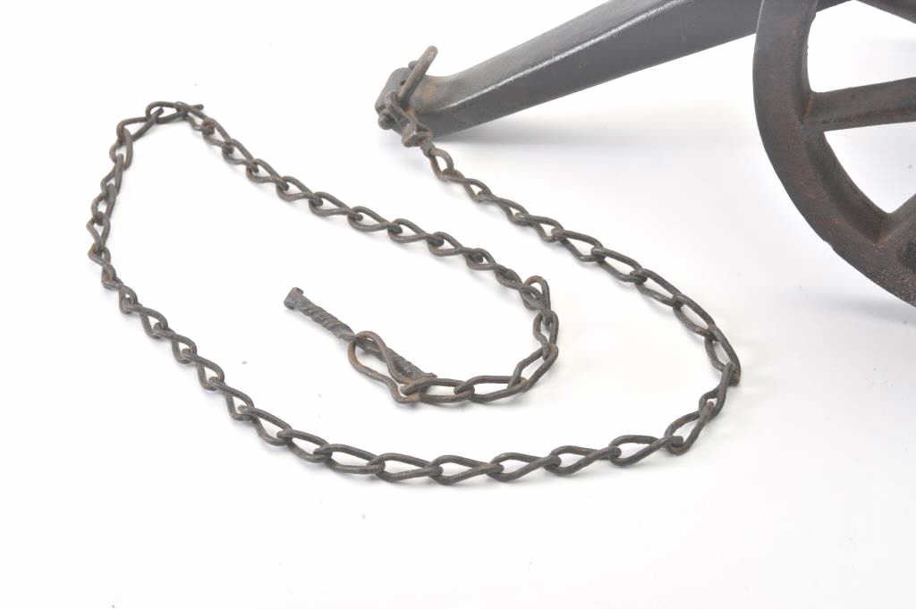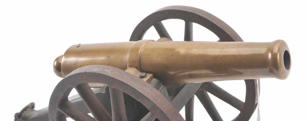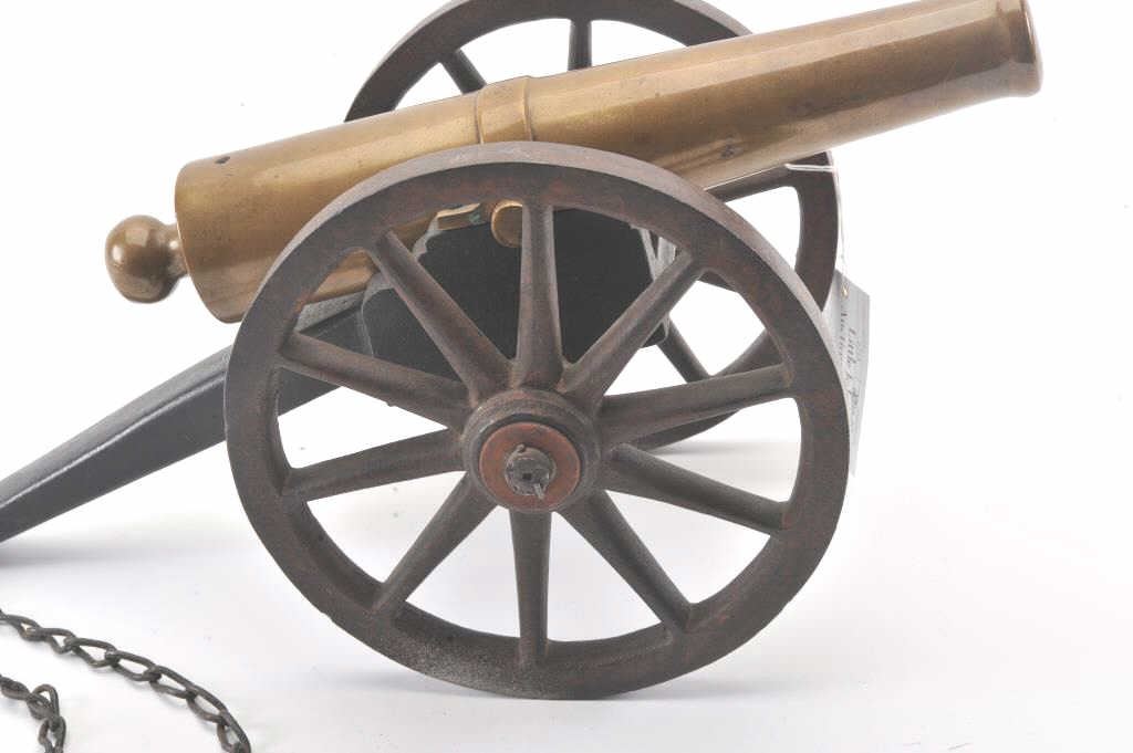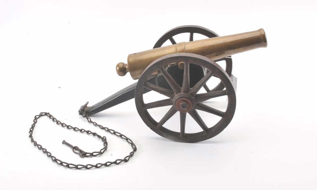 Mini desk size brass cannon with iron base; barrel is approximately 17” long with iron base 19” long; the bore of the cannon is approximately 1” in diameter and wheel to wheel, the carriage is approximately 11”wide; great patina remaining on brass barrel. Est.: $350-$700.