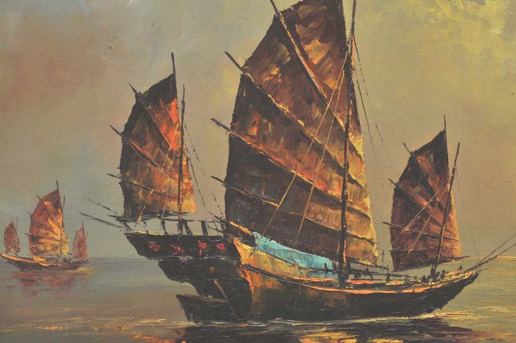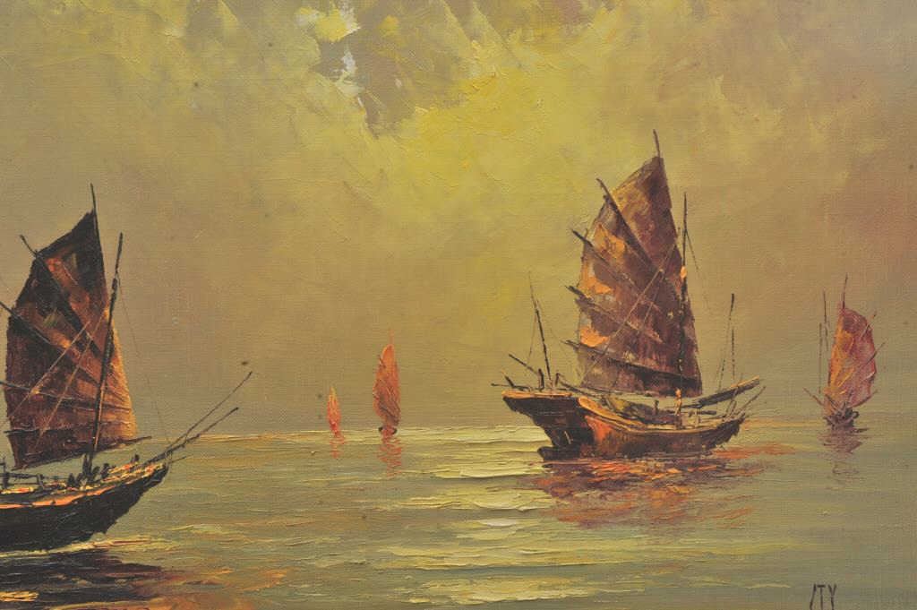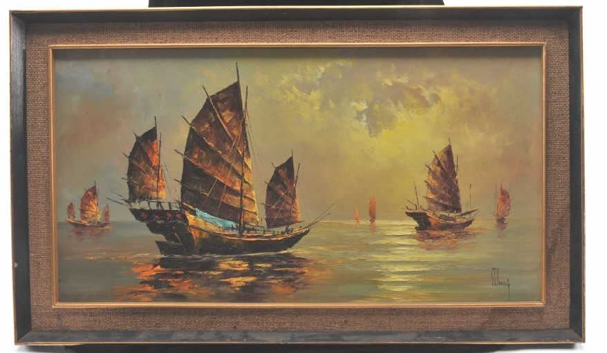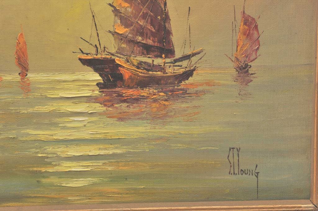 Oil painting on canvas circa late 1960s-70s signed lower right "St. Young" with Hong Kong Art Gallery sticker on rear and collected by U.S. Naval officer while traveling in service. Measures 15 1/2" x 29". Noted artist at this time who commanded good prices. Est.: $300-$600