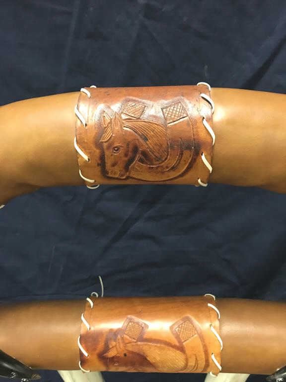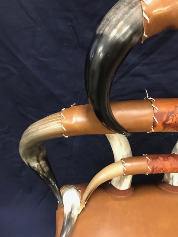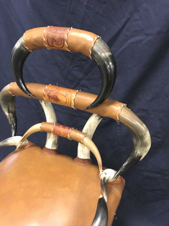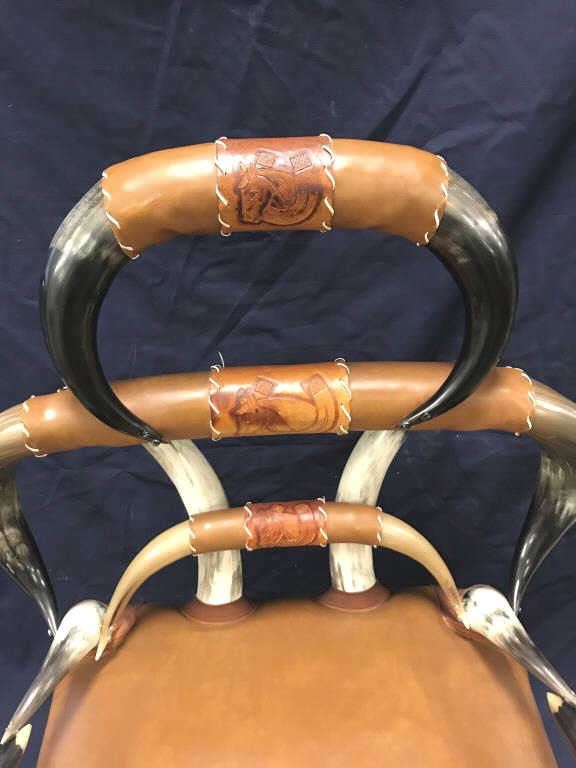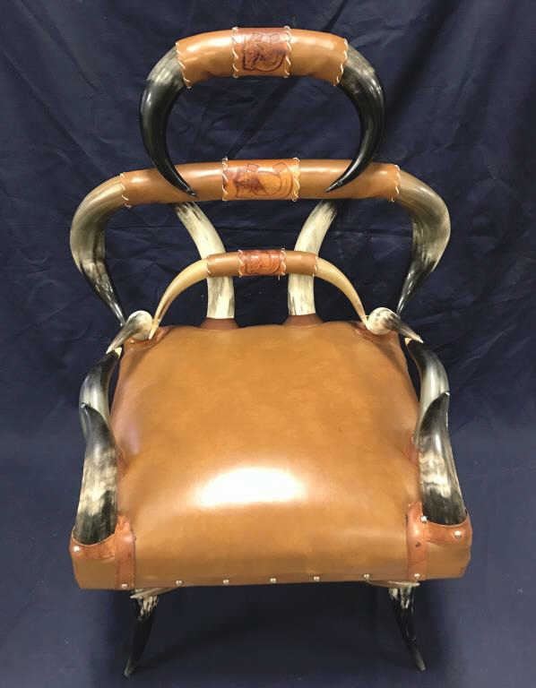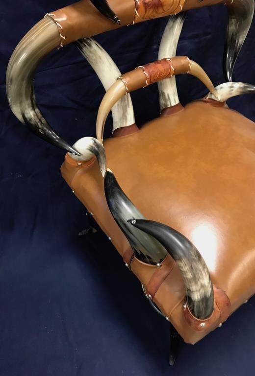 Beautiful Western horn chair in overall good condition; approximately 41” in height (back), seat is 30” wide by 23” deep with brown leather seat covering. Great for any Western-theme room! Est.:$300-$600.