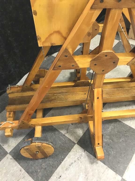 Large hand-made wooden Catapult model; well-constructed; approximately 40” in height, 46” long and 31” wide. Est.: $350-$700.