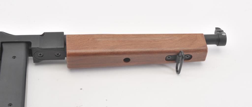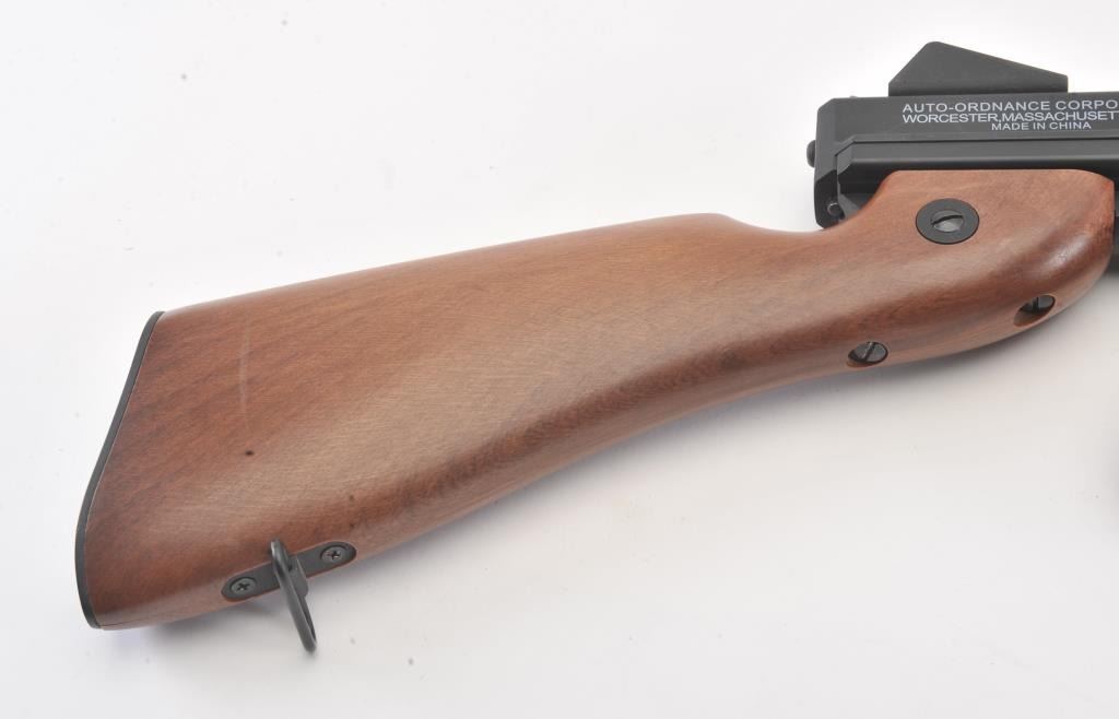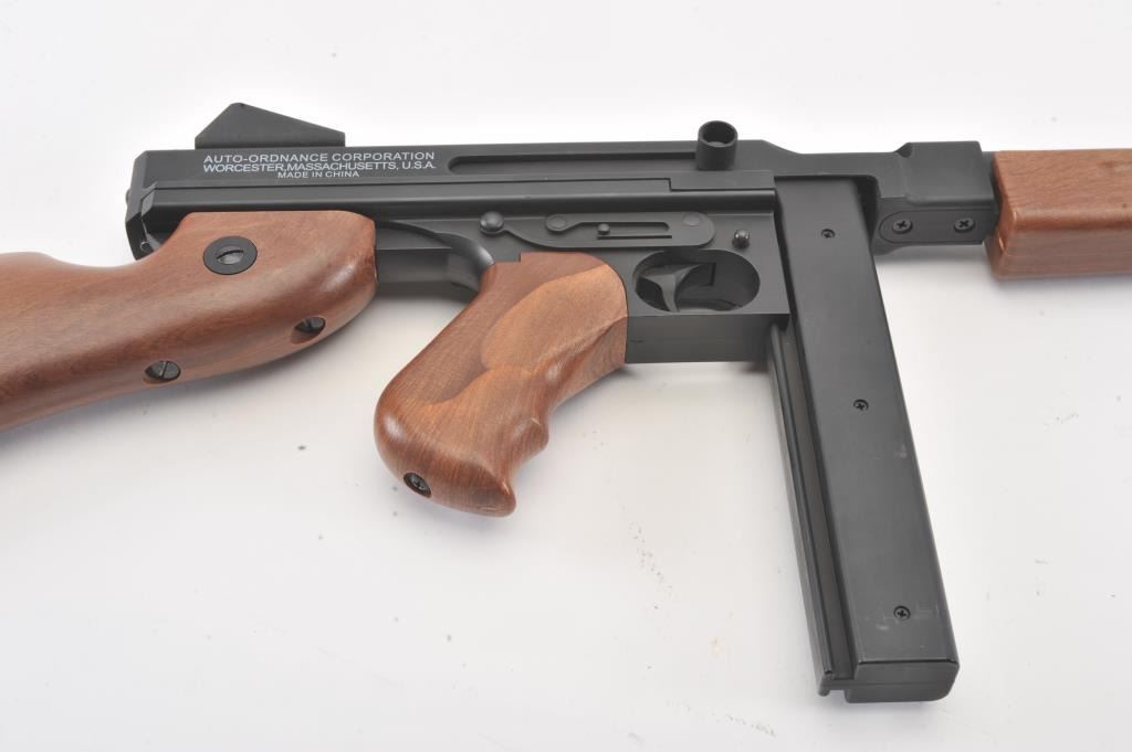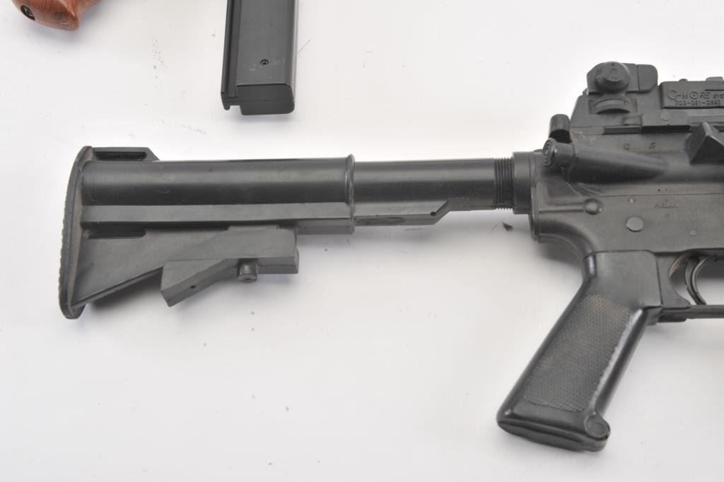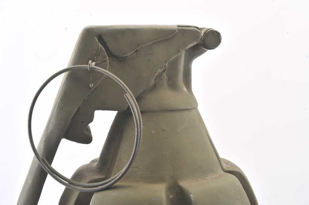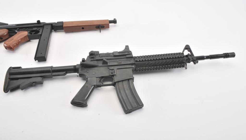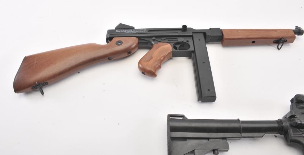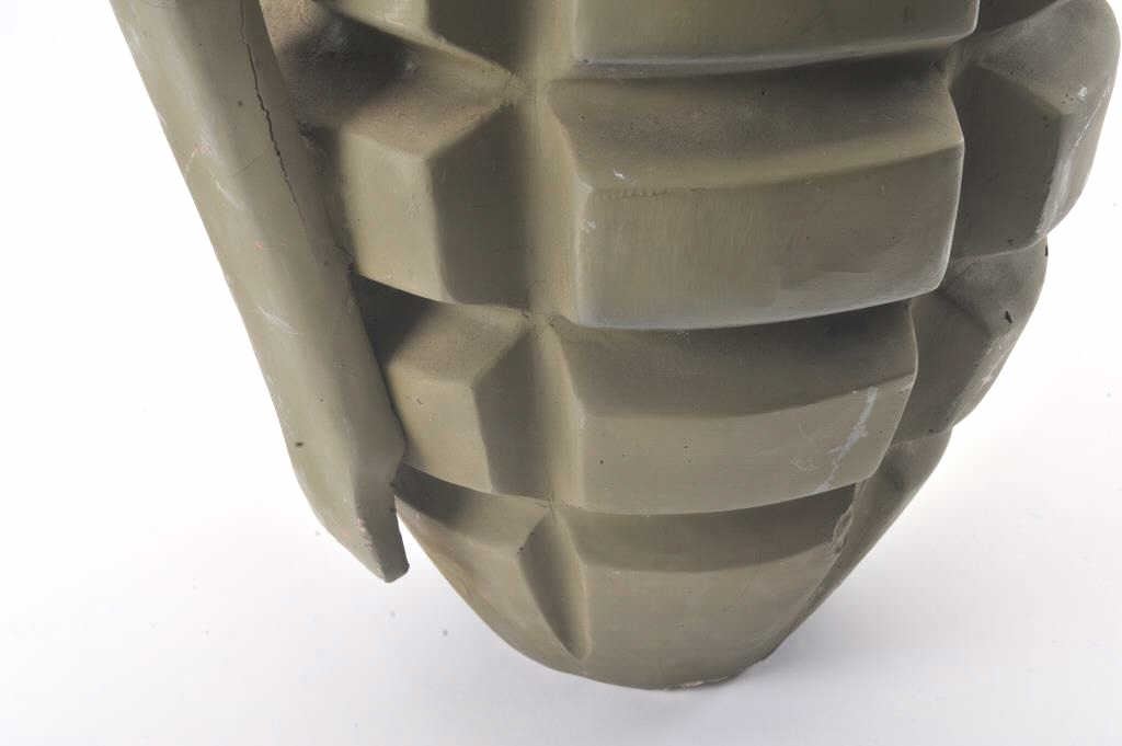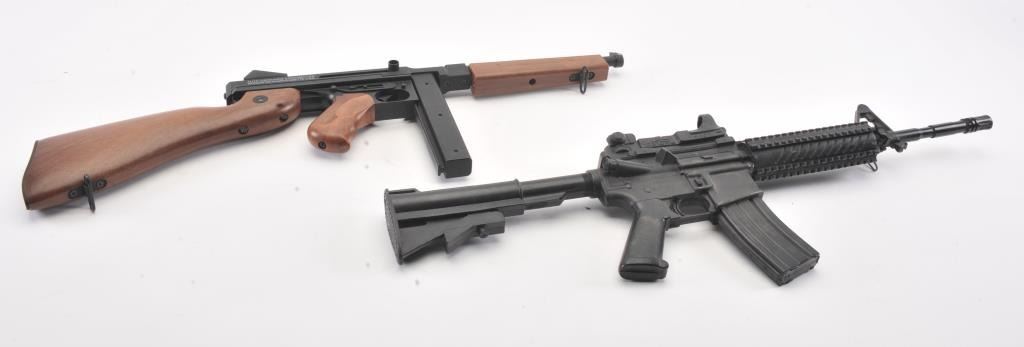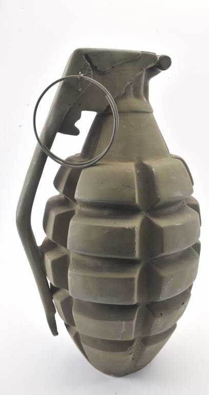 Large fiberglass model of a hand grenade, approximately 29” in height plus two toy guns, one a solid rubber AR-15; the other a copy of an Thompson sub-machinegun. Est.: $300-$600.