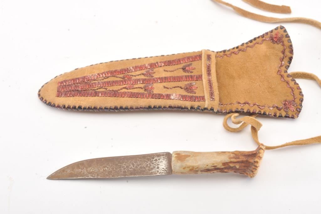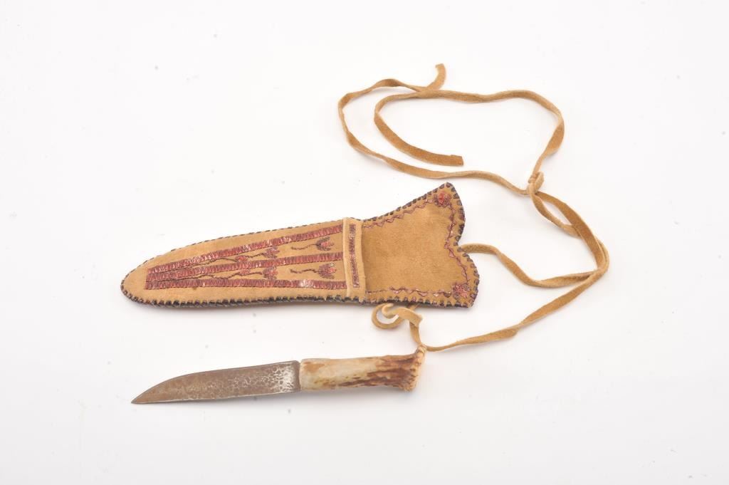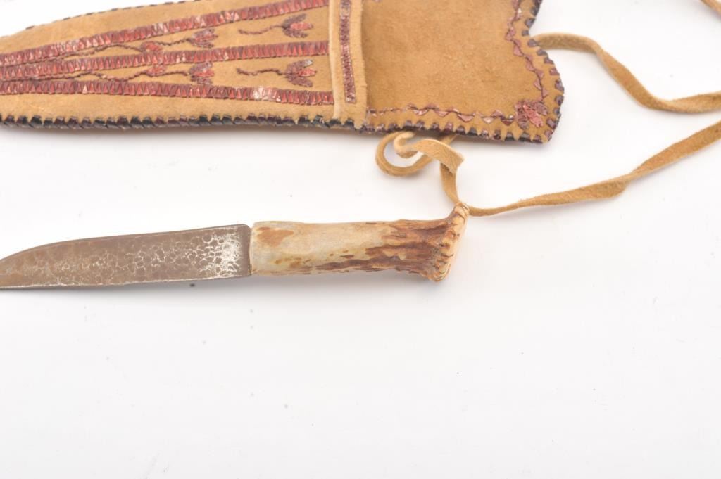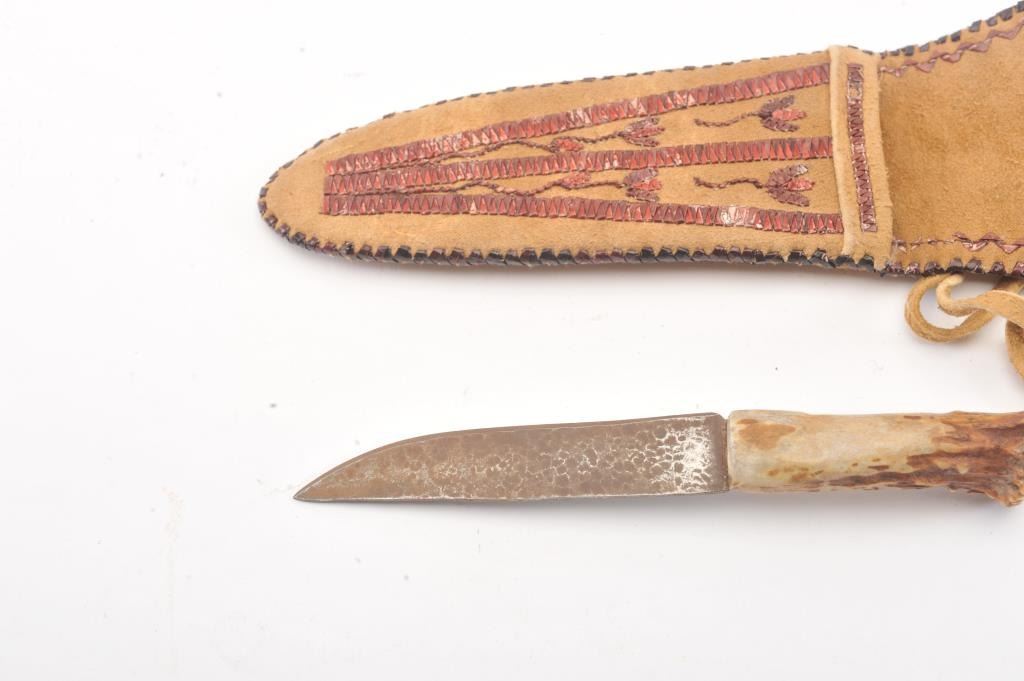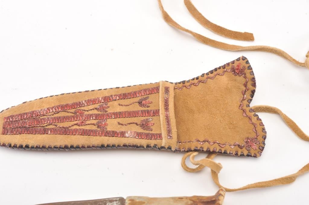 Quilled Native Indian made scabbard on tanned hide. Stag gripped small knife. Measures 8" overall and rusted blade measures 5". Good quality quill work of last 30 years. Est.: $200-$400
