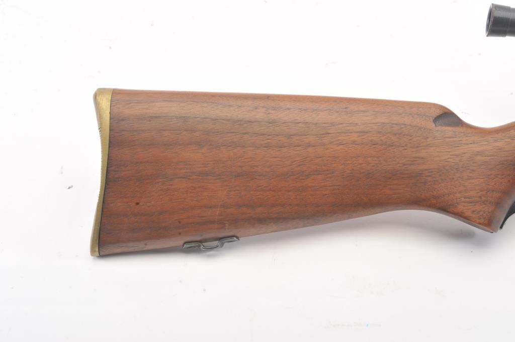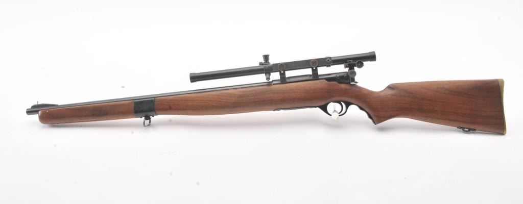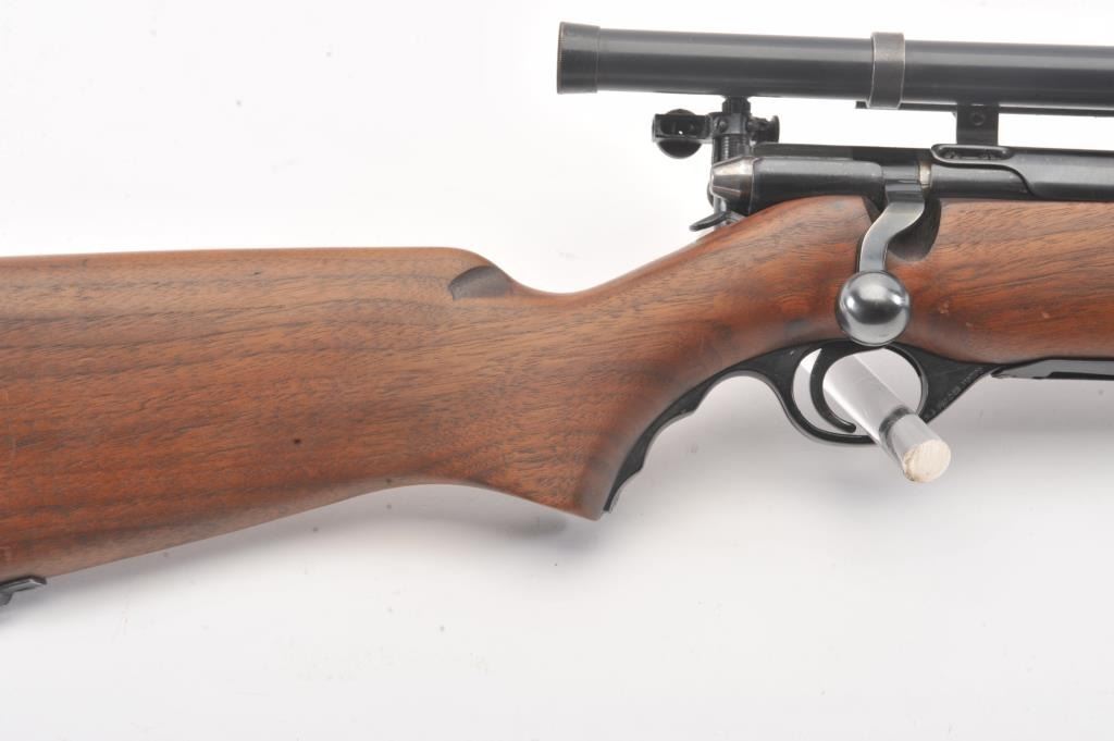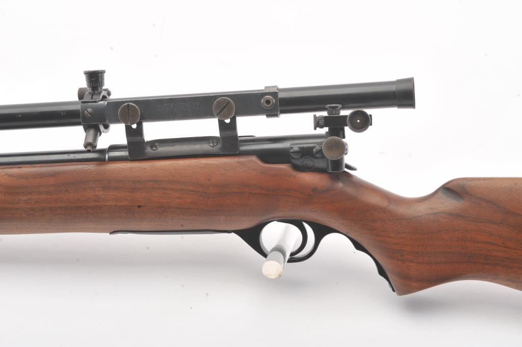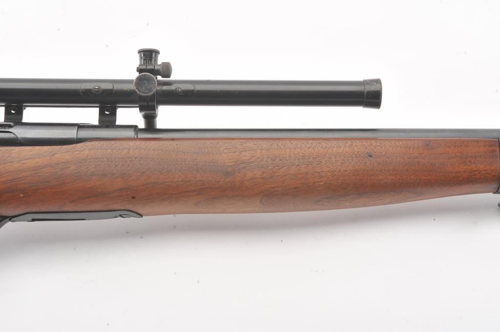 Desirable Mossberg Model 42M-B bolt action rifle, .22 short, long or LR caliber, 23” barrel marked on top “UNITED STATES PROPERTY/SERIAL NO. 15707, blued finish, no magazine, wood stock, adjustablereceiver-mounted rear sight, ramp front sight and mounted with a Ward’s Model 20 scope displaying very good optics; overall very good + condition with a crisp action, very good markings, very good + bore and very good wood stock. (C&R). Est.: $250-$500.