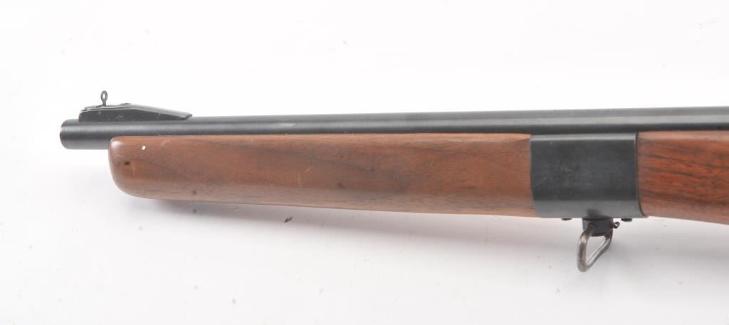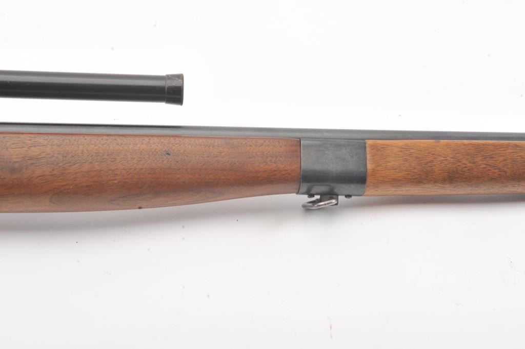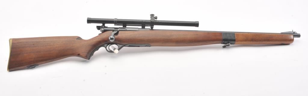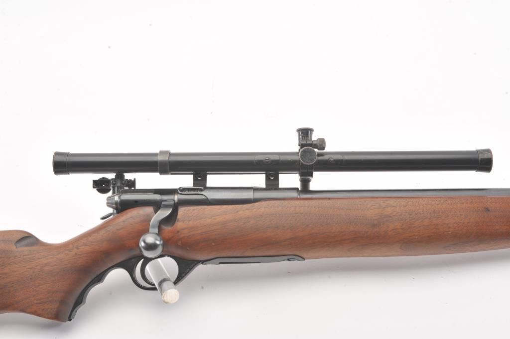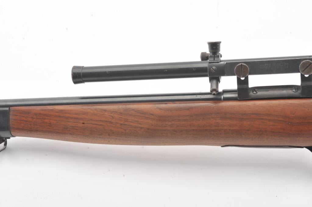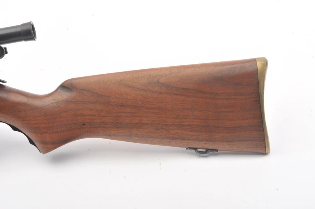 Desirable Mossberg Model 42M-B bolt action rifle, .22 short, long or LR caliber, 23” barrel marked on top “UNITED STATES PROPERTY/SERIAL NO. 15707, blued finish, no magazine, wood stock, adjustablereceiver-mounted rear sight, ramp front sight and mounted with a Ward’s Model 20 scope displaying very good optics; overall very good + condition with a crisp action, very good markings, very good + bore and very good wood stock. (C&R). Est.: $250-$500.