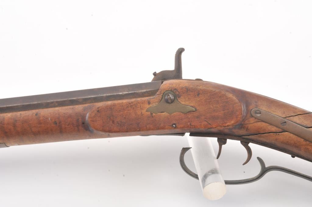 Half stocked percussion plains rifle, .38 cal., 33” octagon barrel, Golcher lock, double set triggers, in un-cleaned out-of-the-attic condition with a heavy dark patina to metal surfaces, dark bore, settriggers working at time of description, fair + stock with classic old repairs to wrist. (Antique). Est.: $100-200