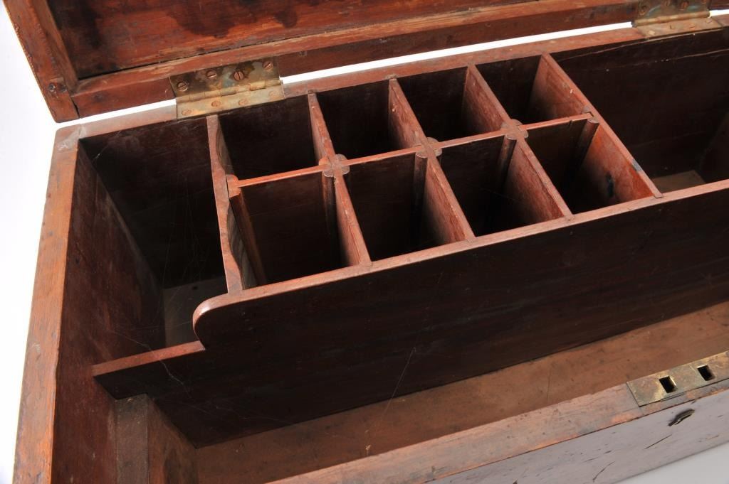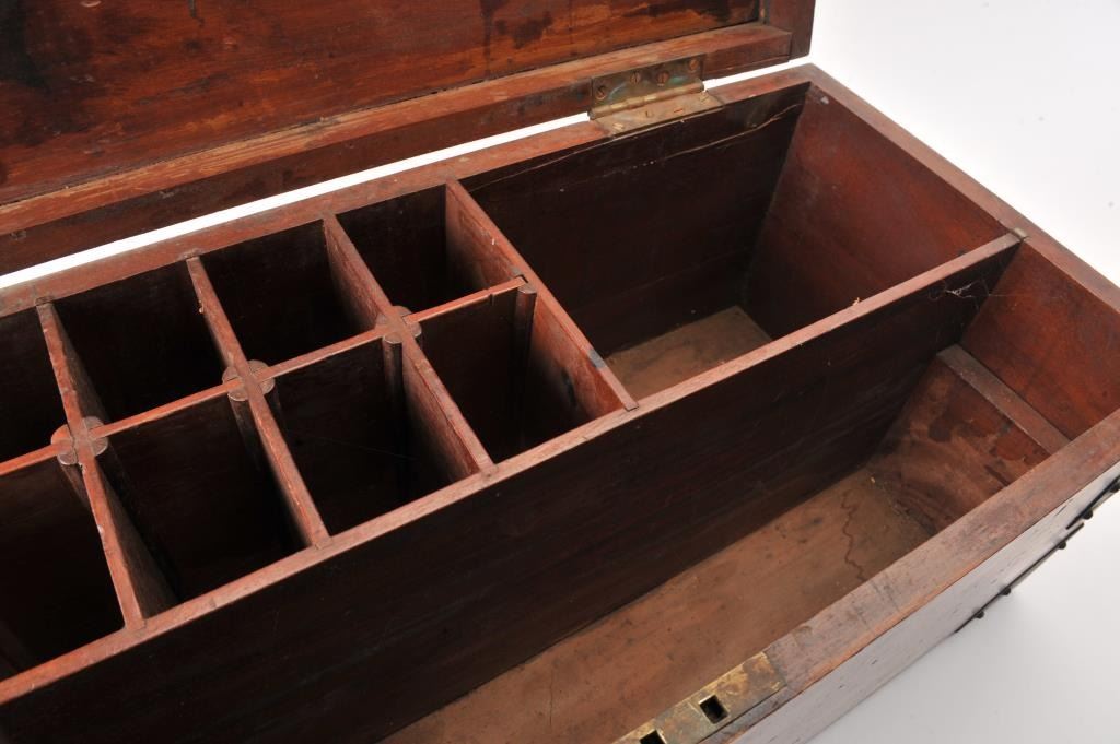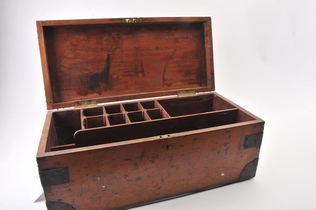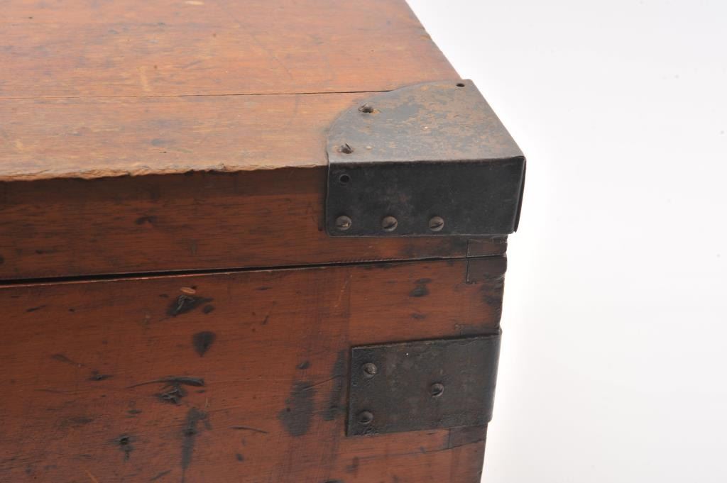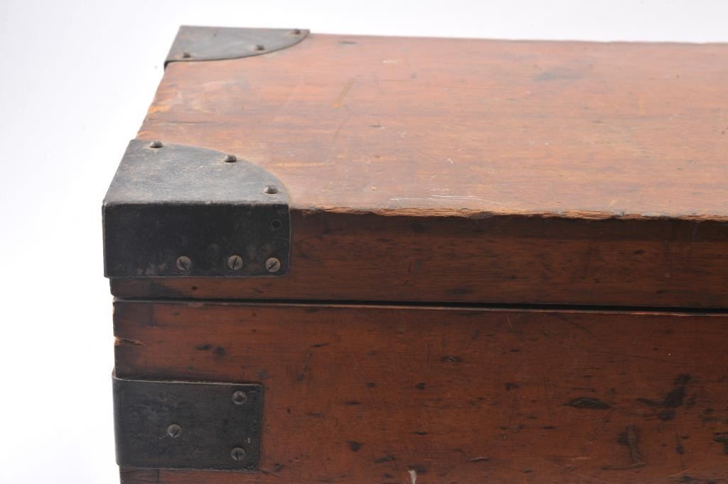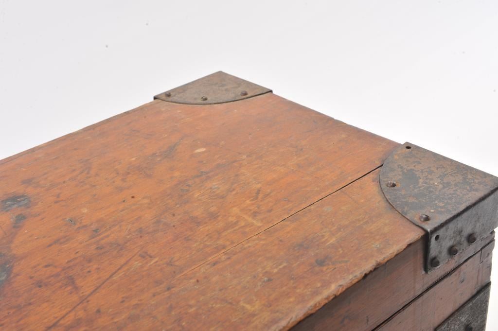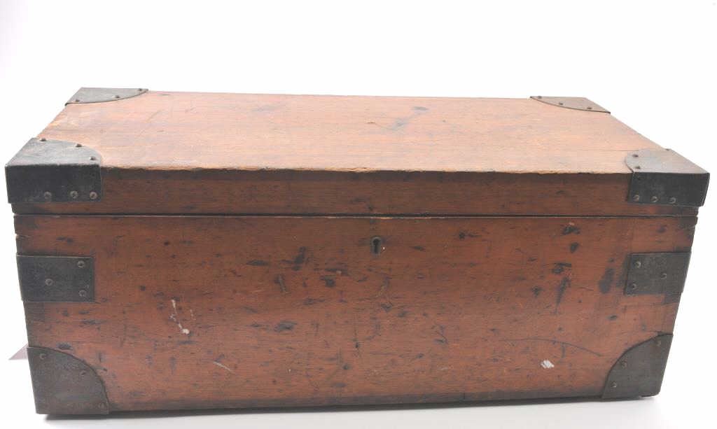 Vintage iron trimmed wood ordinance chest, marked "Made by G.W. Lewis 1985" approximately 30” long x 12” in height X 13” deep; overall good used condition. Est.: $350-700