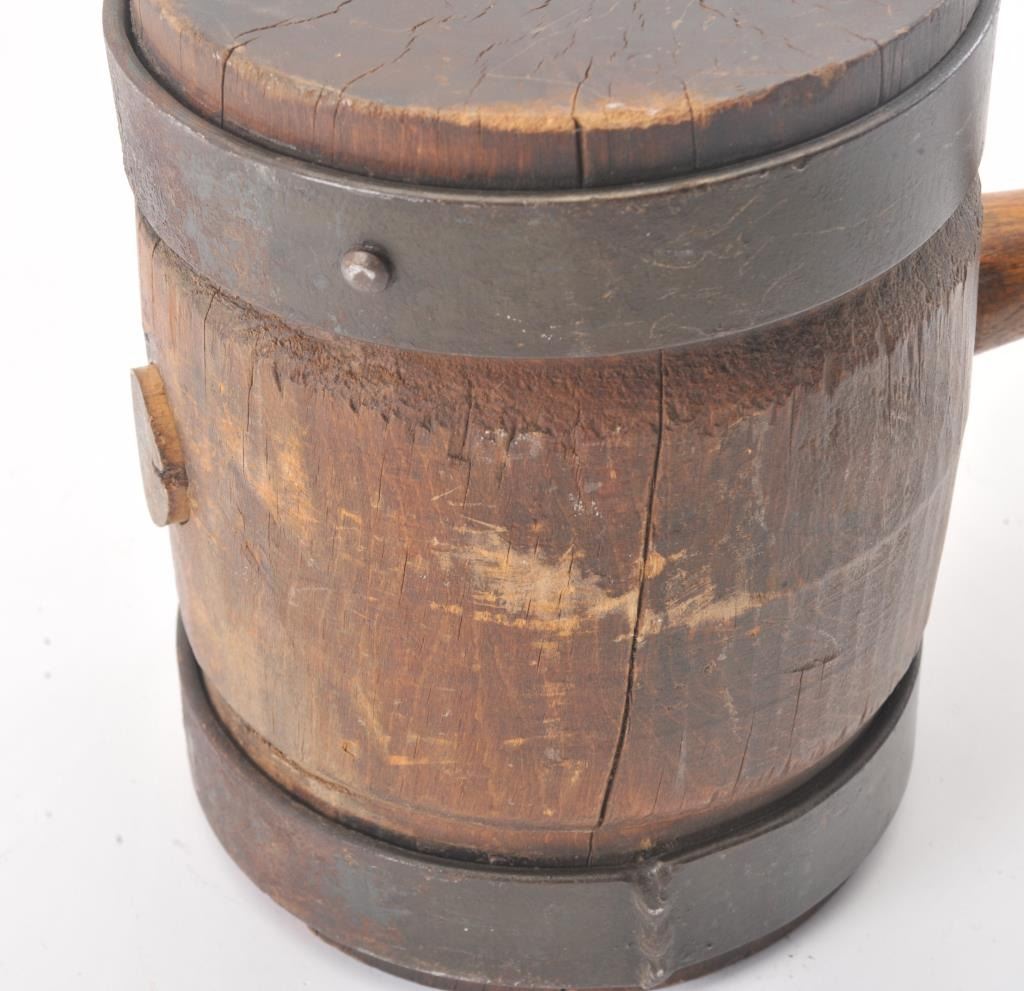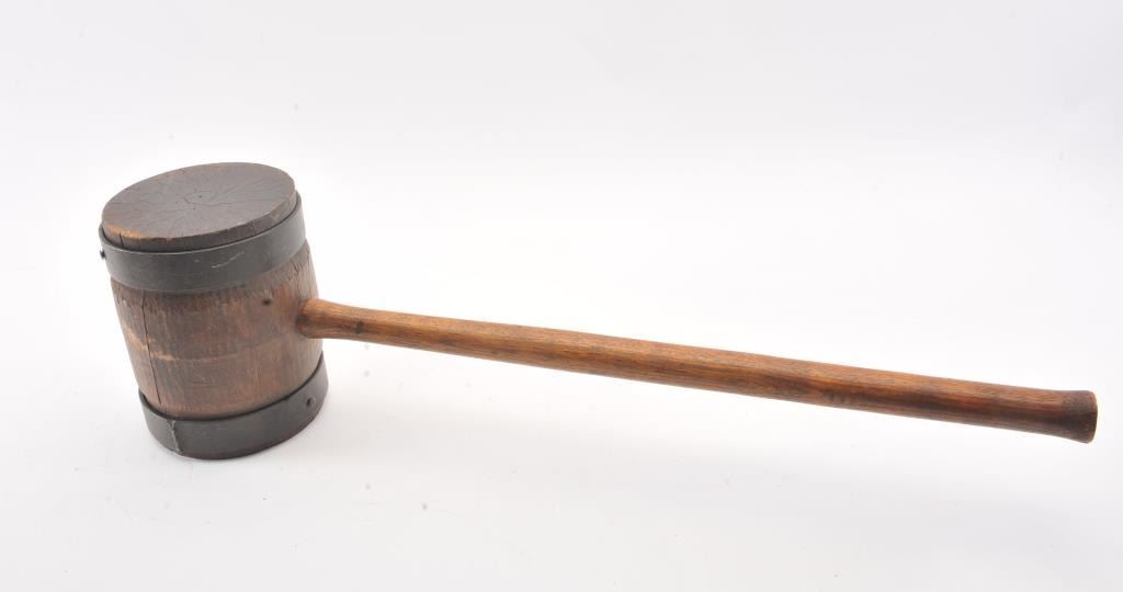 Wood mallet circa 19th-20th century out of pioneer days in Utah. Used by railroad man. Steel bands over hardwood. Measures 10” across the head and the shaft measures 28”. Hand carved and said to be from time of“Golden Spike”. 1866 and definitely 19th century. Good condition. Est.: $150-$300