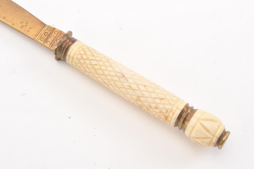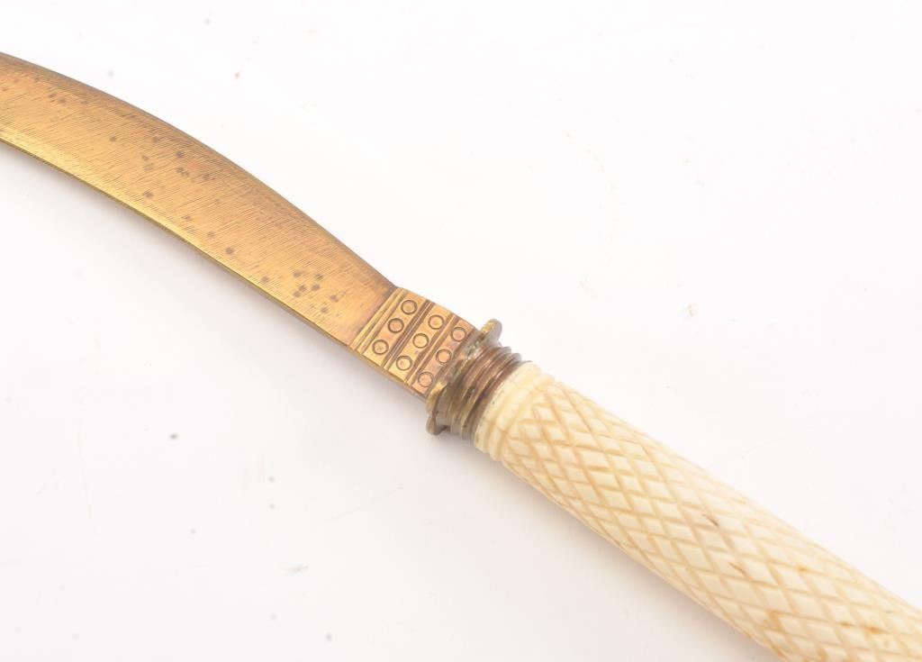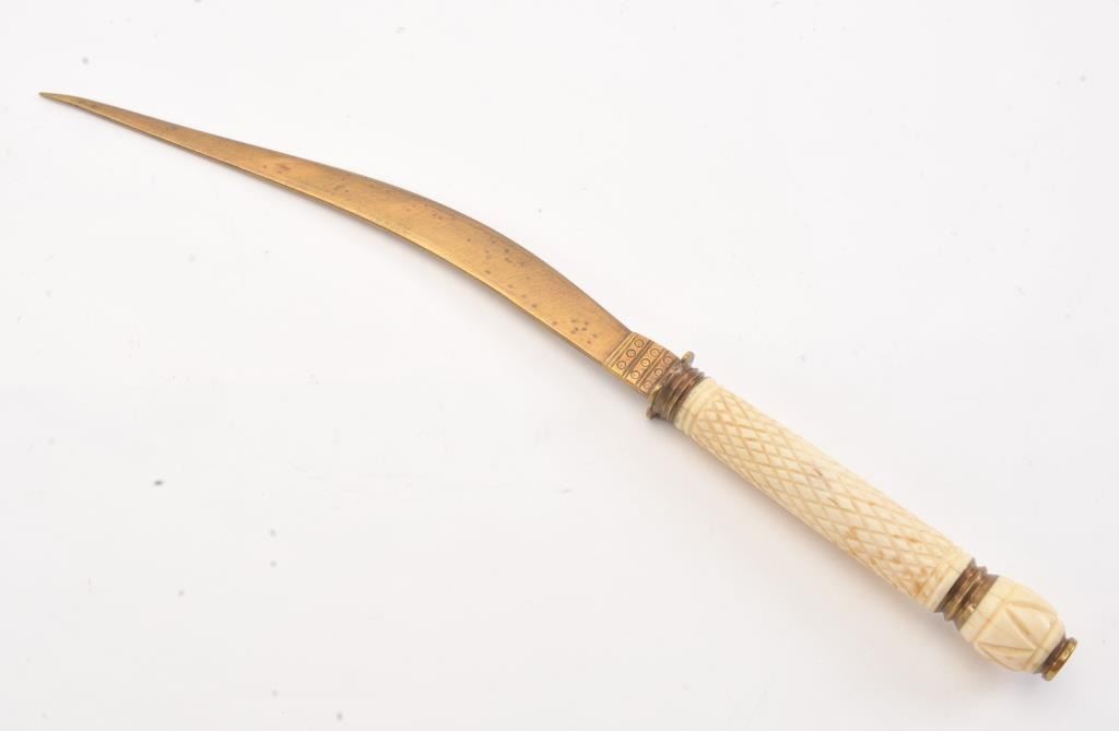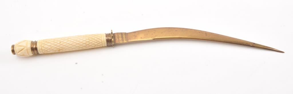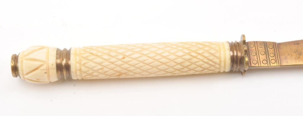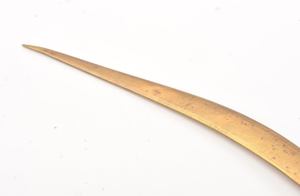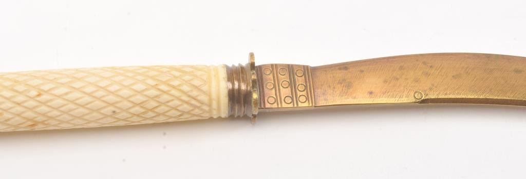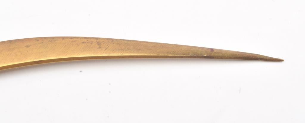 Ceremonial dagger for Chieftan from Bali area of Indonesia circa early 1900. Bronze brass blade with elongated checkered bone or ivory hilt. Measures 16 7/8” overall with a 10 7/8” blade. Yani Hariyanto once was quoted assaying “Dagger for wife, not kill but she move faster!” Est.: $175-$350