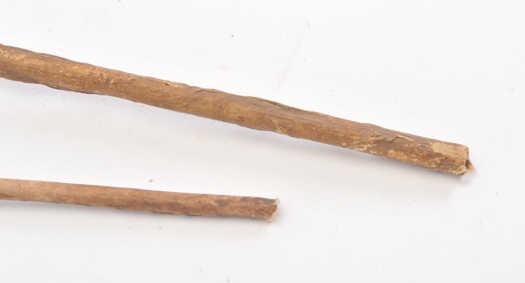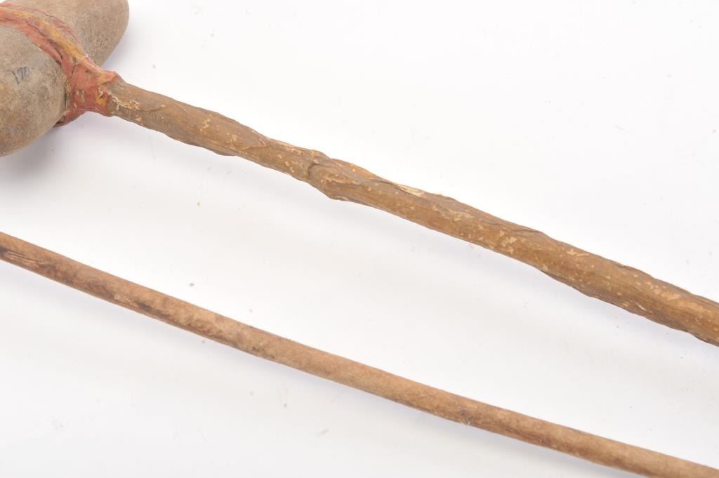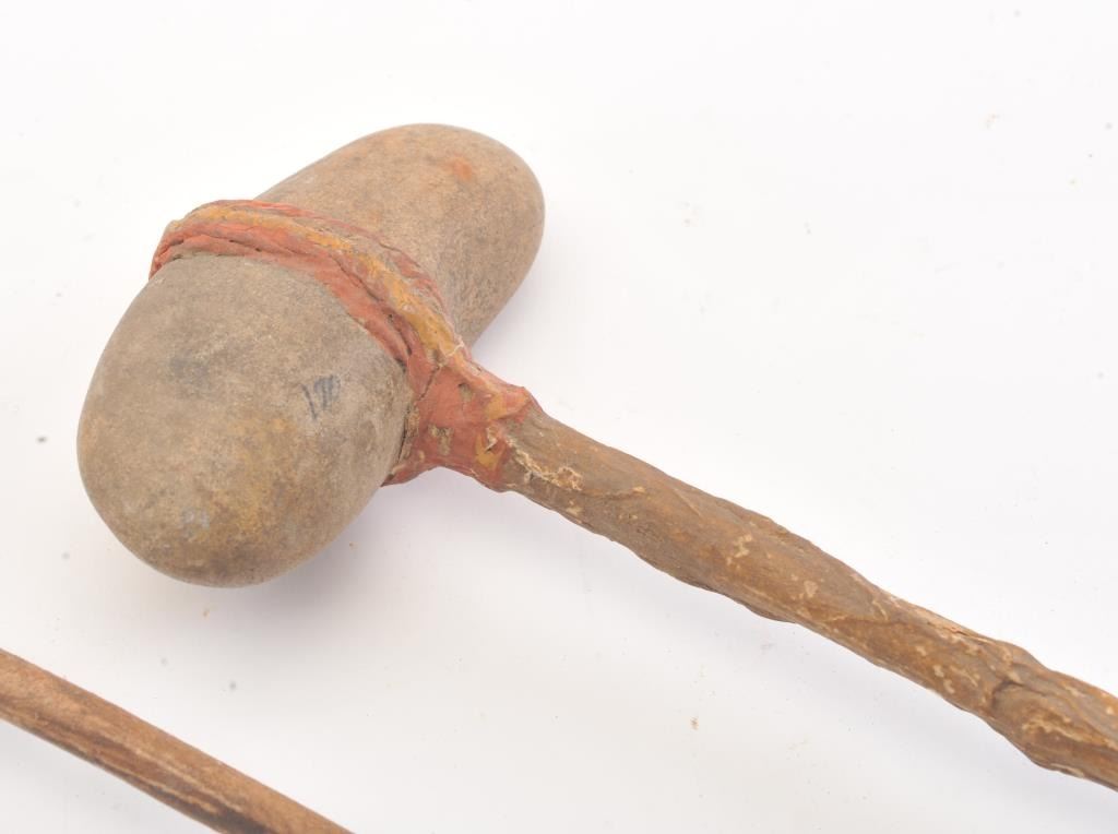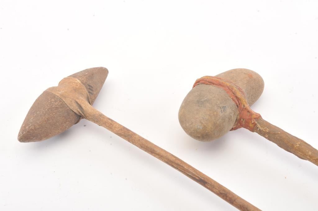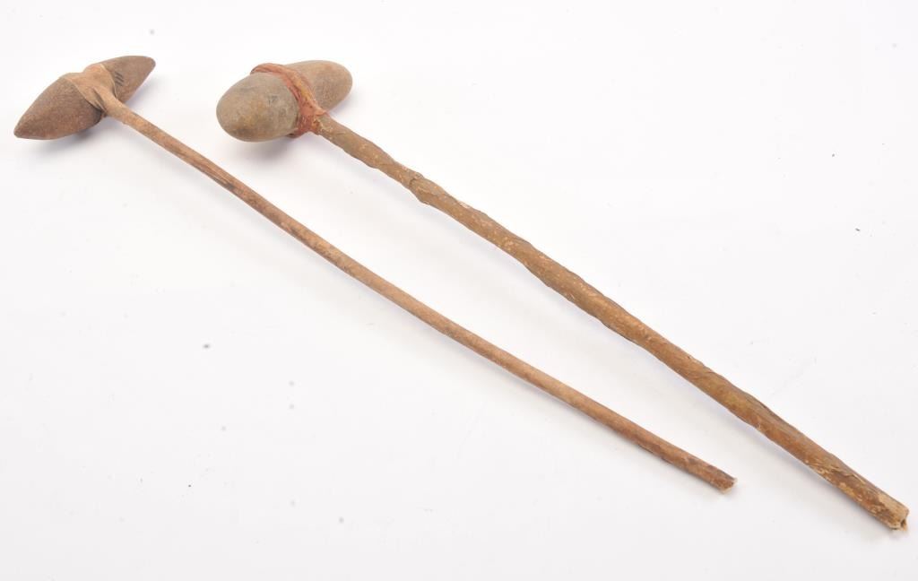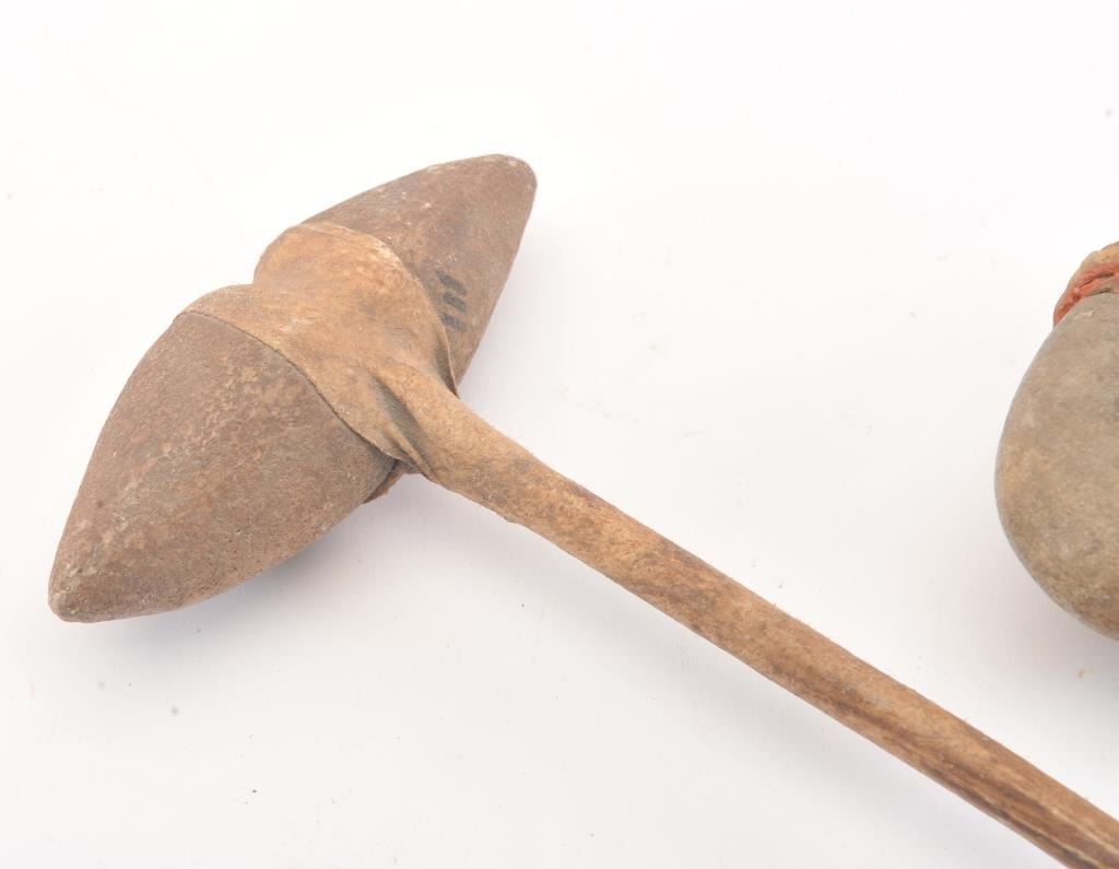 2 authentic American Native stone and raw hide clubs from 19th century. Purchased by our consignor at benefit sale from Palm Springs museums in the early 70s. Measures 21” and 22:. Good condition. Est.: $150-$300
