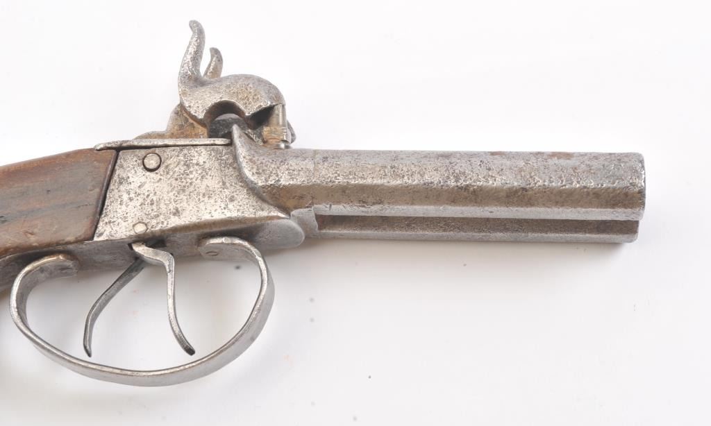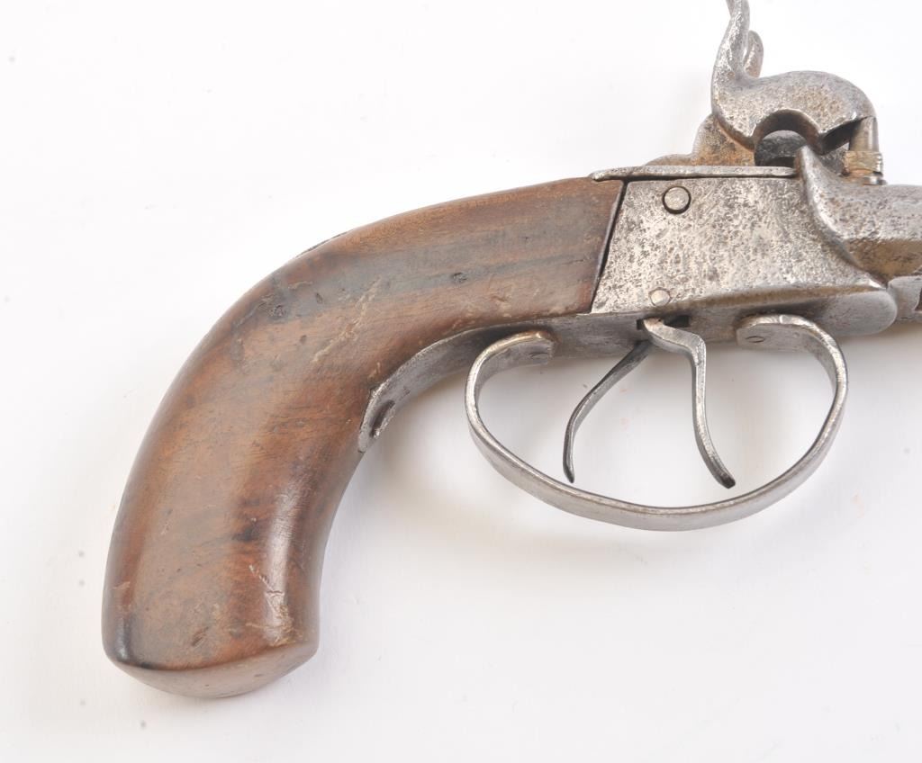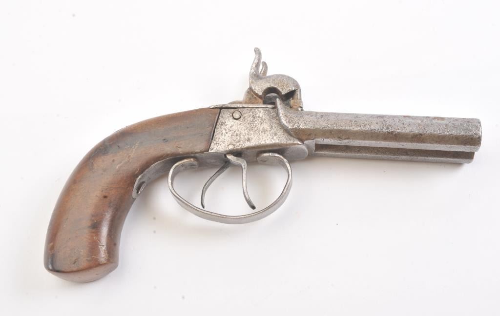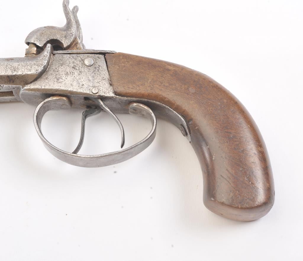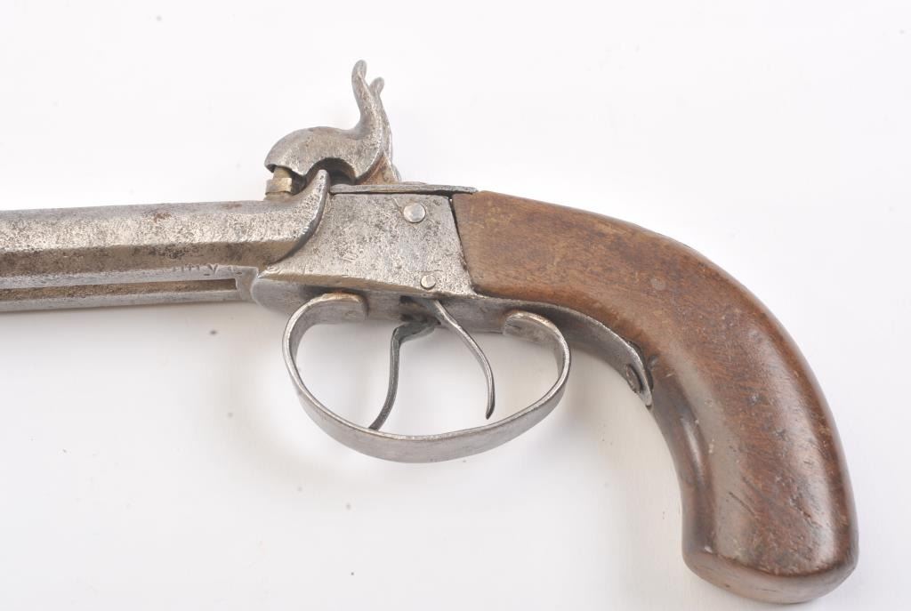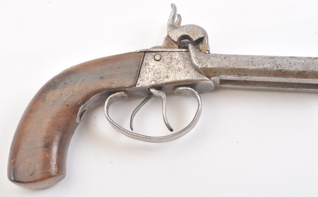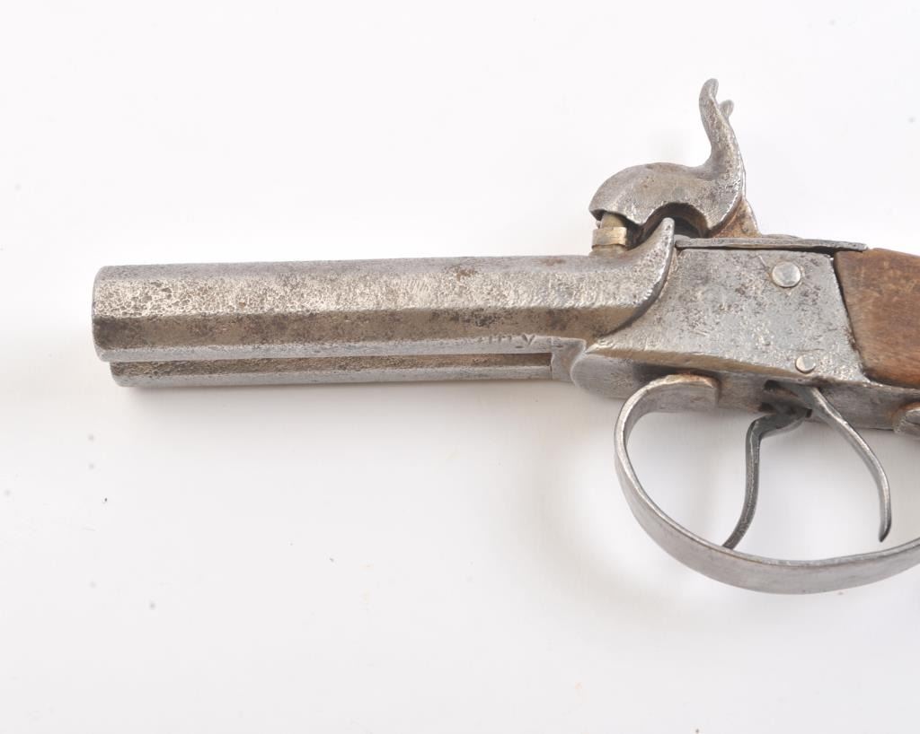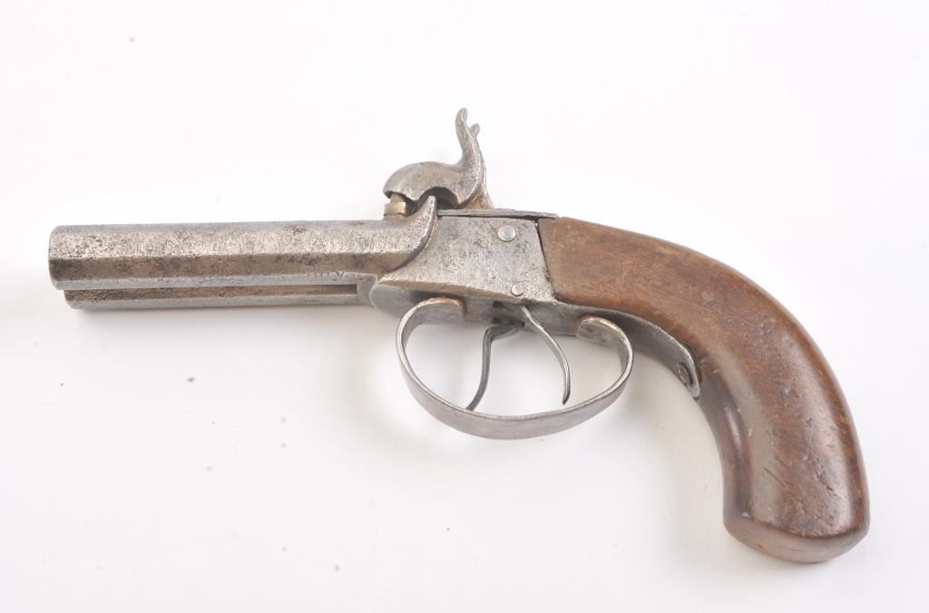 Double barrel percussion pistol circa 1850-60s. Measures 8 1/2" overall and approximately 11mm or .44 caliber. Light to moderate pitting. The type imported and used during the Civil War nick named "Snake Eyes". Locks working. Est.: $125-$250