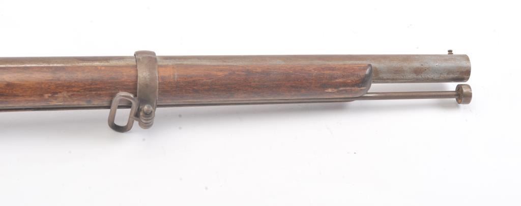 Reproduction flintlock musket, .60 caliber, 37” barrel, wood stock with steel ramrod; overall good condition with a brown patina to metal surfaces, good wood and interesting “23.D.A.R./448” stamped on top of steel buttplate. (flintlock). Est.: $150-$300.