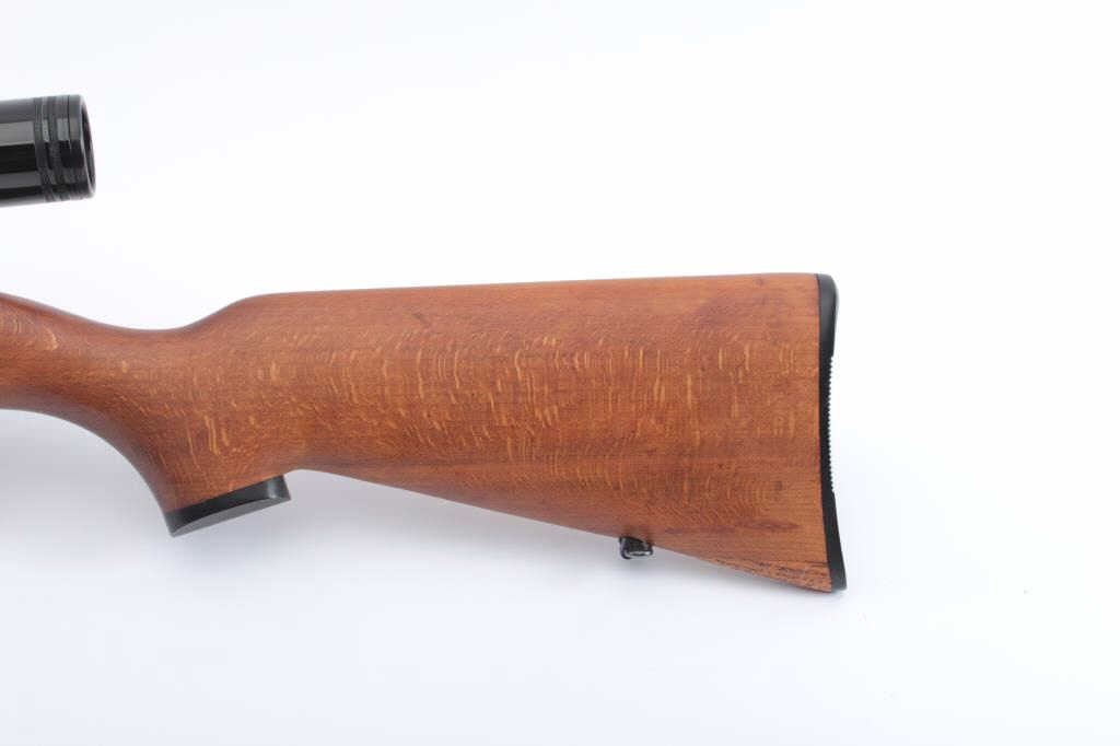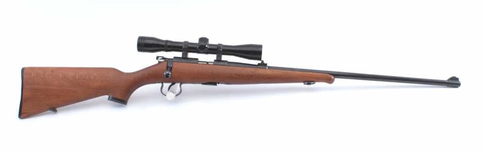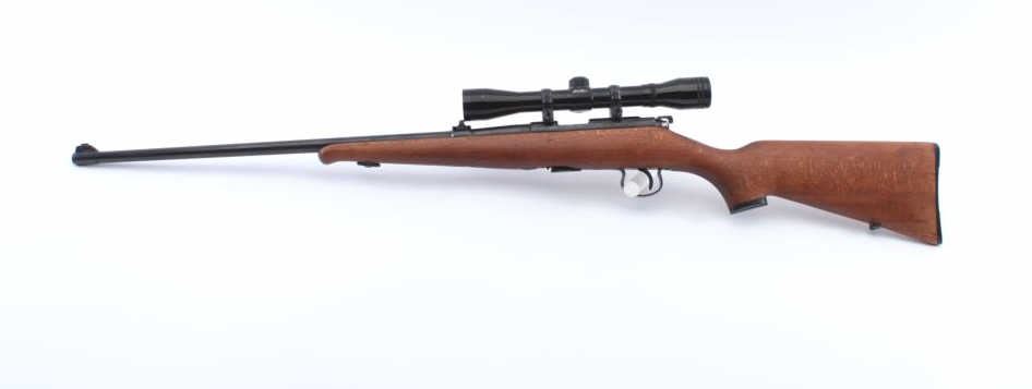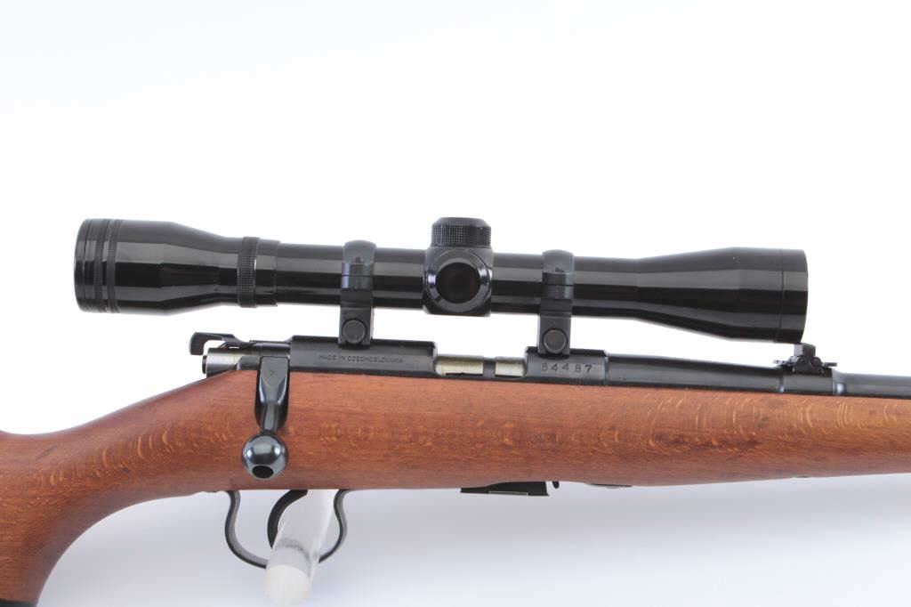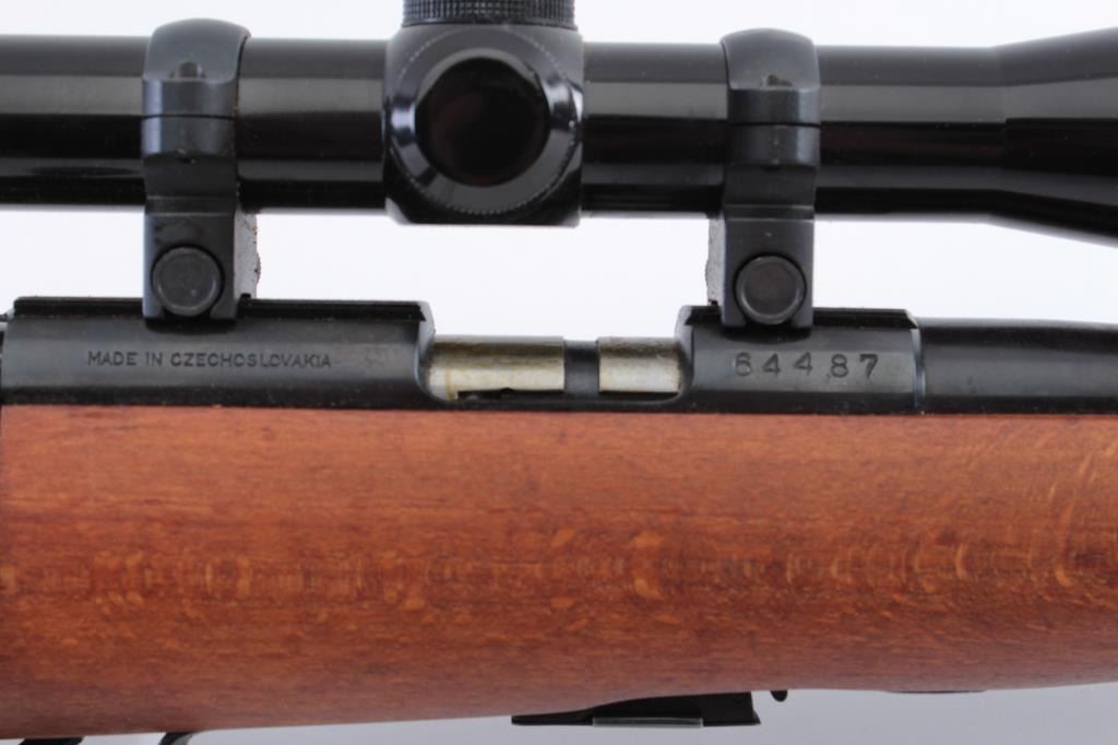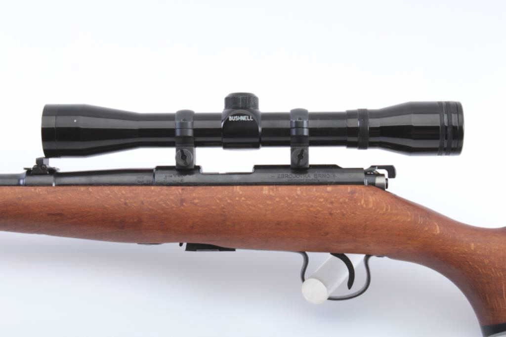 Czech Bruno Model 1 bolt action rifle, .22LR caliber, 23” barrel, blued finish, wood stock, S/N 64487, mounted with a Bushnell scope displaying sharp optics; overall very good to fine condition with majority of blued finish present, very good + bore, crisp action, sharp markings and fione stock. (Modern). Est.: $175-$350.