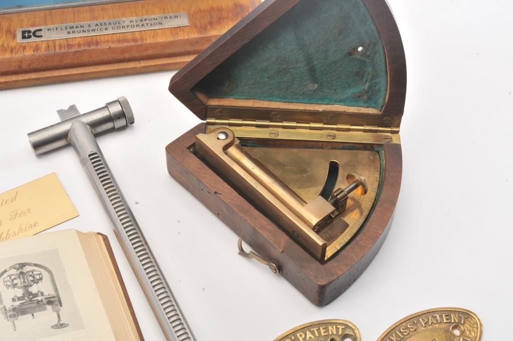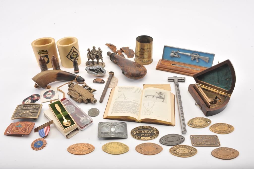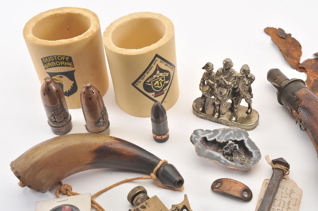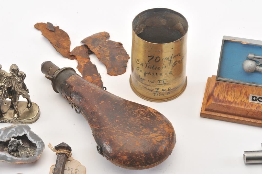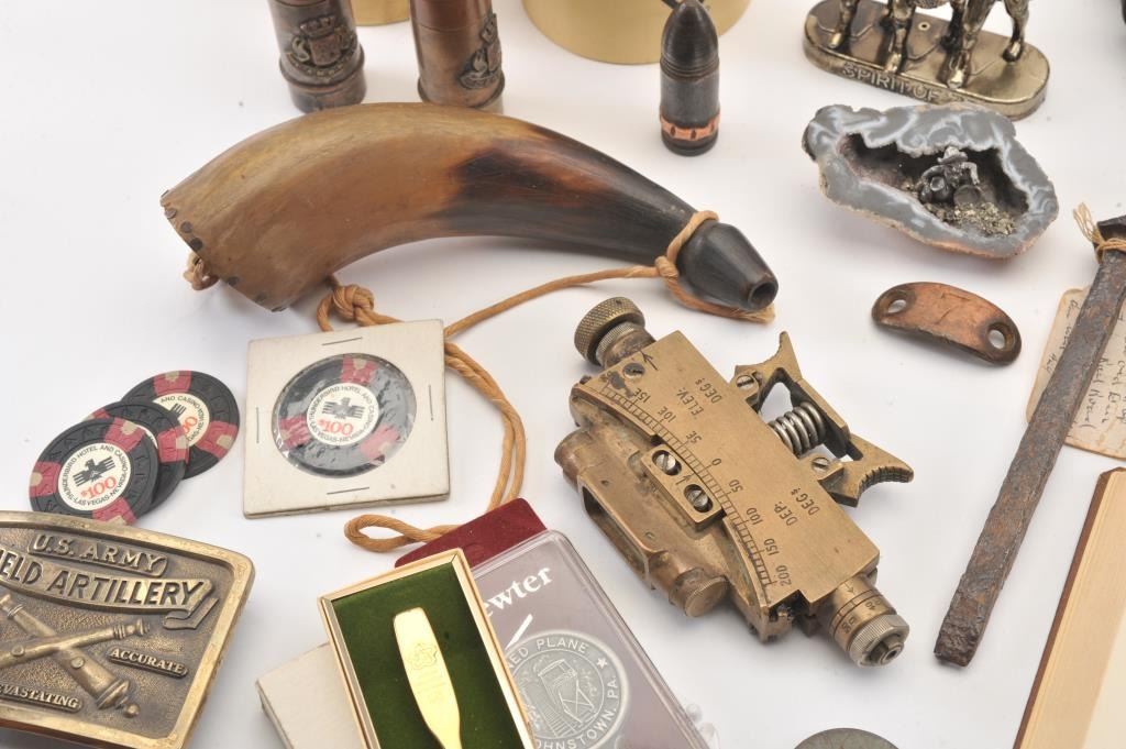 Lot of collectible smalls from an Apple Valley, CA. estate including a WW II brass Mark IV sight, a German-made brass sighting device in wood box, misc. military collectibles, an old powder flask, a smallpowder horn and more! Est.: $150-$300.