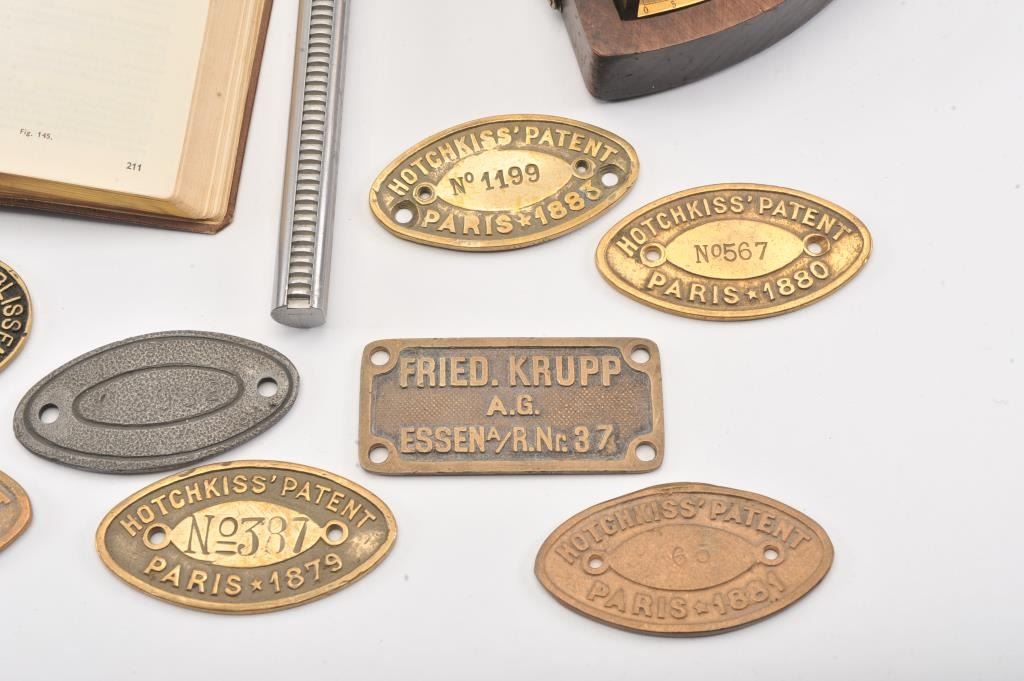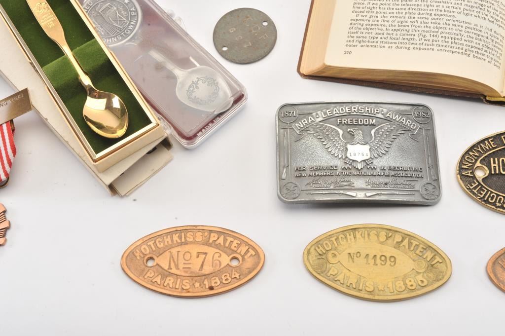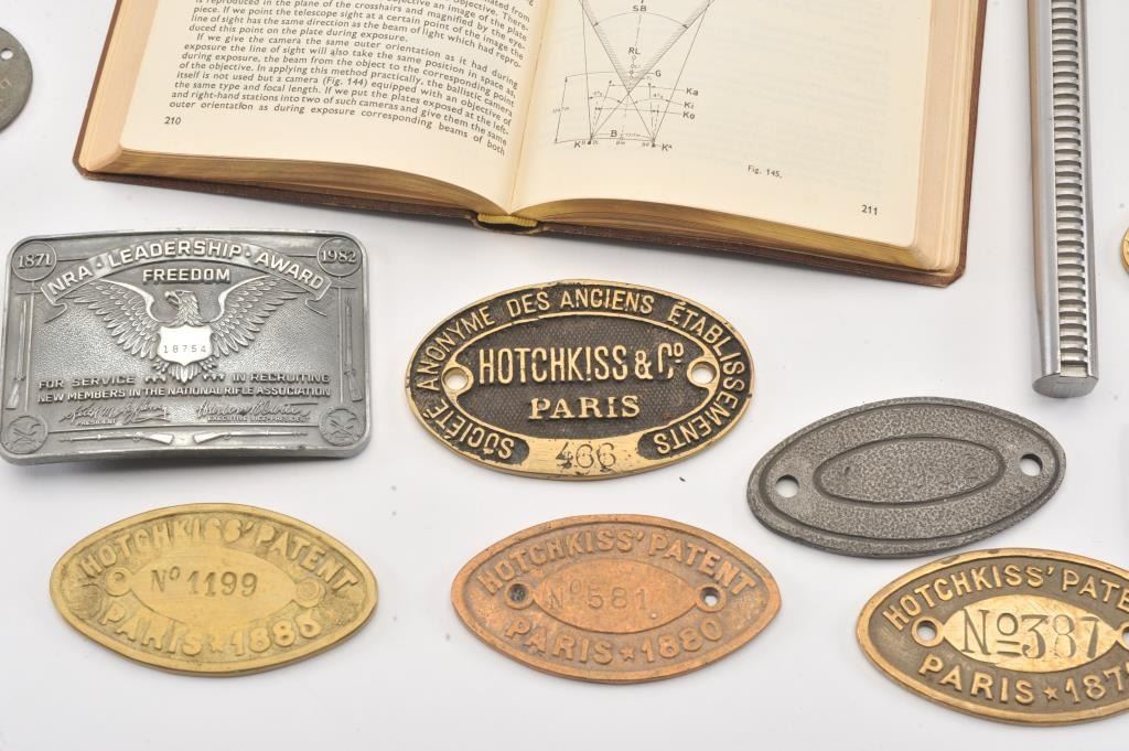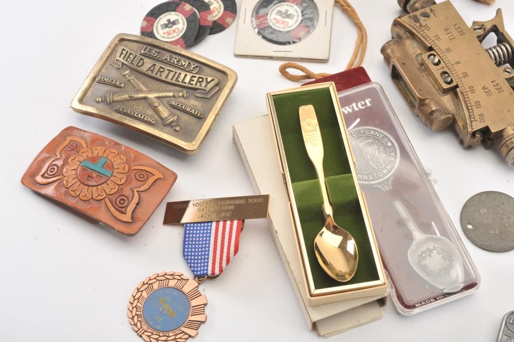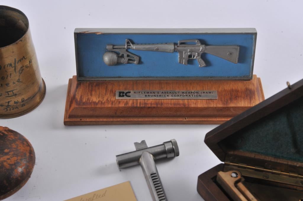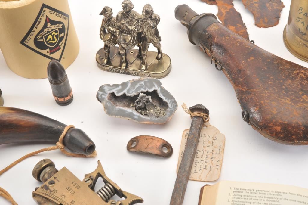 Lot of collectible smalls from an Apple Valley, CA. estate including a WW II brass Mark IV sight, a German-made brass sighting device in wood box, misc. military collectibles, an old powder flask, a smallpowder horn and more! Est.: $150-$300.
