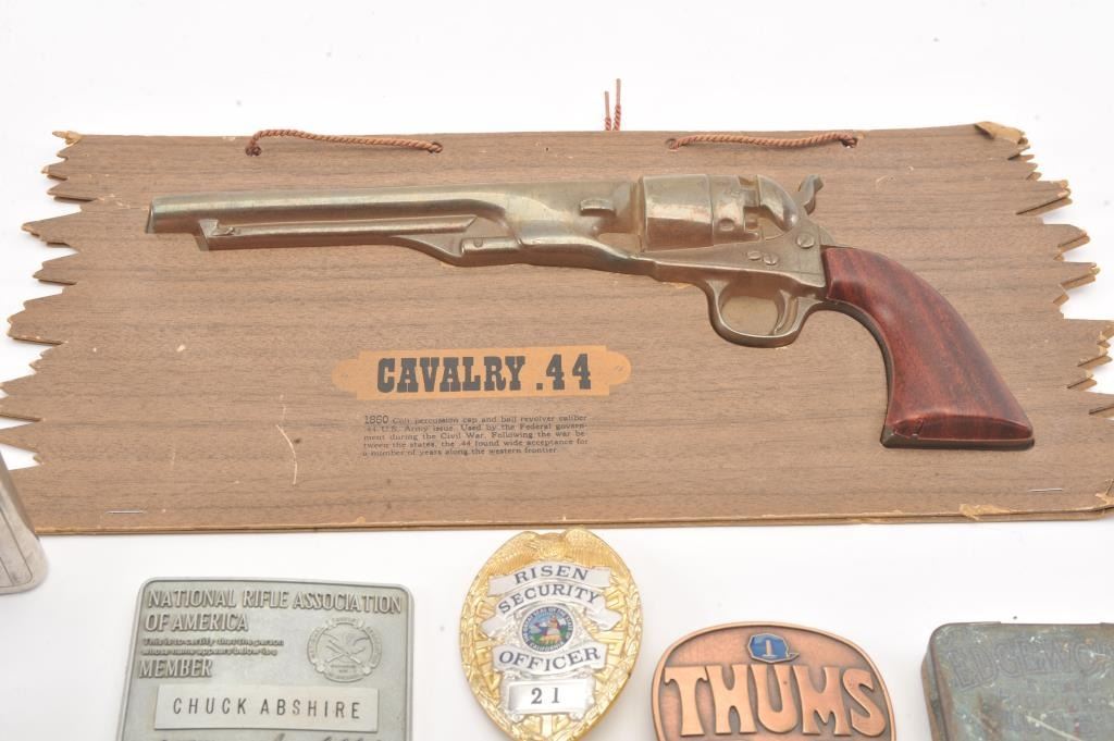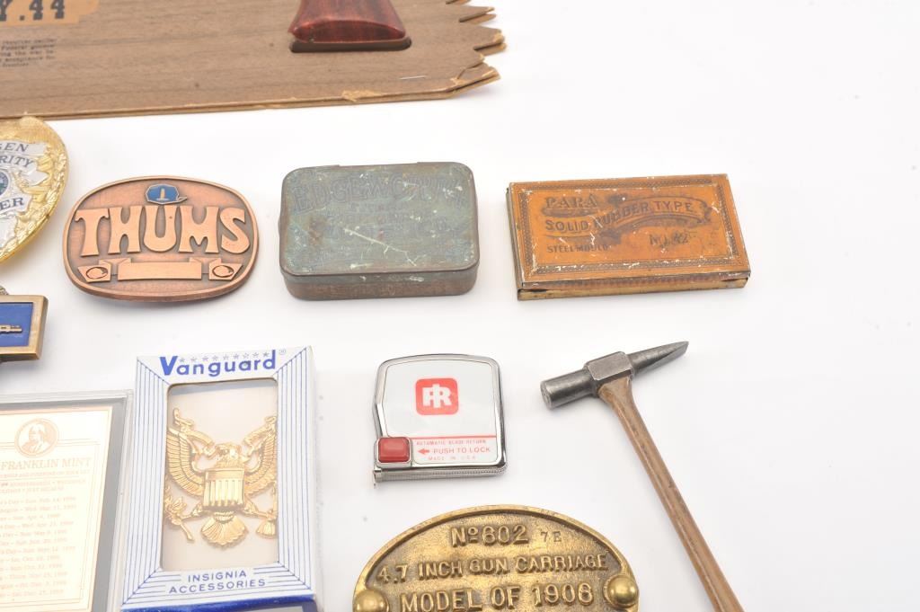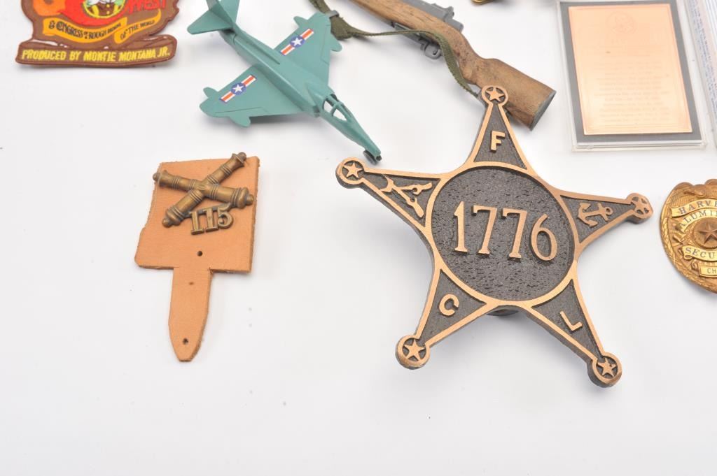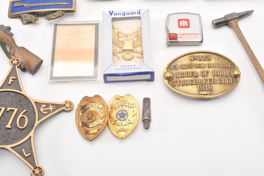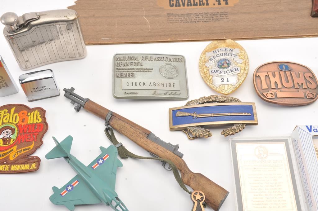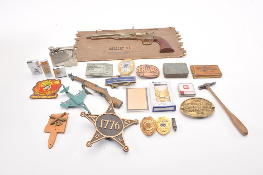 Lot of smalls including U.S. military-related items, Vietnam-era lighters, misc. Security guard badges, etc. Est.: $150-$300.