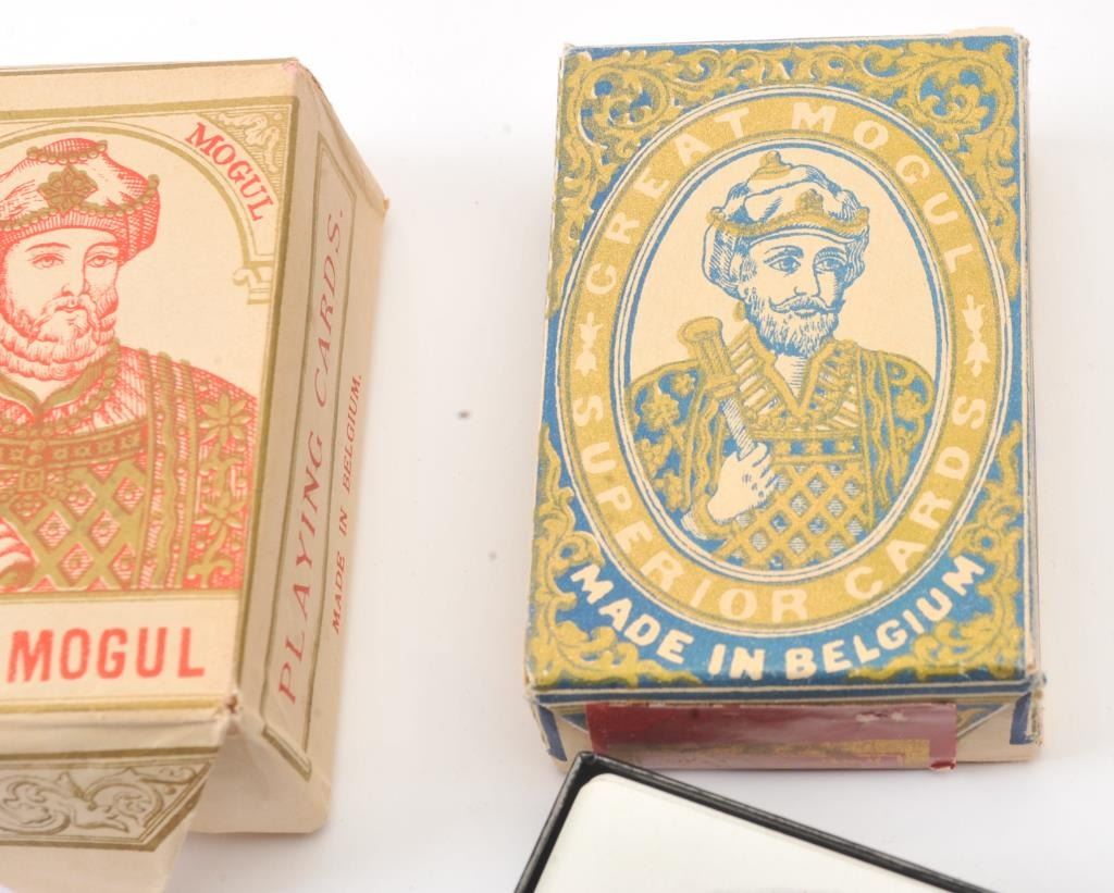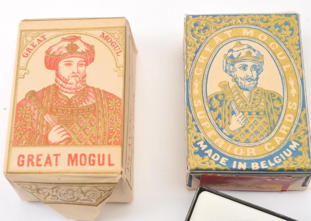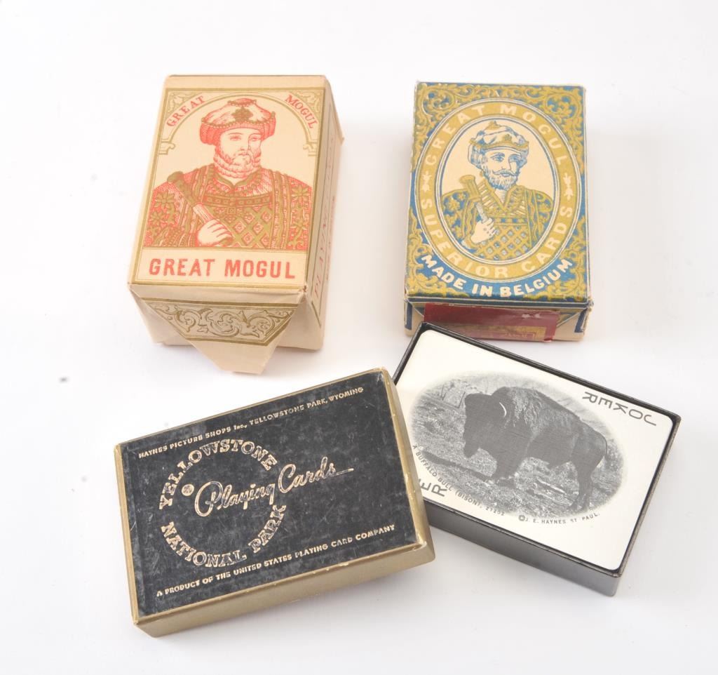 Lot of three vintage decks of playing cards; two Great Mogul Brands in original paper wraps and one Yellowstone National Park deck in original cardboard box; all in beautiful condition. Est.: $75-$125.