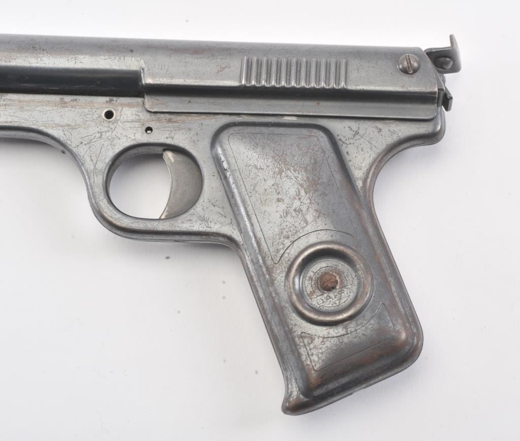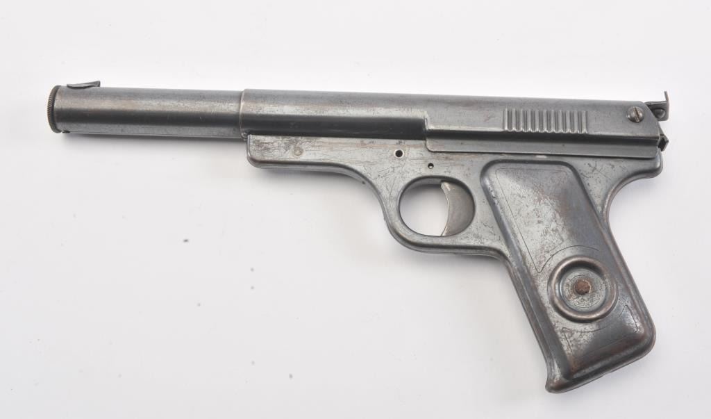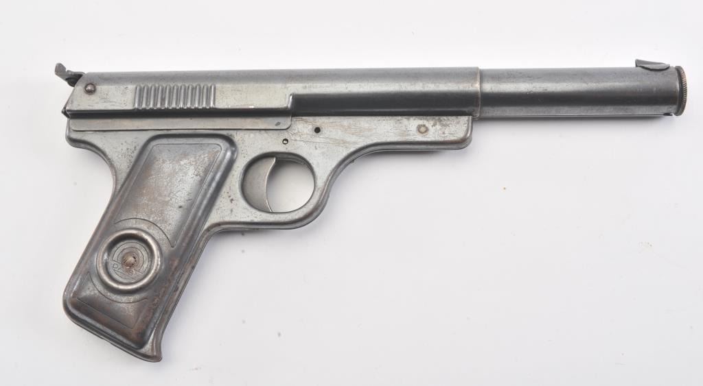 Daisy No. 118 Target Special air pistol, .118 caliber, Serial #NSNV. The pistol is in very good overall condition with an adjustable rear sight. Made of pressed, blued steel the air pistol fired the .118caliber BB for indoor shooting. This example retains significant thinning blue finish. Est.: $75-$150.