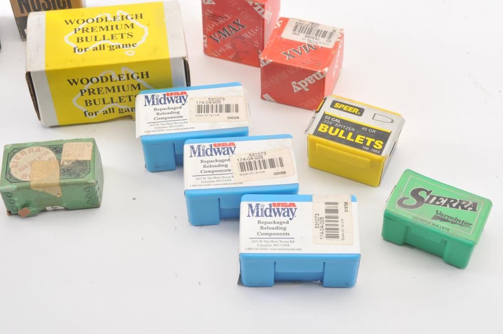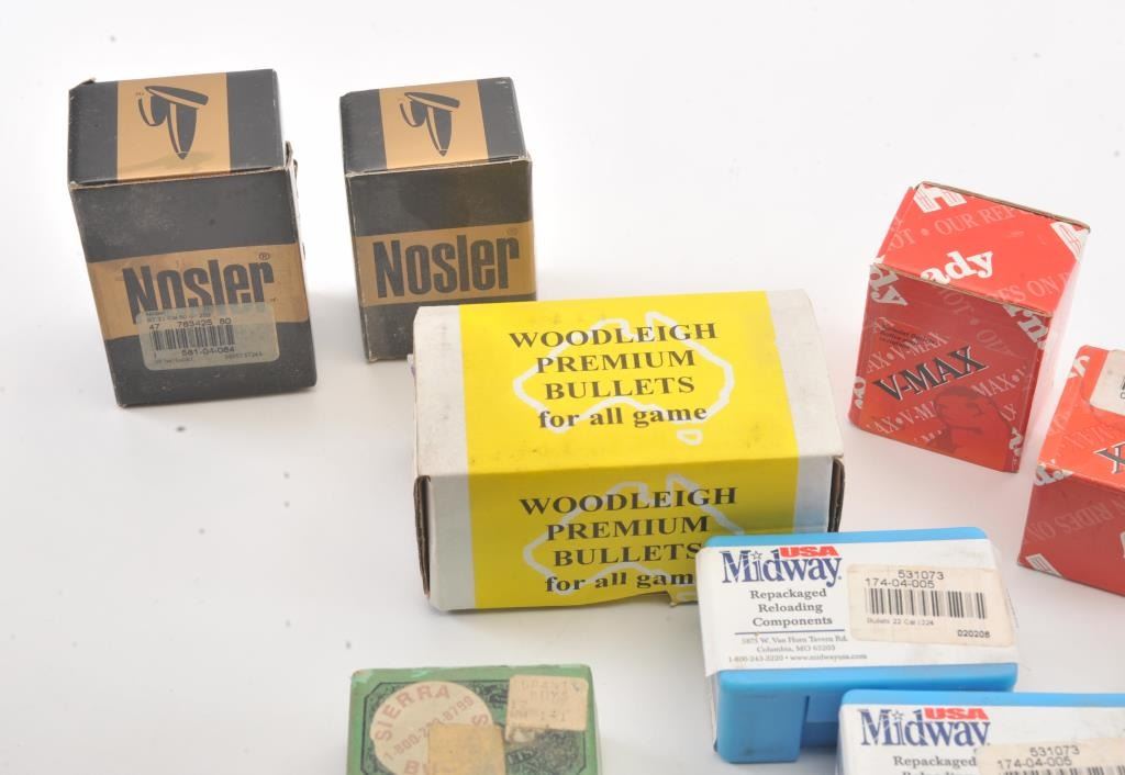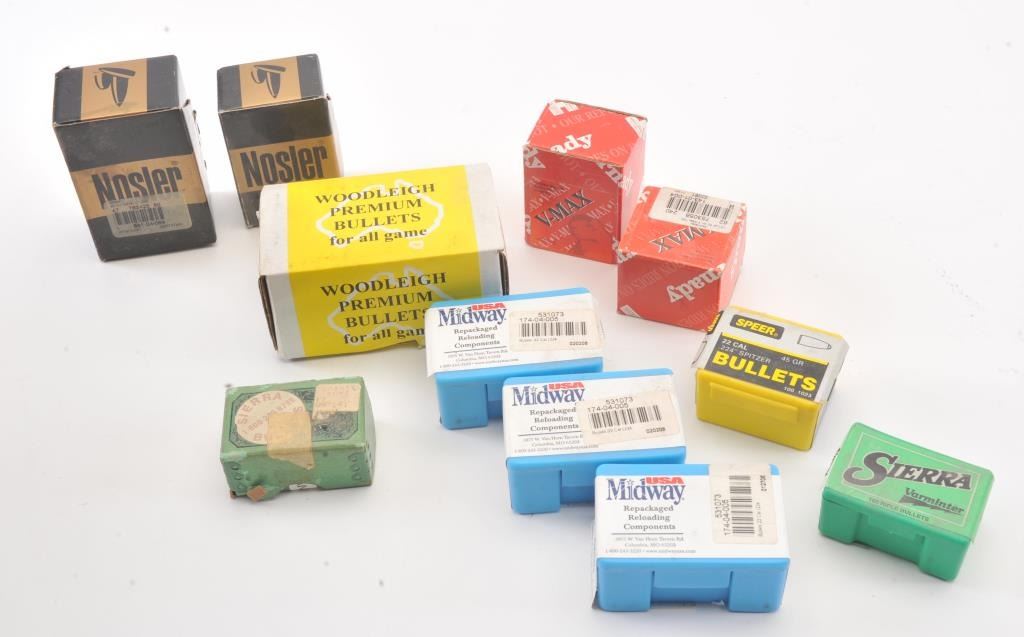 Assorted lot of .22 caliber bullets including soft points, ballistic tips and target projectiles. The lot includes approximately 800 bullets by various makers including: Nosler, Hornady, Speer, Sierra and others.Est.: $100-$200.