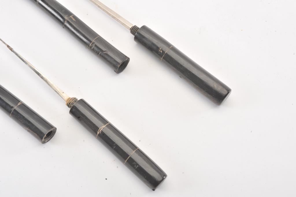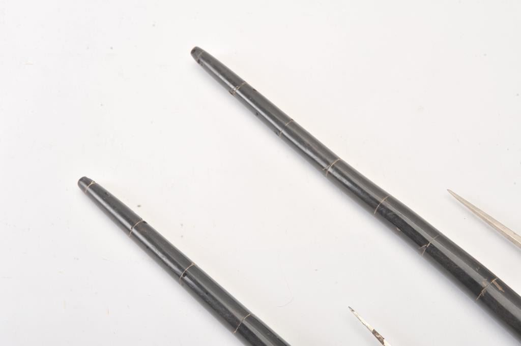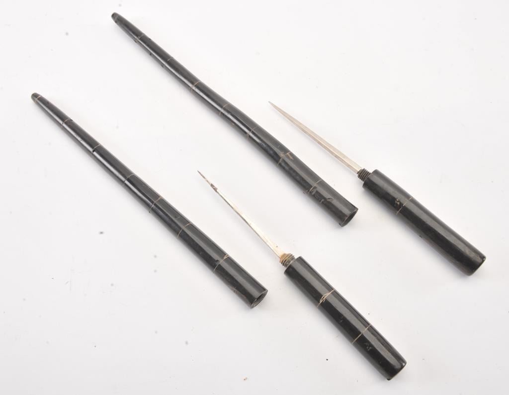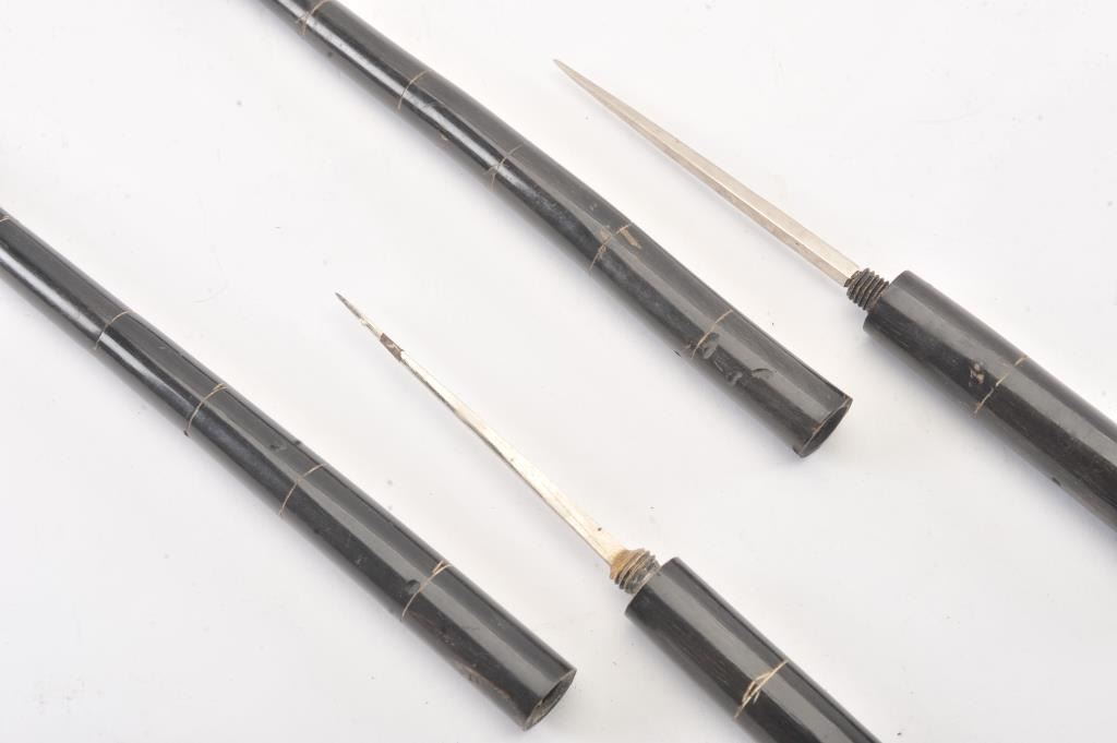 Lot of two horn swagger sticks with concealed spikes form the Indian Colonial era. The sticks are in good overall condition. Est.: $50-$100.
