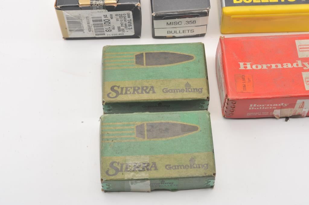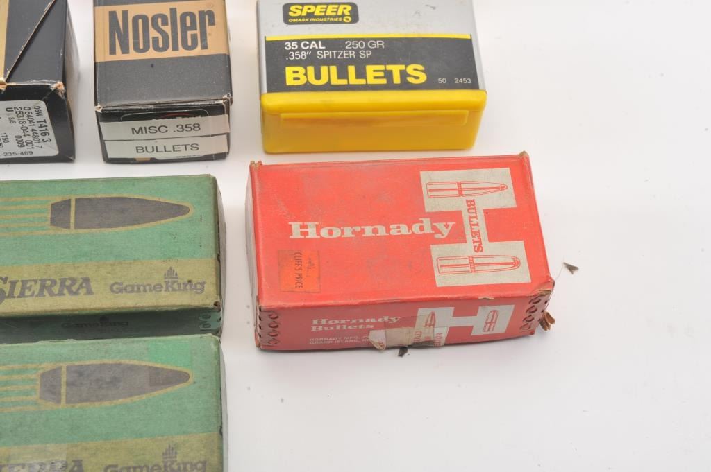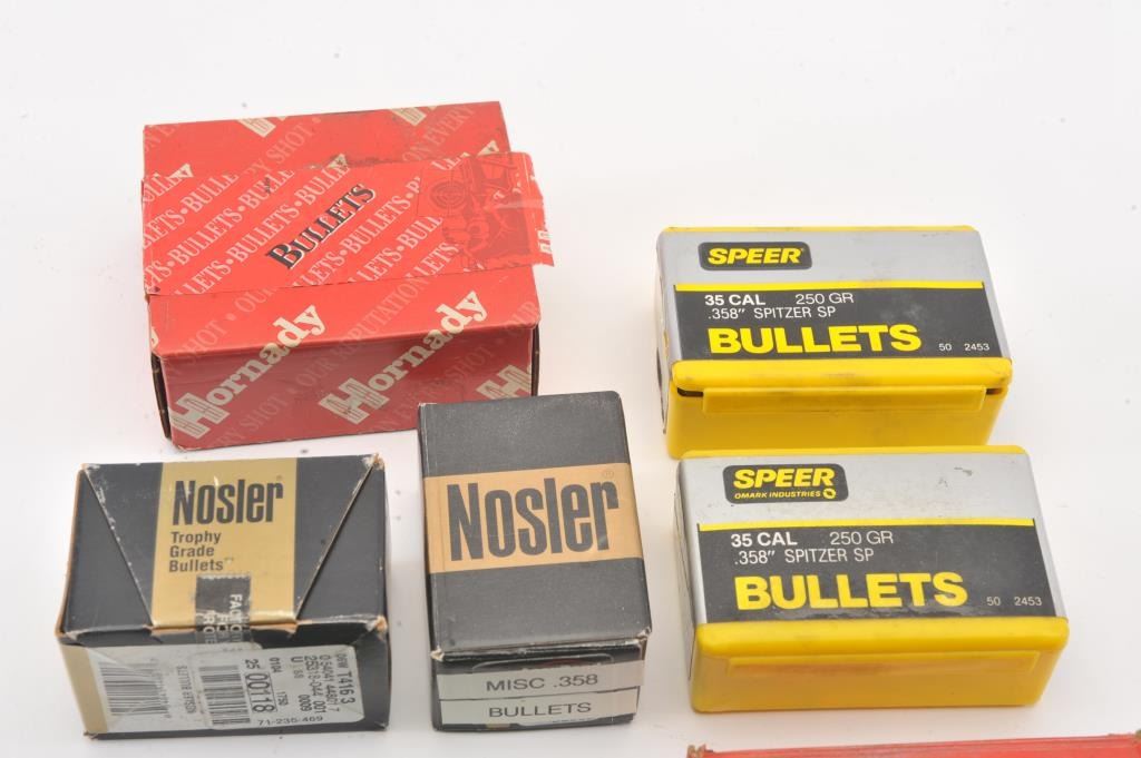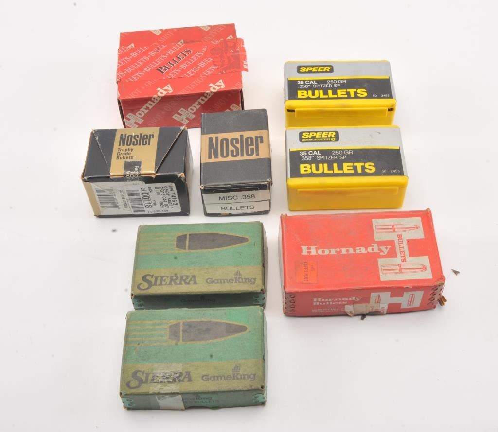 Assorted lot of .35 caliber bullets including soft points, ballistic tips and boat tail target bullets. A portion have been moly-coated by the consignor. The lot includes approximately 450 bullets by various makers including: Nosler, Hornady, Speer, Sierra and others. Est.: $100-$200.