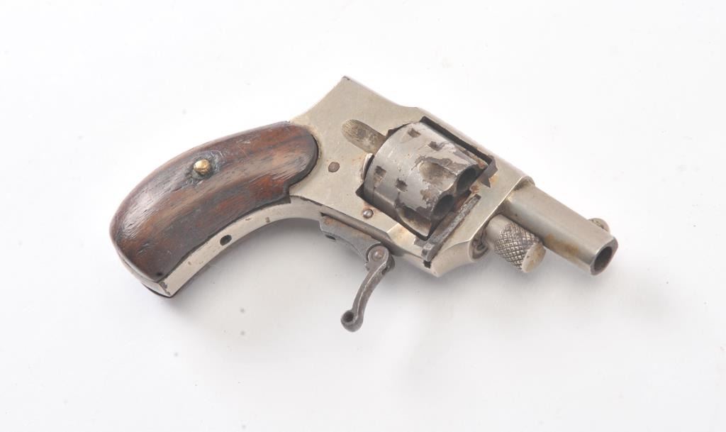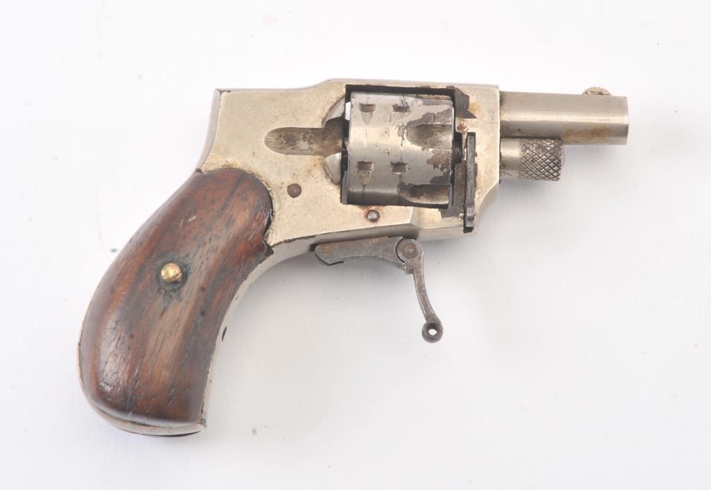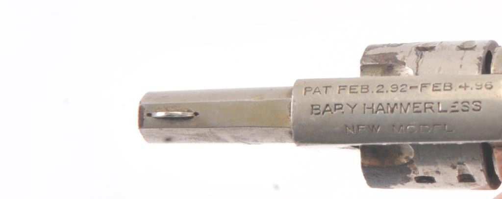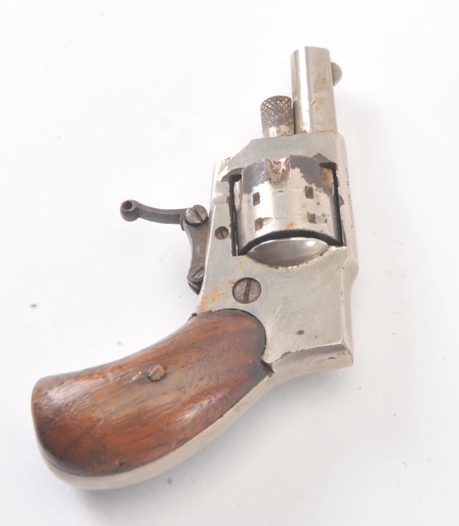 Baby Hammerless diminutive folding trigger revolver, .22 caliber, 1.25” barrel, nickel finish, wood grips, no visible S/N; overall good condition showing majority of frosty nickel finish, good action, good markings and good grips. (Antique). Est.: $80-$160.