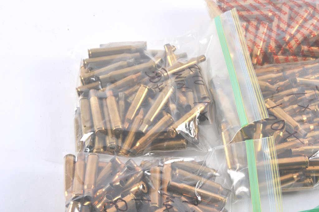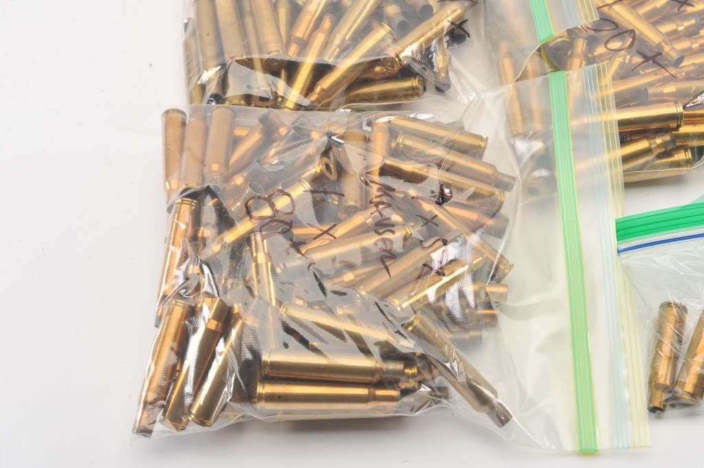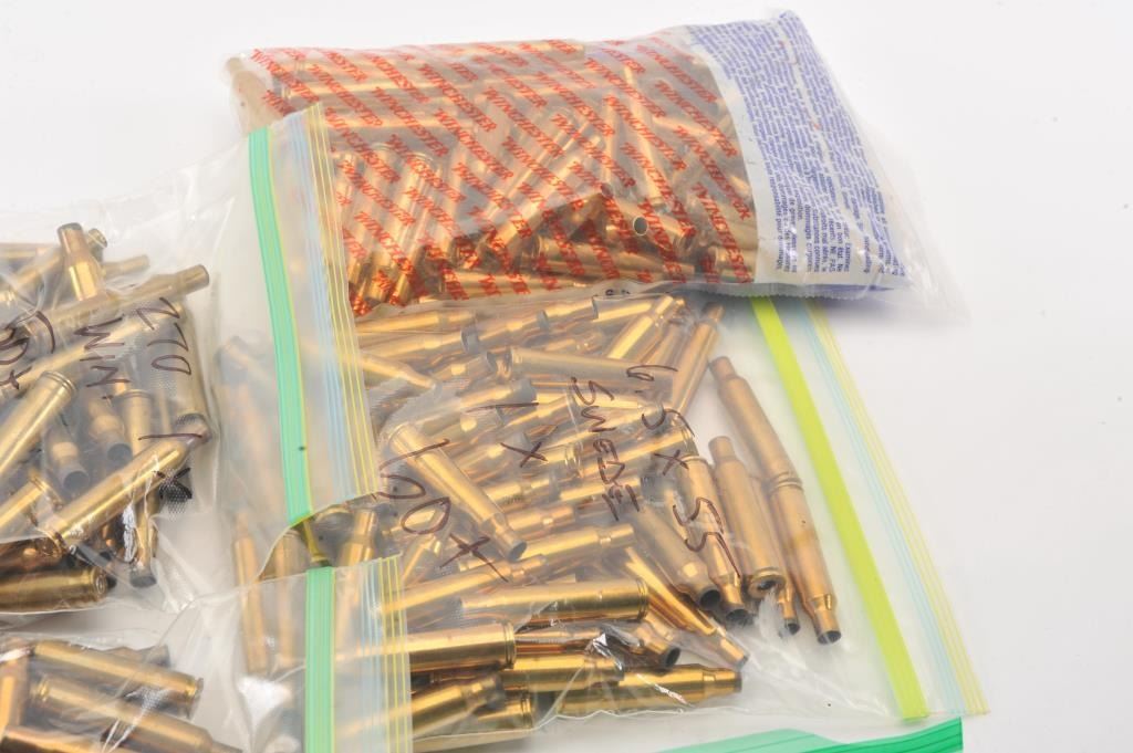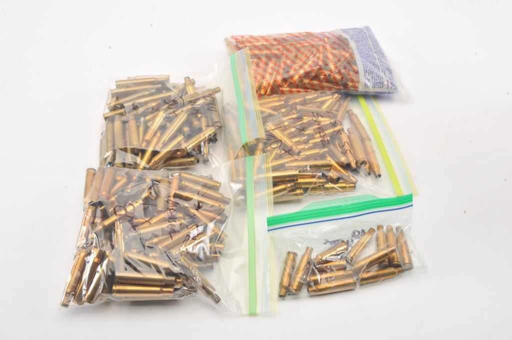 Lot of assorted rifle brass including .220 Swift, .270 Winchester, 6.5 x 55 Swede, 7 x 57 Mauser and .250 Savage. The .220 Swift is brand new Winchester, the remainder is once fired with mixed head stamps includingWinchester, Remington and PMC, approximately 300 pieces total. Est.: $100-$200.