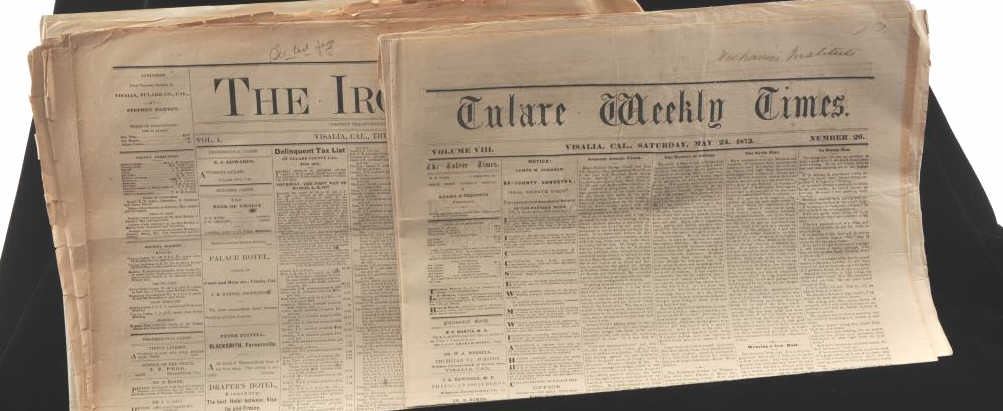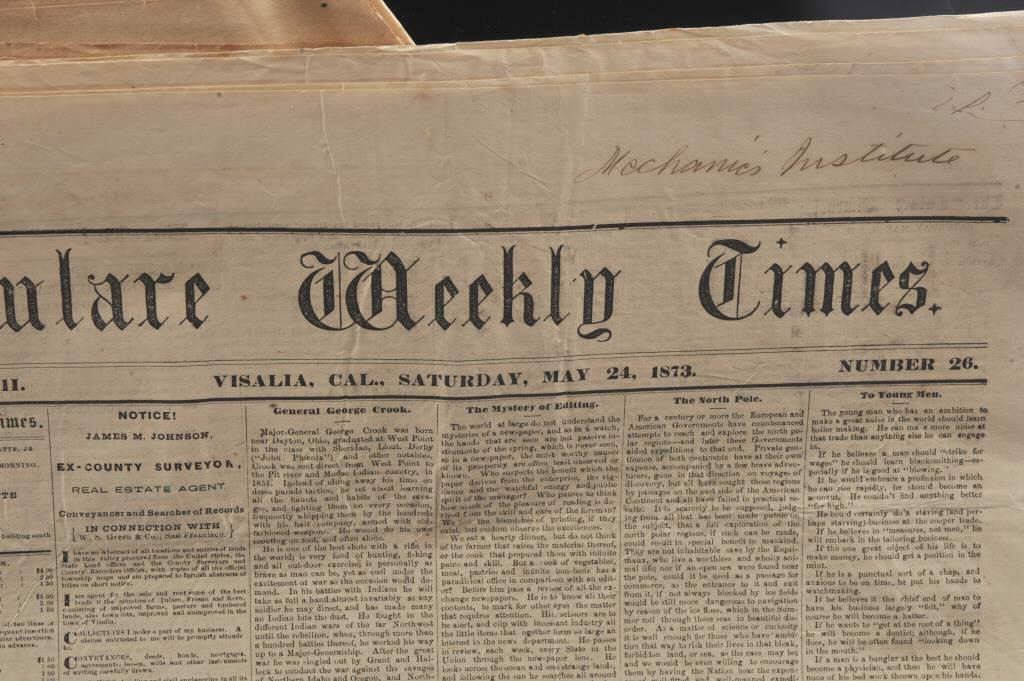 Lot of 19th Century newspapers including two copies each of the Tulare Weekly Times dated 1873, The Iron Age dated 1877 and The Oakland Daily Transcript circa 1876. All six editions are in good overall condition withsome foxing and edge wear noted. A fine collection of 19th Century news print from the Central Valley with Visalia, Tulare and Oakland represented. Est.: $50-$100.