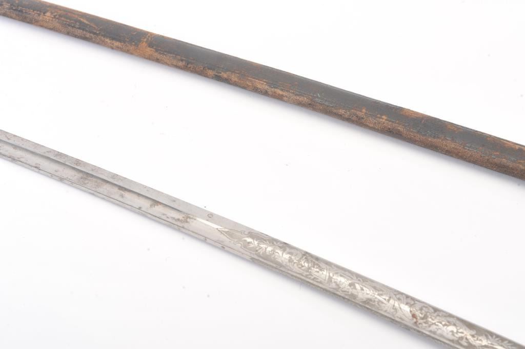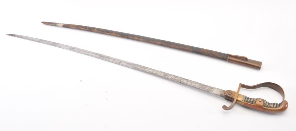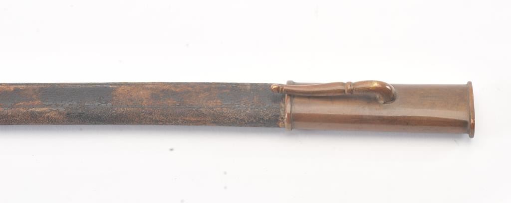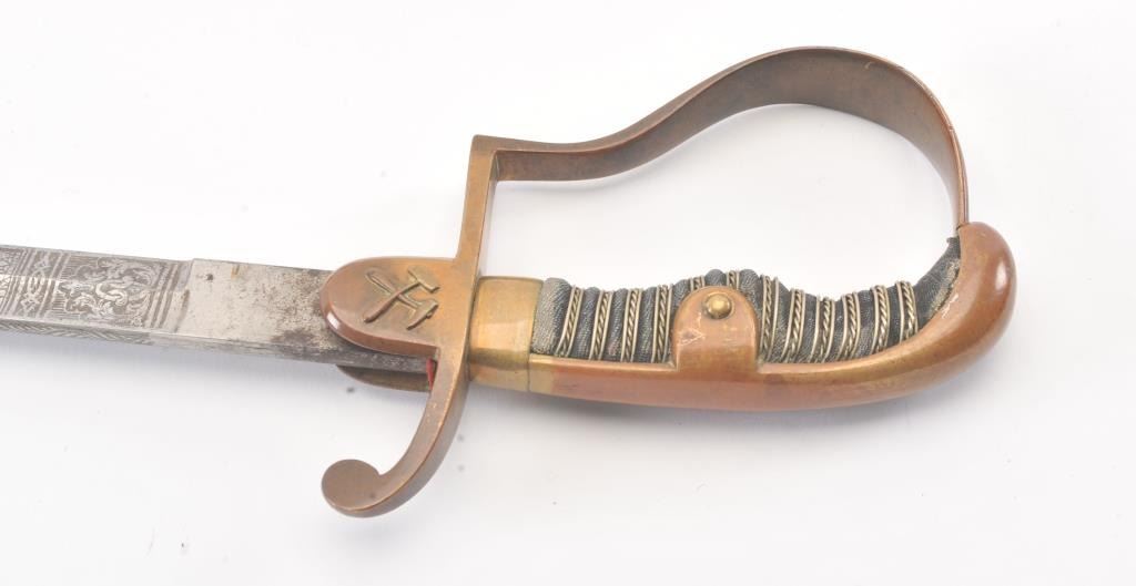German miner’s sword Imperial. Stamped “MOHR & SPETER//BERLIN. Slightly curved 34½” long blade is triple acid etched, with panoply of arms and floral leaf motifs on both sides of nickeled blade. The spine is partiallyhalf-etched with floral design. Plain dove-head P-shaped brass guard with slightly worn sharkskin covered grip and triple wire wrap. Mining hammers are on the obverse languet. Leather covered scabbard retainsonly the throat fitting with frog. Chape is missing. The leather is split near the tip and partially taped. Overall 39¼”. Est.: $200-$400
