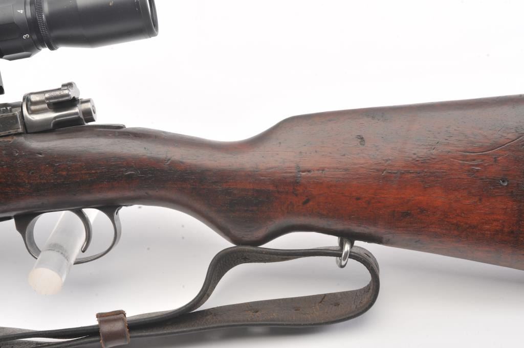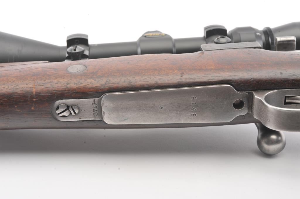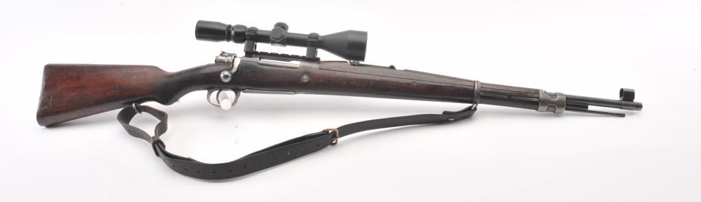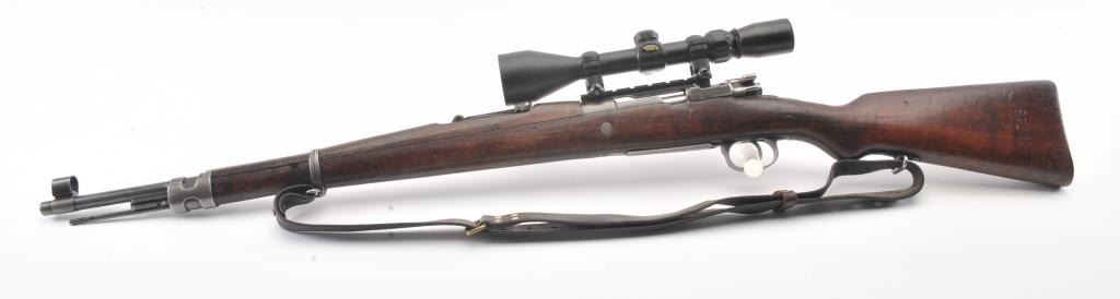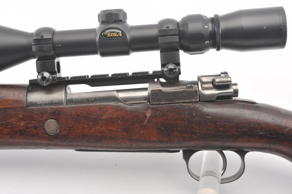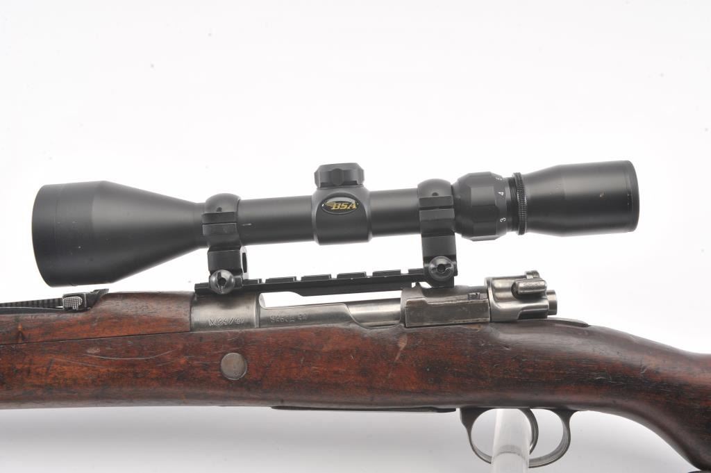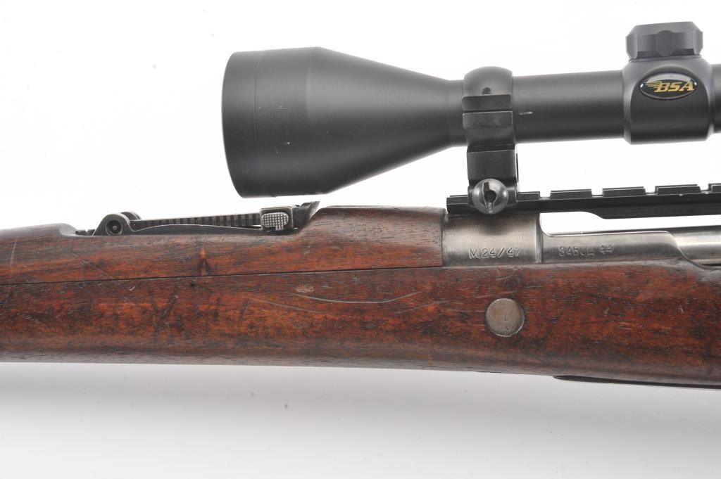 Hungarian Mauser Model M24/47 bolt action rifle, 8 x 57 caliber, Serial #E6716. The rifle is in good overall condition with a 24” barrel. The metal surfaces retain a significant amount of the military finishwith all matching visible serial numbers, including the butt stock. The smooth wood stock includes ramrod and sling swivels. The wood shows heavy use with mars, dents and an old coat of varnish. The butt stock endswith a smooth steel butt plate and a period leather sling has been added. The rifle is topped with a 3 x 9 x 50 BSA rifle scope. The bore is fair, the action is crisp and the markings are sharp. Est.: $250-$500.(C+R).