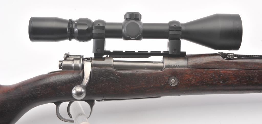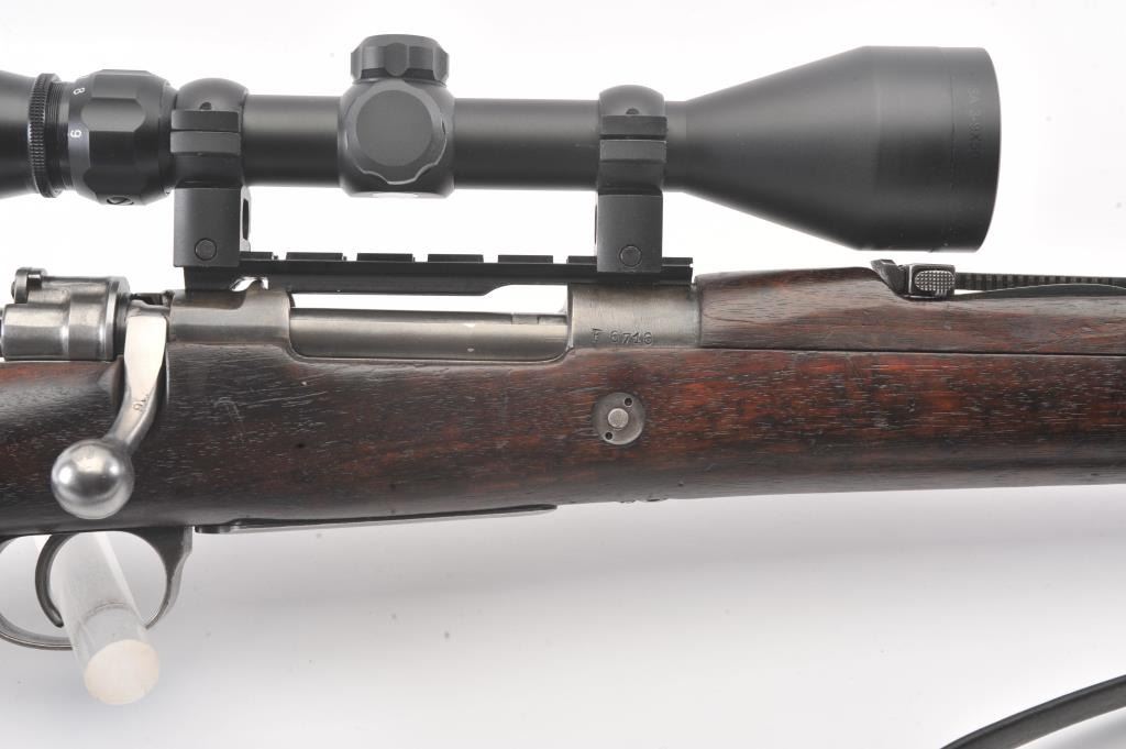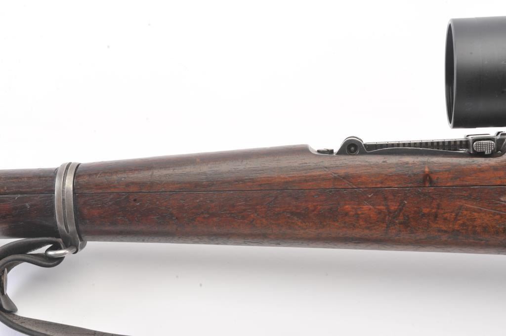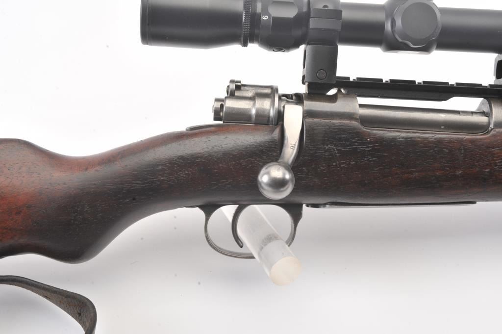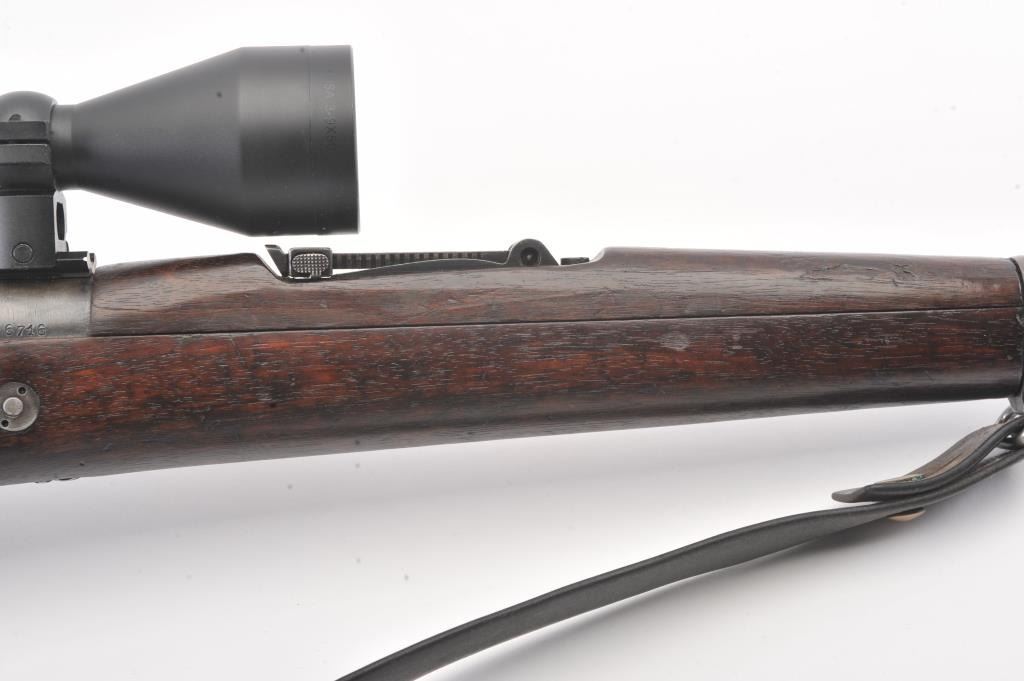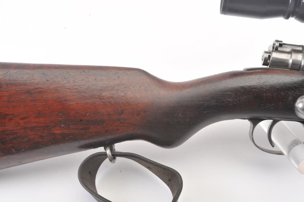 Hungarian Mauser Model M24/47 bolt action rifle, 8 x 57 caliber, Serial #E6716. The rifle is in good overall condition with a 24” barrel. The metal surfaces retain a significant amount of the military finishwith all matching visible serial numbers, including the butt stock. The smooth wood stock includes ramrod and sling swivels. The wood shows heavy use with mars, dents and an old coat of varnish. The butt stock endswith a smooth steel butt plate and a period leather sling has been added. The rifle is topped with a 3 x 9 x 50 BSA rifle scope. The bore is fair, the action is crisp and the markings are sharp. Est.: $250-$500.(C+R).